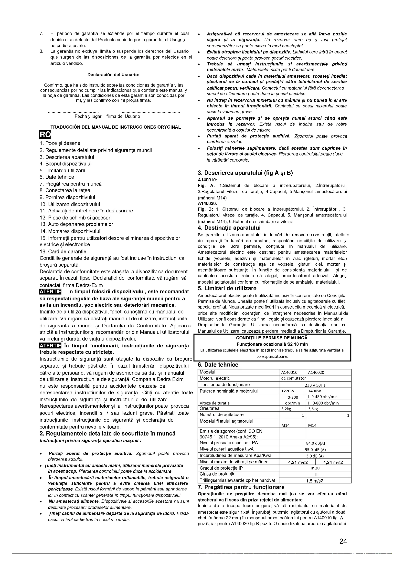 Modelul A140010 A140020 Motorul electric de comutator Tensiunea de funcţionare 230 V 50Hz Puterea nominală a motorului 1220W 1400W Viteze de turaţie 0-800 obr/min I: 0-480 obr/min II: 0-800 obr/min Greutatea 3,2kg 3,6kg Numărul de agitatoare