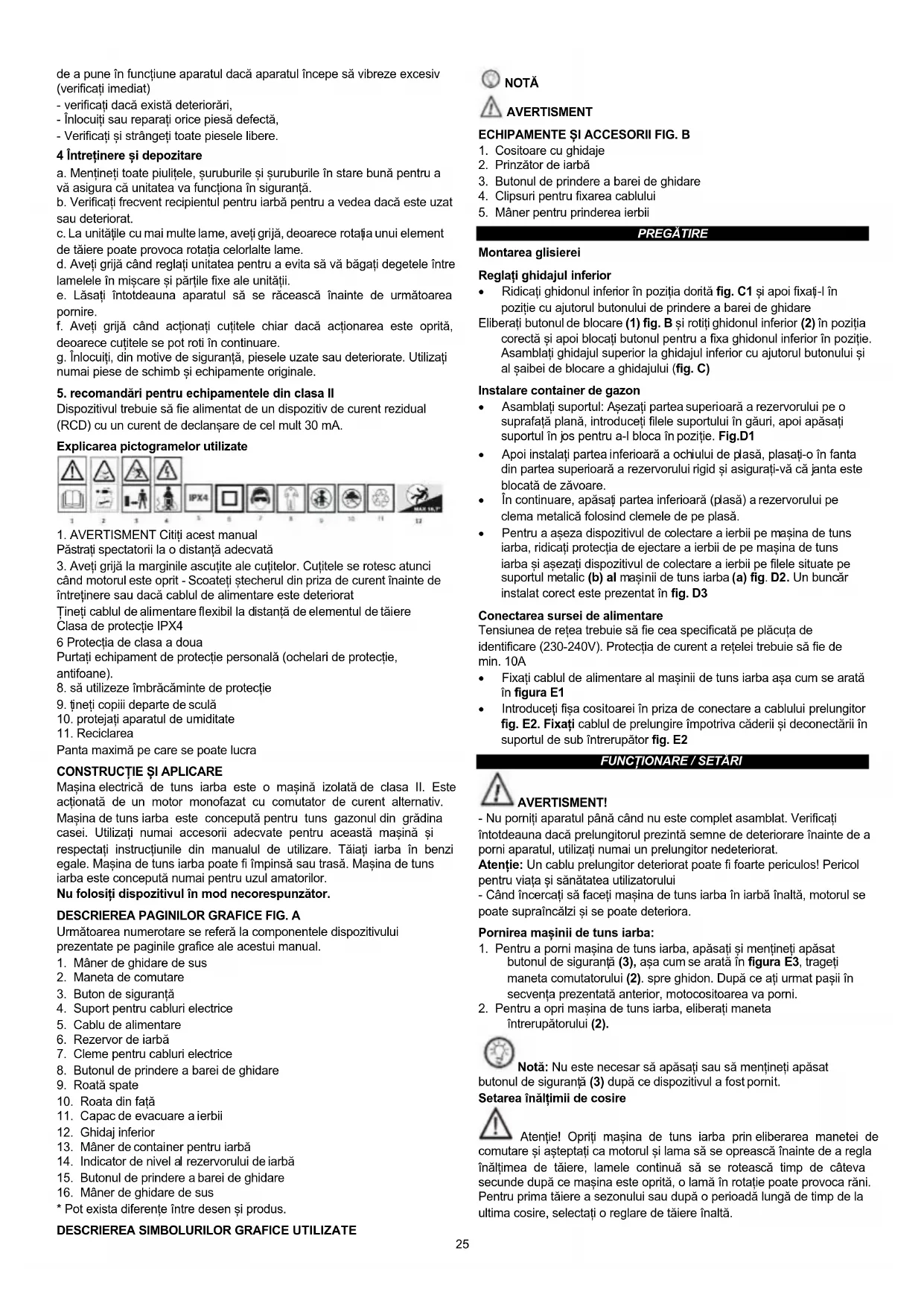 Mașina electrică de tuns iarba este o mașină izolată de clasa II. Este acționată de un motor monofazat cu comutator de curent alternativ. Mașina de tuns iarba este concepută pentru tuns gazonul din grădina casei. Utilizați numai accesorii adecvate pentru această mașină și respectați instrucțiunile din manualul de utilizare. Tăiați iarba în benzi egale. Mașina de tuns iarba poate fi împinsă sau trasă. Mașina de tuns iarba este concepută numai pentru uzul amatorilor. Nu folosiți dispozitivul în mod necorespunzător.