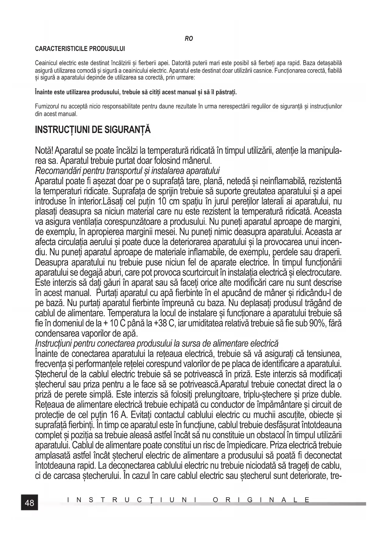 CARACTERISTICILE PRODUSULUI Ceainicul electric este destinat încălzirii și fi erberii apei. Datorită puterii mari este posibil să fi erbeți apa rapid. Baza detașabilă asigură utilizarea comodă și sigură a ceainicului electric. Aparatul este destinat doar utilizării casnice. Funcționarea corectă, fi abilă și sigură a aparatului depinde de utilizarea sa corectă, prin urmare: Înainte este utilizarea produsului, trebuie să citiți acest manual și să îl păstrați. Furnizorul nu acceptă nicio responsabilitate pentru daune rezultate în urma nerespectării regulilor de siguranță și instrucțiunilor din acest manual.