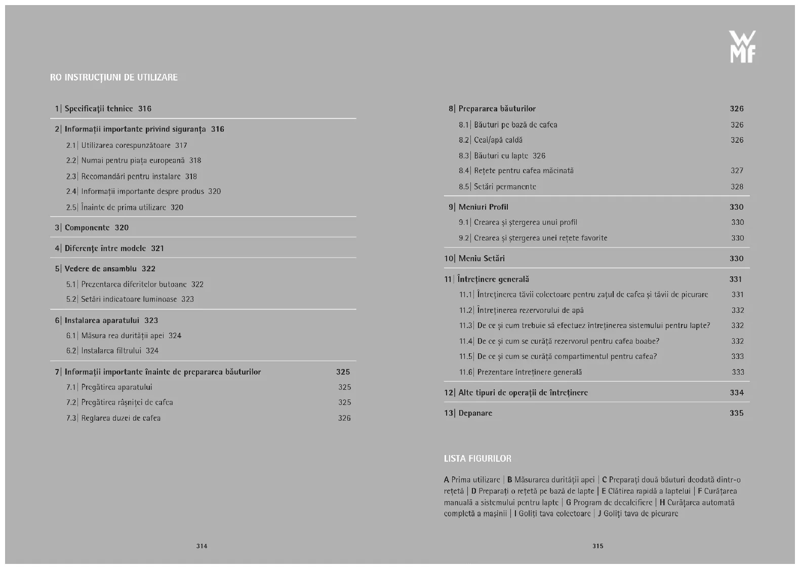8|Prepararea băuturilor 326 8.1|Băuturi pe bază de cafea 326 8.2|Ceai/apă caldă 326 8.3|Băuturi cu lapte 326 8.4|Reţete pentru cafea măcinată 327 8.5|Setări permanente 328 9|Meniuri Profil 330 9.1|Crearea și ștergerea unui profil 330 9.2|Crearea și ștergerea unei reţete favorite 330 10|Meniu Setări 330 11|Întreţinere generală 331 11.1|Întreţinerea tăvii colectoare pentru zaţul de cafea și tăvii de picurare 331 11.2|Întreţinerea rezervorului de apă 332 11.3|De ce și cum trebuie să efectuez întreţinerea sistemului pentru lapte? 332 11.4|De ce și cum se curăţă rezervorul pentru cafea boabe? 332 11.5|De ce și cum se curăţă compartimentul pentru cafea? 333 11.6|Prezentare întreţinere generală 333 12|Alte tipuri de operaţii de întreţinere 334 13|Depanare 335 LISTA FIGURILOR A Prima utilizare| B Măsurarea durităţii apei| C Preparaţi două băuturi deodată dintr-o reţetă| D Preparaţi o reţetă pe bază de lapte| E Clătirea rapidă a laptelui| FCurăţarea manuală a sistemului pentru lapte| G Program de decalcifiere| HCurăţarea automată completă a mașinii | I Goliţi tava colectoare | J Goliţi tava de picurare