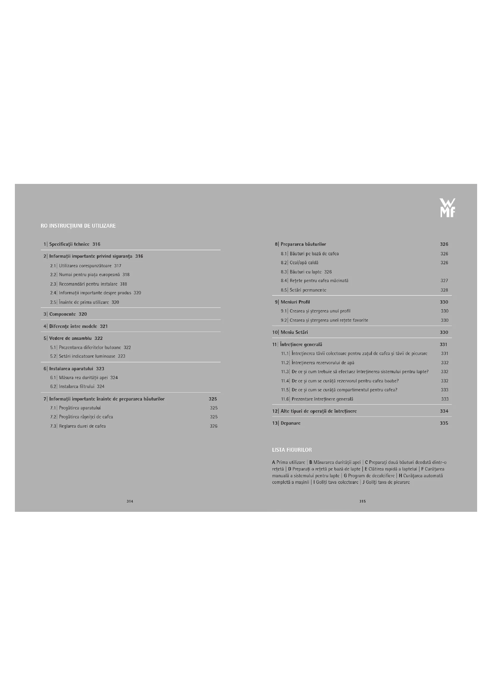 8|Prepararea băuturilor 326 8.1|Băuturi pe bază de cafea 326 8.2|Ceai/apă caldă 326 8.3|Băuturi cu lapte 326 8.4|Reţete pentru cafea măcinată 327 8.5|Setări permanente 328 9|Meniuri Profil 330 9.1|Crearea și ștergerea unui profil 330 9.2|Crearea și ștergerea unei reţete favorite 330 10|Meniu Setări 330 11|Întreţinere generală 331 11.1|Întreţinerea tăvii colectoare pentru zaţul de cafea și tăvii de picurare 331 11.2|Întreţinerea rezervorului de apă 332 11.3|De ce și cum trebuie să efectuez întreţinerea sistemului pentru lapte? 332 11.4|De ce și cum se curăţă rezervorul pentru cafea boabe? 332 11.5|De ce și cum se curăţă compartimentul pentru cafea? 333 11.6|Prezentare întreţinere generală 333 12|Alte tipuri de operaţii de întreţinere 334 13|Depanare 335 LISTA FIGURILOR A Prima utilizare| B Măsurarea durităţii apei| C Preparaţi două băuturi deodată dintr-o reţetă| D Preparaţi o reţetă pe bază de lapte| E Clătirea rapidă a laptelui| FCurăţarea manuală a sistemului pentru lapte| G Program de decalcifiere| HCurăţarea automată completă a mașinii | I Goliţi tava colectoare | J Goliţi tava de picurare