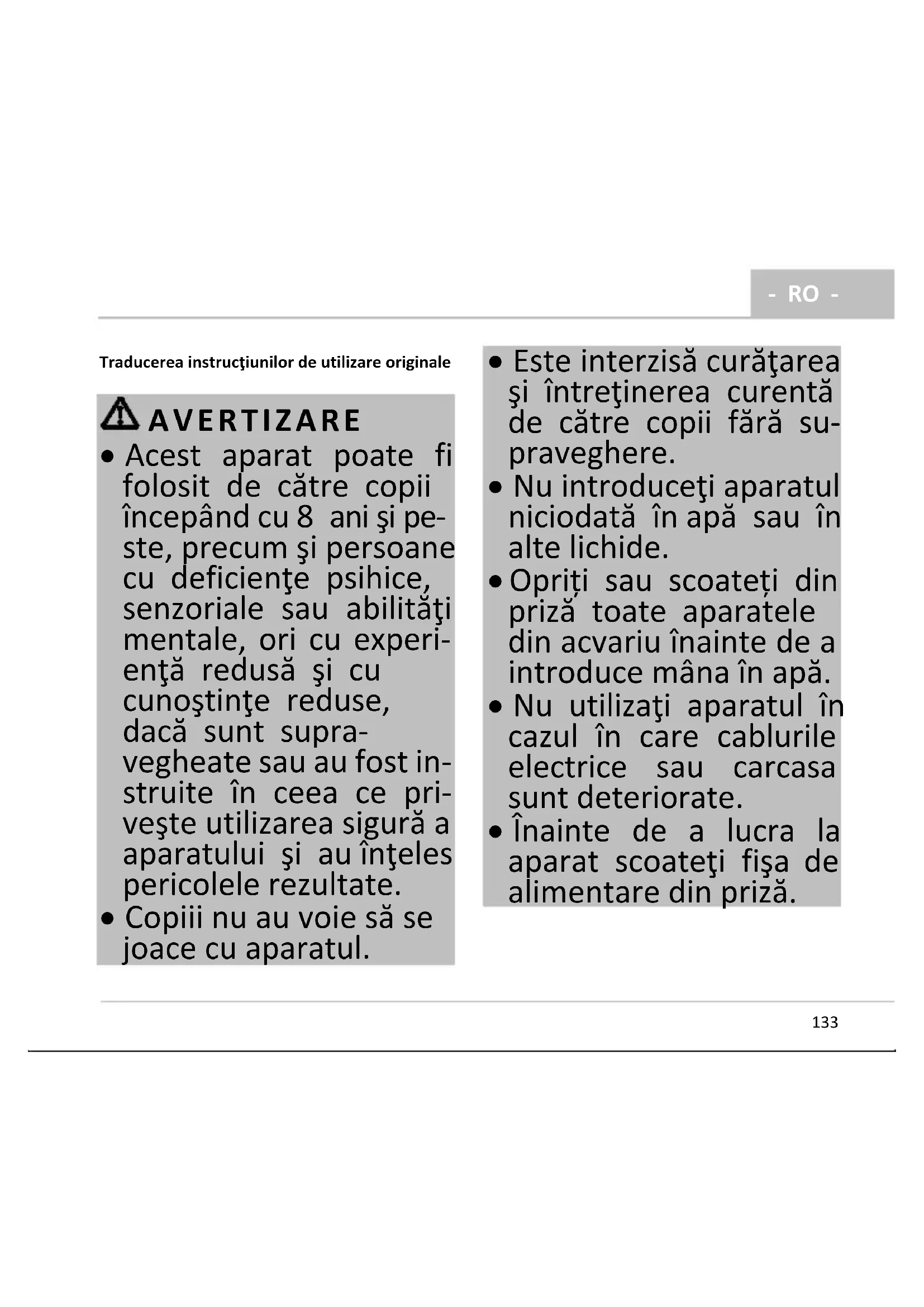 - Este interzisă curăţarea şi întreţinerea curentă de către copii fără su- praveghere.