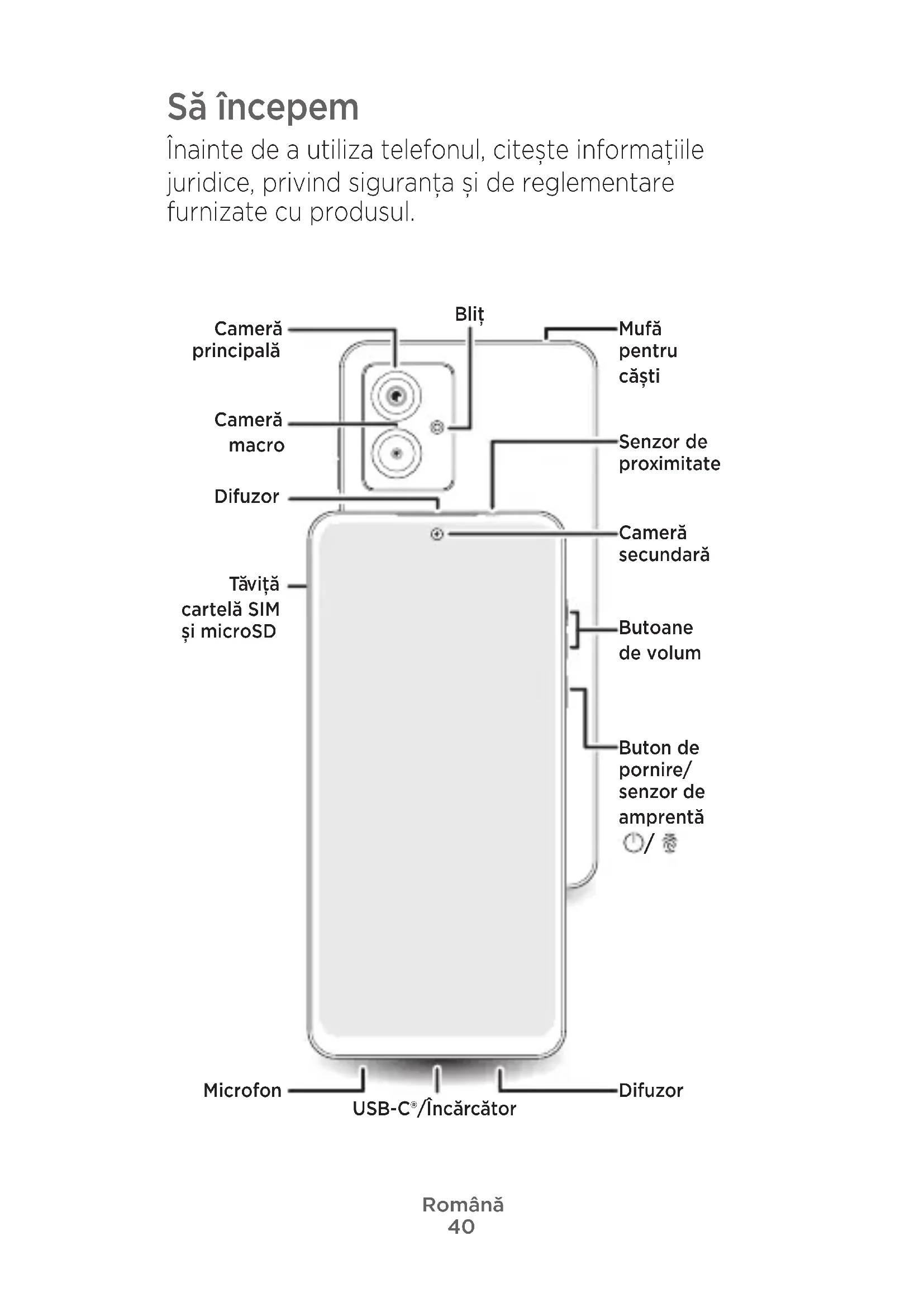 - Obține aplicații: atinge Magazin Play pentru a naviga prin și a descărca aplicații. Informații de ordin juridic. Acest ghid prezintă informații juridice importante, privind siguranța și de reglementare, pe care trebuie să le citești înainte de a utiliza produsul. Pentru informațiile de ordin juridic complete, glisează rapid în sus de pe ecranul de pornire și atinge Setări > , apoi scrie Informații de ordin juridic sau vizitează www.motorola.com/device-legal. Rezistența la apă. Telefonul tău nu este impermeabil. Pentru mai multe informații despre designul cu rezistență la apă și îngrijirea telefonului tău, glisează rapid în sus și atinge Setări> Ajutor. Siguranța bateriilor. Pentru a preveni potențialele arsuri și leziuni, bateria din telefonul tău trebuie îndepărtată doar la un centru de service aprobat de Motorola sau de specialiști cu competențe similare. Dacă telefonul nu mai răspunde la comenzi, apasă și menține apăsat butonul de pornire până când se închide ecranul, iar telefonul repornește. Încarcă-ți telefonul folosind un încărcător Motorola compatibil (poate fi comercializat separat). Utilizarea altor încărcătoare nu este recomandată și poate afecta performanța de încărcare. Nu încărca telefonul la temperaturi sub -20°C (-4°F) sau peste 45°C (113°F). Încărcătoarele care nu sunt conforme cu standardele naționale aplicabile nu prezintă siguranță, comportând risc de deces sau vătămare corporală, și pot duce la încetinirea încărcării sau deteriorarea produsului. Pentru a vedea standardele aplicabile și a afla mai multe detalii, consultă secțiunea „Informații de ordin juridic” din acest ghid sau accesează www.motorola.com/device-legal. Avertizare cu privire la intensitatea volumului sonor. Pentru a preveni posibilele vătămări ale auzului, nu asculta la niveluri ridicate de volum pentru perioade lungi de timp. Atunci când volumul căștilor atinge pragul pentru volumul ridicat, apare o avertizare. Atinge OK pentru a o opri sau așteaptă între una și cinci secunde, apoi apasă butonul de creștere a volumului pentru a opri alerta și a permite continuarea ajustării volumului. Casare și reciclare. Pentru ajutor legat de reciclarea responsabilă a produselor și ambalajelor, vizitează www.motorola.com/recycling. Temperaturile foarte ridicate sau foarte scăzute. Nu utiliza telefonul la temperaturi sub -20 °C (-4 °F) sau peste 45 °C (113 °F). Nu depozita/transporta telefonul la temperaturi sub -20°C (-4°F) sau peste 60°C (140°F). Declinări ale răspunderii legale. Caracteristicile, serviciile și aplicațiile sunt dependente de rețea și pot să nu fie disponibile în toate zonele; se pot aplica termeni/taxe suplimentare. Se consideră că specificațiile produsului și alte informații din acest ghid sunt corecte la momentul tipăririi.43 Motorola își rezervă dreptul de a corecta sau de a modifica orice informații, fără un aviz prealabil. Arbitraj. Achiziția ta este guvernată de o clauză de arbitraj cu caracter obligatoriu. Pentru mai multe informații și pentru a afla cum te poți retrage, consultă ghidul legal furnizat împreună cu telefonul. Informații SAR (pe eticheta electronică). Pentru a vizualiza valorile ratei de absorbție specifice (SAR) pentru acest telefon, glisează rapid în sus de pe ecranul de pornire și atinge Setări > , apoi scrie Informații de reglementare de pe tastatura telefonului, tastează *#07# sau accesează www.motorola.com/sar. Frecvențele și puterea acceptate (Model XT2341-3, XT2341-4). Acest telefon poate funcționa la următoarele frecvențe, sub rezerva locației și disponibilității rețelei. Mod de funcționare Gama de frecvențe în MHz/Bandă Putere de transmisie nominală maximă în dBm Bluetooth 2400–2483,5 20dBm EIRP Wi-Fi 2400–2483,5 20dBm EIRP Wi-Fi 5150–5250 23dBm EIRP Wi-Fi 5250–5350 20dBm EIRP Wi-Fi 5470–5725 20dBm EIRP Wi-Fi 5725–5850 14 dBm EIRP