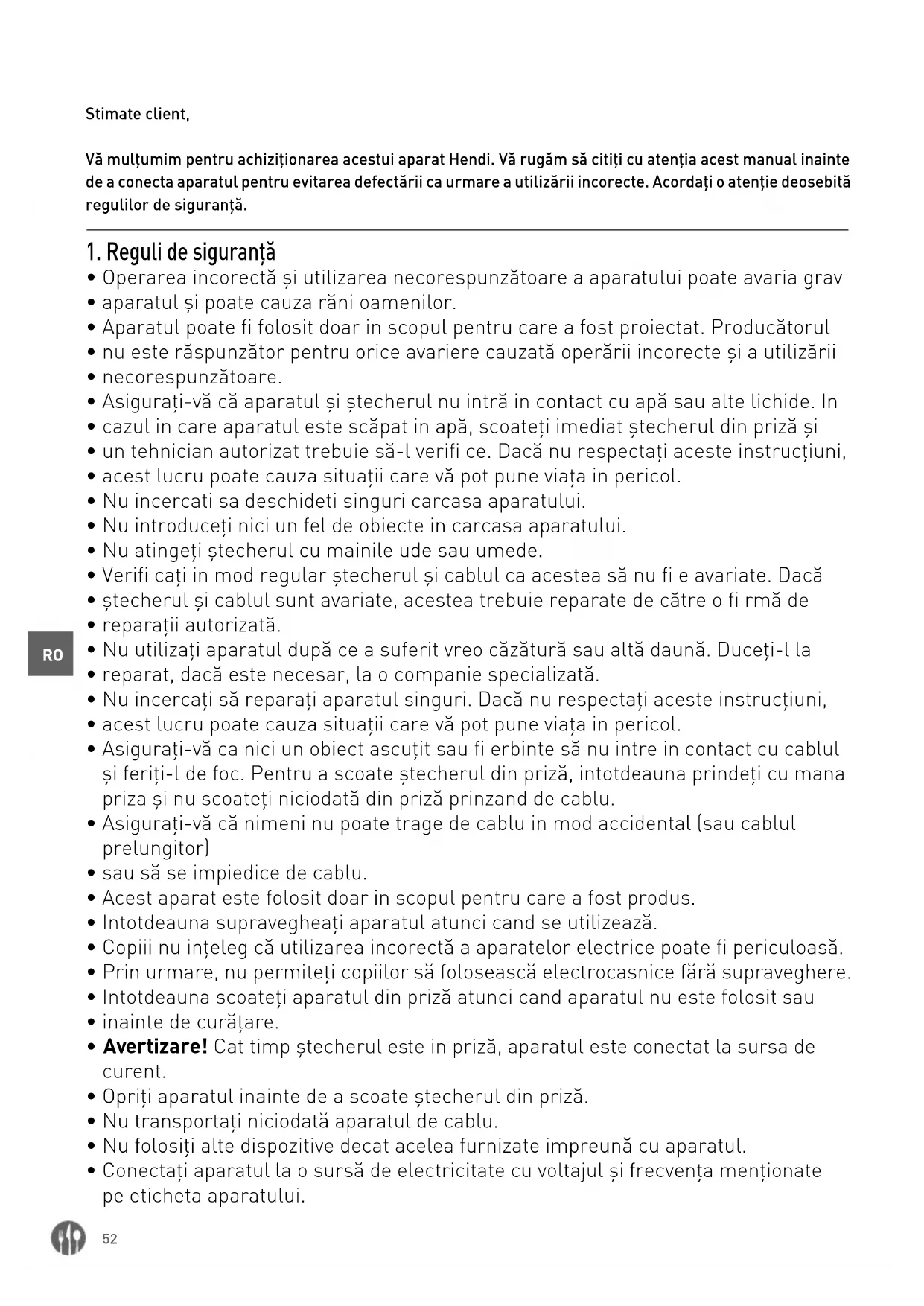 Stimate client, Vă mulțumim pentru achiziționarea acestui aparat Hendi. Vă rugăm să citiți cu atenția acest manual inainte de a conecta aparatul pentru evitarea defectării ca urmare a utilizării incorecte. Acordați o atenție deosebită regulilor de siguranță.