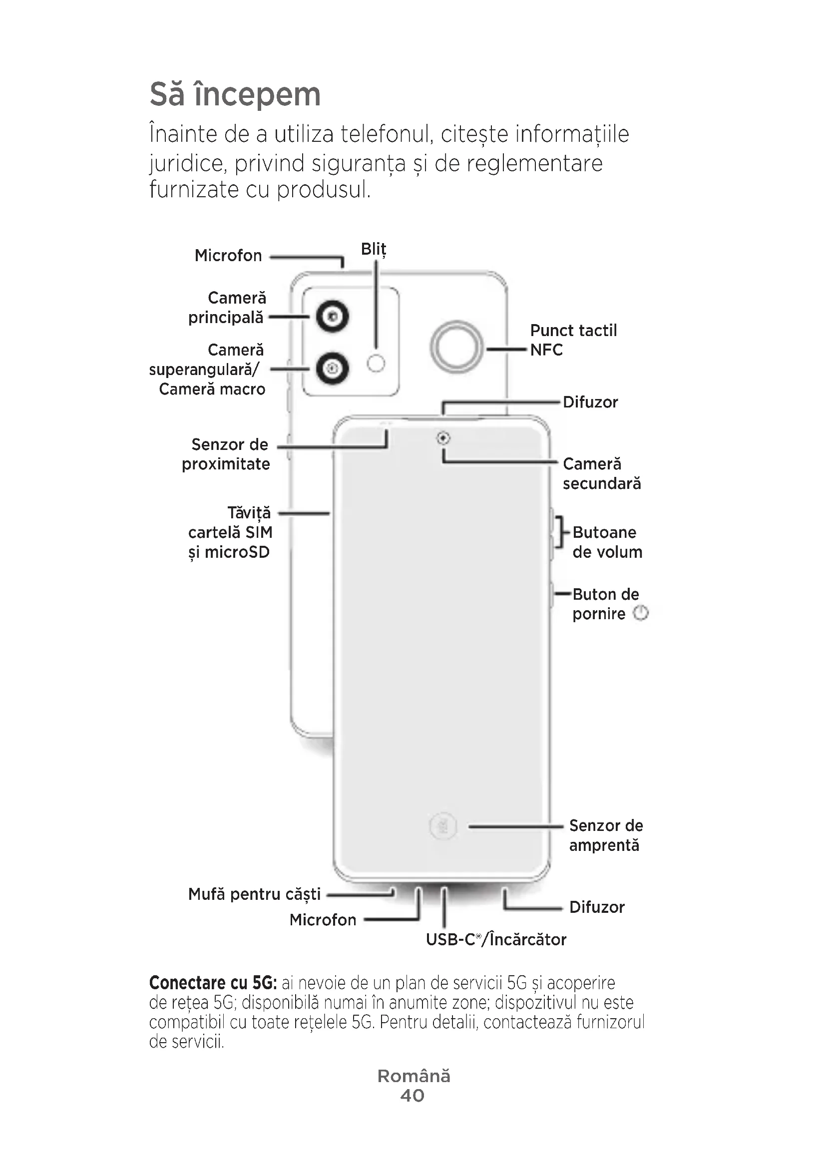 FM Qəbul 87,5–108 M/D GSM 2/3/5/8 33/30 UMTS 1/2/5/8 24 LTE B1/2/3/5/7/8/18/19/20/ 26/28/32/38/40/41*/42 23/(26*) 5G n1/3/5/7/8/20/26/28/38/ 40/41*/77*/78* 23/(26*) Müəllif hüququ və ticarət nişanları. MOTOROLA, stilizə edilmiş M loqosu, MOTO və MOTO nişanları Motorola Trademark Holdings, LLC şirkətinin ticarət nişanları və ya qeydiyyatdan keçmiş ticarət nişanlarıdır. Google, Android, Google Play və digər aidiyyati nişanlar və loqolar Google LLC şirkətinin ticarət nişanlarıdır. microSD Loqosu SD-3C, LLC şirkətinin ticarət nişanıdır. USB Type-C® və USB-C®, USB Implementers Forum-un qeydiyyatdan keçmiş ticarət nişanlarıdır. Bütün digər məhsul və ya xidmət adları müvafiq sahiblərinin mülkiyyətidir. © 2023 Motorola Mobility LLC. Bütün hüquqlar qorunur. Məhsulun identifikatoru: moto g84 5G (Model XT2347-2) Kitabçanın nömrəsi: P201-CJ8003-010-A40 Să începem Înainte de a utiliza telefonul, citește informațiile juridice, privind siguranța și de reglementare furnizate cu produsul. Conectare cu 5G: ai nevoie de un plan de servicii 5G și acoperire de rețea 5G; disponibilă numai în anumite zone; dispozitivul nu este compatibil cu toate rețelele 5G. Pentru detalii, contactează furnizorul de servicii. Cameră superangulară/ Cameră macro Cameră principală Bliţ Punct tactil NFC Cameră secundară Senzor de proximitate USB-C®/Încărcător Microfon Difuzor Mufă pentru căști Butoane de volum Tăviţă cartelă SIM și microSD Buton de pornire Microfon Difuzor Senz or de amprentă Română41 Introducerea cartelei/cartelelor și pornirea Nano SIM 1 Introdu cheița SIM în orificiul de lângă tăviță pentru a scoate tăvița. Asigură-te că utilizezi o cartelă SIM de dimensiuni potrivite și nu decupa cartela SIM. 2 Introdu cartela (cartelele) SIM cu contactele aurii în jos, apoi împinge ușor tăvița în locaș. Adăugă un card microSD (opțional, vândut separat) pentru spațiu de stocare suplimentar. 3 Apasă și ține apăsat butonul de pornire pentru a deschide telefonul, apoi urmează instrucțiunile pentru a începe. Observație: Apasă în același timp butonul de pornire și butonul de creștere a volumului pentru a opri telefonul. SIM2 SIM1 sau42 Ajutor și altele Obține răspunsuri, actualizări și informații: