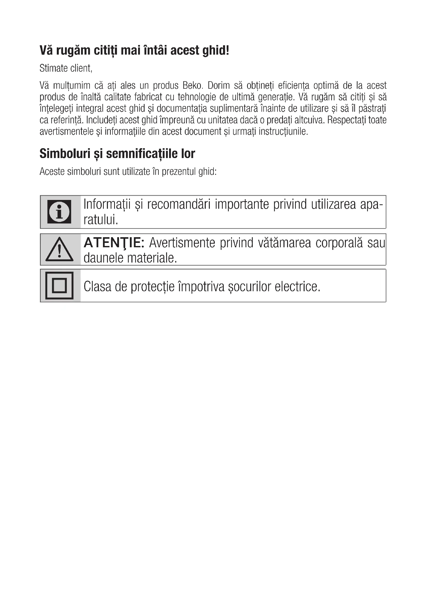 Niniejsze warunki gwarancji mają zastosowanie do Urządzeń zakupionych od dnia 01.03.2021 r. Gwarant oświadcza, że niniejsza Gwarancja jest udzielana Użytkownikowi dodatkowo i nie wyłącza, nie ogranicza ani nie zawiesza uprawnień Użytkownika wynikających z przepisów o rękojmi za wady rzeczy sprzedanej na podstawie Kodeksu cywilnego.Vă rugăm citiți mai întâi acest ghid! Stimate client, Vă mulțumim că ați ales un produs Beko. Dorim să obțineți eficiența optimă de la acest produs de înaltă calitate fabricat cu tehnologie de ultimă generație. Vă rugăm să citiți și să înțelegeți integral acest ghid și documentația suplimentară înainte de utilizare și să îl păstrați ca referință. Includeți acest ghid împreună cu unitatea dacă o predați altcuiva. Respectați toate avertismentele și informațiile din acest document și urmați instrucțiunile. Simboluri și semnificațiile lor Aceste simboluri sunt utilizate în prezentul ghid: