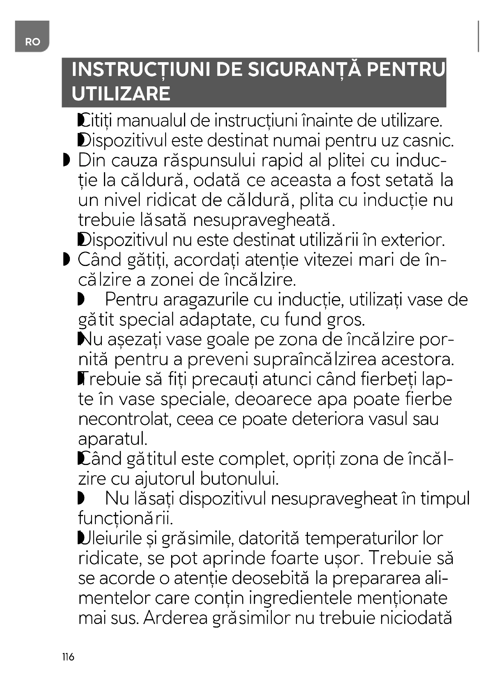 Dispozitivul nu este destinat utilizării în exterior. Când gătiți, acordați atenție vitezei mari de în- călzire a zonei de încălzire. Pentru aragazurile cu inducție, utilizați vase de gătit special adaptate, cu fund gros.