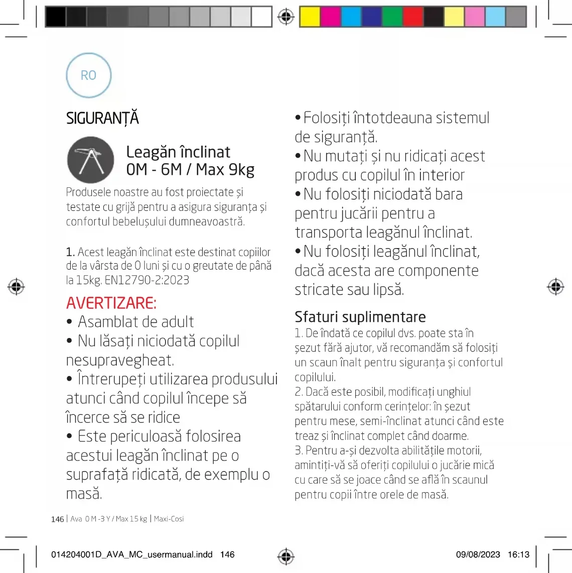 - Pentru spălarea husei, consultați instrucțiunile de pe etichetă. 014204001D_AVA_MC_usermanual.indd 148014204001D_AVA_MC_usermanual.indd 148 09/08/2023 16:1309/08/2023 16:13Maxi-Cosi