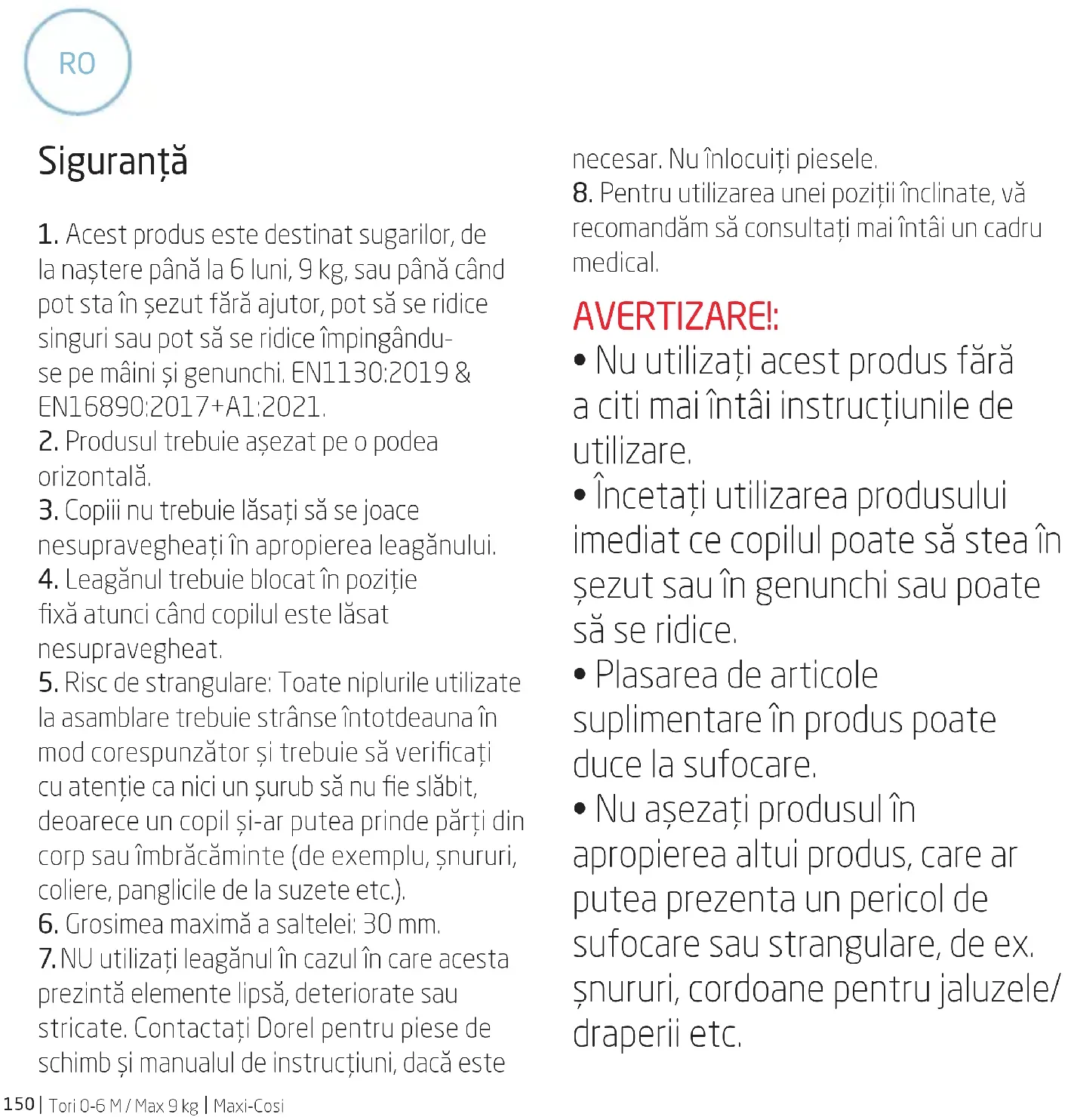 - Nu așezați produsul în apropierea altui produs, care ar putea prezenta un pericol de sufocare sau strangulare, de ex. șnururi, cordoane pentru jaluzele/ draperii etc. ROMaxi-Cosi