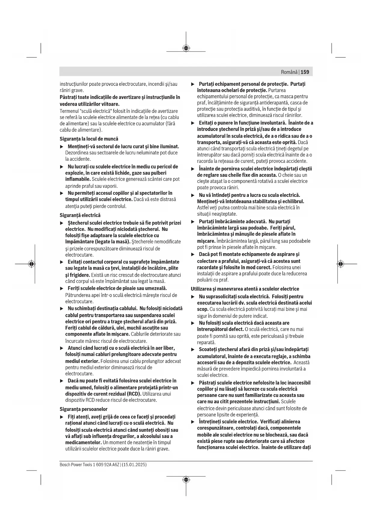 Română Instrucţiuni de siguranţă Indicaţii generale de avertizare pentru scule electrice AVERTIS- MENT Citiţi toate indicaţiile de avertizare şi instrucţiunile. Nerespectarea indicaţiilor de avertizare şi a 1 609 92A A6Z | (15.01.2025) Bosch Power ToolsRomână | 159 instrucţiunilor poate provoca electrocutare, incendii şi/sau răniri grave. Păstraţi toate indicaţiile de avertizare şi instrucţiunile în vederea utilizărilor viitoare. Termenul "sculă electrică" folosit în indicaţiile de avertizare se referă la sculele electrice alimentate de la reţea (cu cablu de alimentare) sau la sculele electrice cu acumulator (fără cablu de alimentare). Siguranţa la locul de muncă u Menţineţi‑vă sectorul de lucru curat şi bine iluminat. Dezordinea sau sectoarele de lucru neluminate pot duce la accidente. u Nu lucraţi cu sculele electrice în mediu cu pericol de explozie, în care există lichide, gaze sau pulberi inflamabile. Sculele electrice generează scântei care pot aprinde praful sau vaporii. u Nu permiteţi accesul copiilor şi al spectatorilor în timpul utilizării sculei electrice. Dacă vă este distrasă atenţia puteţi pierde controlul. Siguranţă electrică u Ştecherul sculei electrice trebuie să fie potrivit prizei electrice. Nu modificaţi niciodată ştecherul. Nu folosiţi fişe adaptoare la sculele electrice cu împământare (legate la masă). Ştecherele nemodificate şi prizele corespunzătoare diminuează riscul de electrocutare. u Evitaţi contactul corporal cu suprafeţe împământate sau legate la masă ca ţevi, instalaţii de încălzire, plite şi frigidere. Există un risc crescut de electrocutare atunci când corpul vă este împământat sau legat la masă. u Feriţi sculele electrice de ploaie sau umezeală. Pătrunderea apei într‑o sculă electrică măreşte riscul de electrocutare. u Nu schimbaţi destinaţia cablului. Nu folosiţi niciodată cablul pentru transportarea sau suspendarea sculei electrice ori pentru a trage ştecherul afară din priză. Feriţi cablul de căldură, ulei, muchii ascuţite sau componente aflate în mişcare. Cablurile deteriorate sau încurcate măresc riscul de electrocutare. u Atunci când lucraţi cu o sculă electrică în aer liber, folosiţi numai cabluri prelungitoare adecvate pentru mediul exterior. Folosirea unui cablu prelungitor adecvat pentru mediul exterior diminuează riscul de electrocutare. u Dacă nu poate fi evitată folosirea sculei electrice în mediu umed, folosiţi o alimentare protejată printr-un dispozitiv de curent rezidual (RCD). Utilizarea unui dispozitiv RCD reduce riscul de electrocutare. Siguranţa persoanelor u Fiţi atenţi, aveţi grijă de ceea ce faceţi şi procedaţi raţional atunci când lucraţi cu o sculă electrică. Nu folosiţi scula electrică atunci când sunteţi obosiţi sau vă aflaţi sub influenţa drogurilor, a alcoolului sau a medicamentelor. Un moment de neatenţie în timpul utilizării sculelor electrice poate duce la răniri grave. u Purtaţi echipament personal de protecţie. Purtaţi întoteauna ochelari de protecţie. Purtarea echipamentului personal de protecţie, ca masca pentru praf, încălţăminte de siguranţă antiderapantă, casca de protecţie sau protecţia auditivă, în funcţie de tipul şi utilizarea sculei electrice, diminuează riscul rănirilor. u Evitaţi o punere în funcţiune involuntară. Înainte de a introduce ştecherul în priză şi/sau de a introduce acumulatorul în scula electrică, de a o ridica sau de a o transporta, asiguraţi‑vă că aceasta este oprită. Dacă atunci când transportaţi scula electrică ţineţi degetul pe întrerupător sau dacă porniţi scula electrică înainte de a o racorda la reţeaua de curent, puteţi provoca accidente. u Înainte de pornirea sculei electrice îndepărtaţi cleştii de reglare sau cheile fixe din aceasta. O cheie sau un cleşte ataşat la o componentă rotativă a sculei electrice poate provoca răniri. u Nu vă întindeţi pentru a lucra cu scula electrică. Menţineţi-vă întotdeauna stabilitatea şi echilibrul. Astfel veţi putea controla mai bine scula electrică în situaţii neaşteptate. u Purtaţi îmbrăcăminte adecvată. Nu purtaţi îmbrăcăminte largă sau podoabe. Feriţi părul, îmbrăcămintea şi mănuşile de piesele aflate în mişcare. Îmbrăcămintea largă, părul lung sau podoabele pot fi prinse în piesele aflate în mişcare. u Dacă pot fi montate echipamente de aspirare şi colectare a prafului, asiguraţi‑vă că acestea sunt racordate şi folosite în mod corect. Folosirea unei instalaţii de aspirare a prafului poate duce la reducerea poluării cu praf. Utilizarea şi manevrarea atentă a sculelor electrice u Nu suprasolicitaţi scula electrică. Folosiţi pentru executarea lucrării dv. scula electrică destinată acelui scop. Cu scula electrică potrivită lucraţi mai bine şi mai sigur în domeniul de putere indicat. u Nu folosiţi scula electrică dacă aceasta are întrerupătorul defect. O sculă electrică, care nu mai poate fi pornită sau oprită, este periculoasă şi trebuie reparată. u Scoateţi ştecherul afară din priză şi/sau îndepărtaţi acumulatorul, înainte de a executa reglaje, a schimba accesorii sau de a depozita sculele electrice. Această măsură de prevedere împiedică pornirea involuntară a sculei electrice. u Păstraţi sculele electrice nefolosite la loc inaccesibil copiilor şi nu lăsaţi să lucreze cu scula electrică persoane care nu sunt familiarizate cu aceasta sau care nu au citit prezentele instrucţiuni. Sculele electrice devin periculoase atunci când sunt folosite de persoane lipsite de experienţă. u Întreţineţi sculele electrice. Verificaţi alinierea corespunzătoare, controlaţi dacă, componentele mobile ale sculei electrice nu se blochează, sau dacă există piese rupte sau deteriorate care să afecteze funcţionarea sculei electrice. Înainte de utilizare 