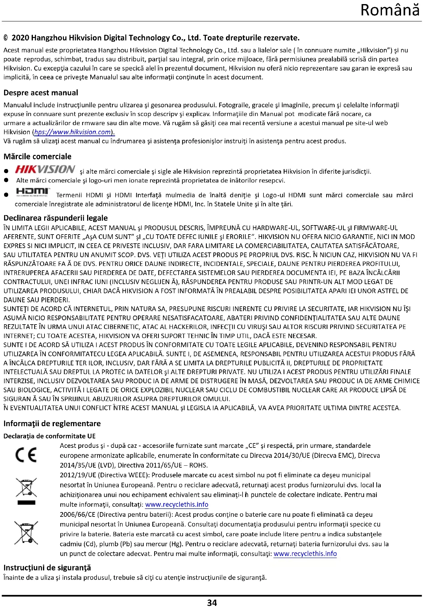 © 2020 Hangzhou Hikvision Digital Technology Co., Ltd. Toate drepturile rezervate. Acest manual este proprietatea Hangzhou Hikvision Digital Technology Co., Ltd. sau a filialelor sale ( în continuare numite „Hikvision”) şi nu poate fi reprodus, schimbat, tradus sau distribuit, parţial sau integral, prin orice mijloace, fără permisiunea prealabilă scrisă din partea Hikvision. Cu excepţia cazului în care se specifică altfel în prezentul document, Hikvision nu oferă nicio reprezentare sau garan ie expresă sau implicită, în ceea ce priveşte Manualul sau alte informaţii conţinute în acest document. Despre acest manual Manualul include instrucţiunile pentru utilizarea şi gestionarea produsului. Fotografiile, graficele şi imaginile, precum şi celelalte informaţii expuse în continuare sunt prezente exclusiv în scop descriptiv şi explicativ. Informaţiile din Manual pot fi modificate fără notificare, ca urmare a actualizărilor de firmware sau din alte motive. Vă rugăm să găsiţi cea mai recentă versiune a acestui manual pe site-ul web Hikvision (http s://www.hikvision.com). Vă rugăm să utilizaţi acest manual cu îndrumarea şi asistenţa profesioniştilor instruiţi în asistenţa pentru acest produs. Mărcile comerciale şi alte mărci comerciale şi sigle ale Hikvision reprezintă proprietatea Hikvision în diferite jurisdicţii. Alte mărci comerciale şi logo-uri men ionate reprezintă proprietatea de inătorilor resepctivi. Termenii HDMI şi HDMI Interfaţă multimedia de înaltă definiţie şi Logo-ul HDMI sunt mărci comerciale sau mărci comerciale înregistrate ale administratorul de licenţe HDMI, Inc. în Statele Unite şi în alte ţări. Declinarea răspunderii legale ÎN LIMITA LEGII APLICABILE, ACEST MANUAL şI PRODUSUL DESCRIS, ÎMPREUNĂ CU HARDWARE-UL, SOFTWARE-UL şI FIRMWARE-UL AFERENTE, SUNT OFERITE „AşA CUM SUNT” şI „CU TOATE DEFEC IUNILE şI ERORILE”. HIKVISION NU OFERA NICIO GARANTIE, NICI IN MOD EXPRES SI NICI IMPLICIT, IN CEEA CE PRIVESTE INCLUSIV, DAR FARA LIMITARE LA COMERCIABILITATEA, CALITATEA SATISFĂCĂTOARE, SAU UTILITATEA PENTRU UN ANUMIT SCOP. DVS. VEŢI UTILIZA ACEST PRODUS PE PROPRIUL DVS. RISC. ÎN NICIUN CAZ, HIKVISION NU VA FI RĂSPUNZĂTOARE FA Ă DE DVS. PENTRU ORICE DAUNE INDIRECTE, INCIDENTALE, SPECIALE, DAUNE PENTRU PIERDEREA PROFITULUI, INTRERUPEREA AFACERII SAU PIERDEREA DE DATE, DEFECTAREA SISTEMELOR SAU PIERDEREA DOCUMENTA IEI, PE BAZA ÎNCĂLCĂRII CONTRACTULUI, UNEI INFRAC IUNI (INCLUSIV NEGLIJEN Ă), RĂSPUNDEREA PENTRU PRODUSE SAU PRINTR-UN ALT MOD LEGAT DE UTILIZAREA PRODUSULUI, CHIAR DACĂ HIKVISION A FOST INFORMATĂ ÎN PREALABIL DESPRE POSIBILITATEA APARI IEI UNOR ASTFEL DE DAUNE SAU PIERDERI. SUNTEŢI DE ACORD CĂ INTERNETUL, PRIN NATURA SA, PRESUPUNE RISCURI INERENTE CU PRIVIRE LA SECURITATE, IAR HIKVISION NU ÎŞI ASUMĂ NICIO RESPONSABILITATE PENTRU OPERARE NESATISFACATOARE, ABATERI PRIVIND CONFIDENŢIALITATEA SAU ALTE DAUNE REZULTATE ÎN URMA UNUI ATAC CIBERNETIC, ATAC AL HACKERILOR, INFECŢII CU VIRUŞI SAU ALTOR RISCURI PRIVIND SECURITATEA PE INTERNET; CU TOATE ACESTEA, HIKVISION VA OFERI SUPORT TEHNIC ÎN TIMP UTIL, DACĂ ESTE NECESAR. SUNTE I DE ACORD SĂ UTILIZA I ACEST PRODUS ÎN CONFORMITATE CU TOATE LEGILE APLICABILE, DEVENIND RESPONSABIL PENTRU UTILIZAREA ÎN CONFORMITATECU LEGEA APLICABILĂ. SUNTE I, DE ASEMENEA, RESPONSABIL PENTRU UTILIZAREA ACESTUI PRODUS FĂRĂ A ÎNCĂLCA DREPTURILE TER ILOR, INCLUSIV, DAR FĂRĂ A SE LIMITA LA DREPTURILE PUBLICITĂ II, DREPTURILE DE PROPRIETATE INTELECTUALĂ SAU DREPTUL LA PROTEC IA DATELOR şI ALTE DREPTURI PRIVATE. NU UTILIZA I ACEST PRODUS PENTRU UTILIZĂRI FINALE INTERZISE, INCLUSIV DEZVOLTAREA SAU PRODUC IA DE ARME DE DISTRUGERE ÎN MASĂ, DEZVOLTAREA SAU PRODUC IA DE ARME CHIMICE SAU BIOLOGICE, ACTIVITĂ I LEGATE DE ORICE EXPLOZIBIL NUCLEAR SAU CICLU DE COMBUSTIBIL NUCLEAR CARE AR PRODUCE LIPSĂ DE SIGURAN Ă SAU ÎN SPRIJINUL ABUZURILOR ASUPRA DREPTURILOR OMULUI. ÎN EVENTUALITATEA UNUI CONFLICT ÎNTRE ACEST MANUAL şI LEGISLA IA APLICABILĂ, VA AVEA PRIORITATE ULTIMA DINTRE ACESTEA. Informaţii de reglementare Declaraţia de conformitate UE