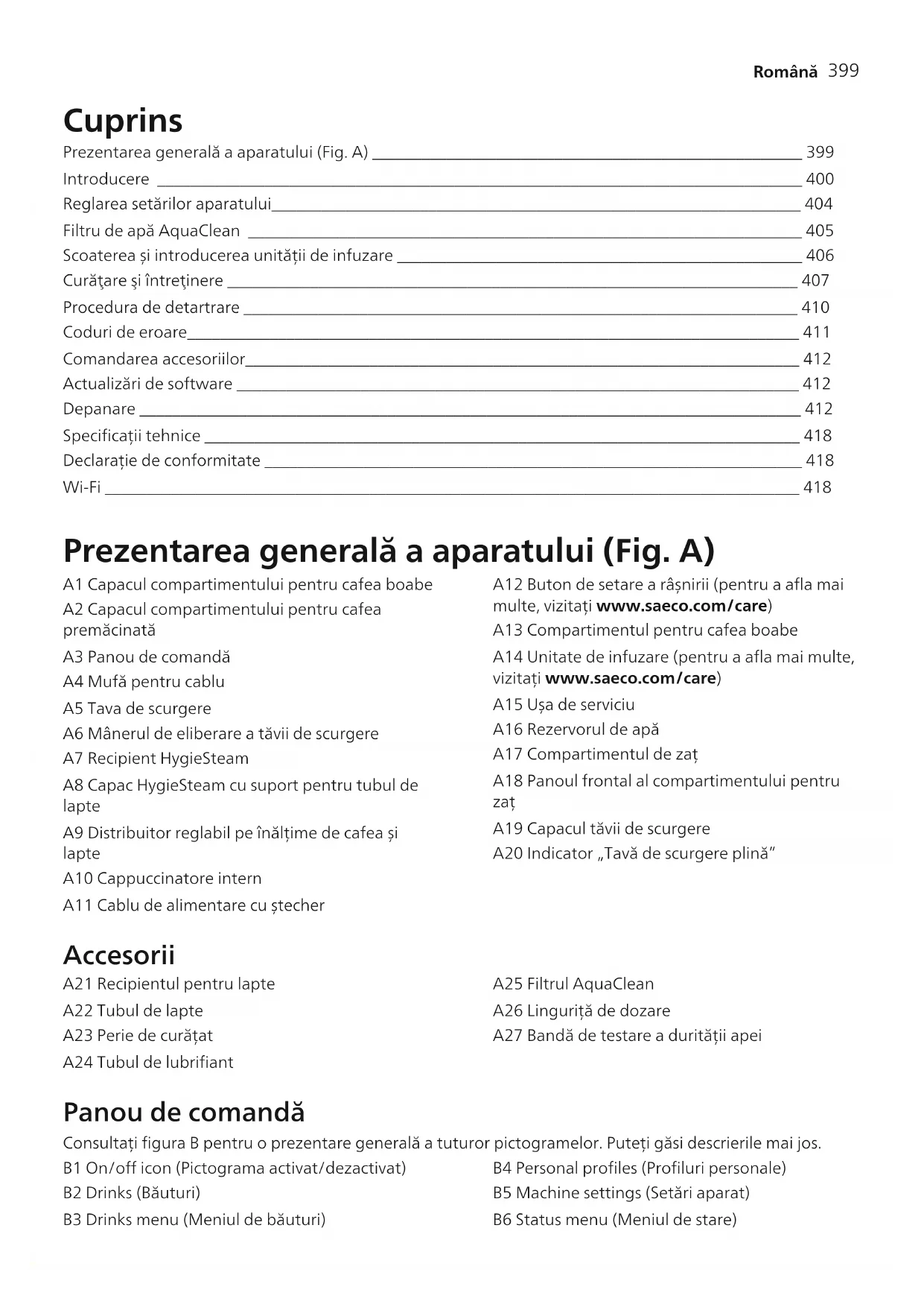 Română Cuprins Prezentarea generală a aparatului (Fig. A) ____________________________________________________ 399 Introducere ______________________________________________________________________________ 400 Reglarea setărilor aparatului________________________________________________________________ 404 Filtru de apă AquaClean ___________________________________________________________________ 405 Scoaterea și introducerea unității de infuzare _________________________________________________ 406 Curăţare şi întreţinere _____________________________________________________________________ 407 Procedura de detartrare ___________________________________________________________________ 410 Coduri de eroare__________________________________________________________________________ 411 Comandarea accesoriilor___________________________________________________________________ 412 Actualizări de software ____________________________________________________________________ 412 Depanare ________________________________________________________________________________ 412 Specificații tehnice ________________________________________________________________________ 418 Declarație de conformitate _________________________________________________________________ 418 Wi-Fi ____________________________________________________________________________________ 418 Prezentarea generală a aparatului (Fig. A) A1 Capacul compartimentului pentru cafea boabe A2 Capacul compartimentului pentru cafea premăcinată A3 Panou de comandă A4 Mufă pentru cablu A5 Tava de scurgere A6 Mânerul de eliberare a tăvii de scurgere A7 Recipient HygieSteam A8 Capac HygieSteam cu suport pentru tubul de lapte A9 Distribuitor reglabil pe înălțime de cafea și lapte A10 Cappuccinatore intern A11 Cablu de alimentare cu ștecher A12 Buton de setare a râșnirii (pentru a afla mai multe, vizitați www.saeco.com/care) A13 Compartimentul pentru cafea boabe A14 Unitate de infuzare (pentru a afla mai multe, vizitați www.saeco.com/care) A15 Ușa de serviciu A16 Rezervorul de apă A17 Compartimentul de zaț A18 Panoul frontal al compartimentului pentru zaț A19 Capacul tăvii de scurgere A20 Indicator „Tavă de scurgere plină” Accesorii A21 Recipientul pentru lapte A22 Tubul de lapte A23 Perie de curățat A24 Tubul de lubrifiant A25 Filtrul AquaClean A26 Linguriță de dozare A27 Bandă de testare a durității apei Panou de comandă Consultați figura B pentru o prezentare generală a tuturor pictogramelor. Puteți găsi descrierile mai jos. B1 On/off icon (Pictograma activat/dezactivat) B2 Drinks (Băuturi) B3 Drinks menu (Meniul de băuturi) B4 Personal profiles (Profiluri personale) B5 Machine settings (Setări aparat) B6 Status menu (Meniul de stare)400 Română B7 Magazin B8 Start/stop icon (Pictograma pornire/oprire) Introducere Felicitări pentru achiziționarea unei cafetiere complet automate Saeco! Pentru a beneficia pe deplin de asistența online oferită de Saeco, puteți utiliza panoul de comandă pentru a vă înregistra aparatul prin intermediul conexiunii Wi-Fi încorporate sau vă puteți înregistra produsul accesând www.saeco.com/MyCoffeeMachine. Citiţi cu atenţie broşură separată cu informaţii referitoare la siguranţă înainte de a utiliza pentru prima oară aparatul şi păstraţi-o pentru consultare ulterioară. Cafetiera complet automată Saeco vă permite să vă conectați la rețeaua Wi-Fi pentru a vă îmbunătăți experiența legată de cafea. Prin conectarea aparatului la rețeaua Wi-Fi, veți putea: