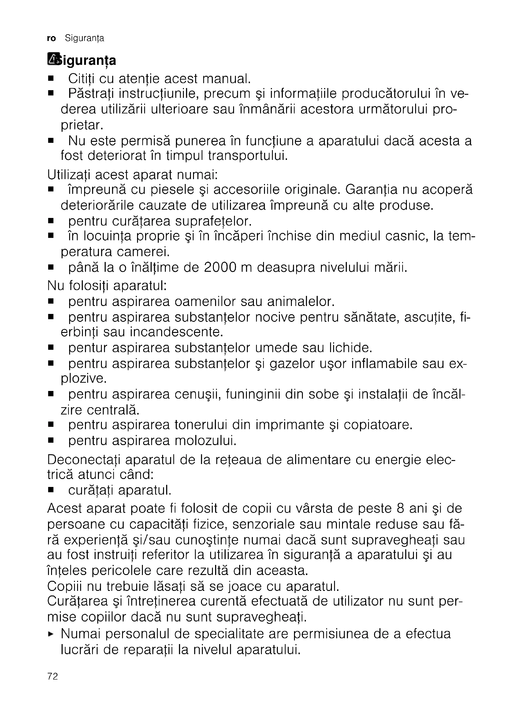 За почистването на твърди подове из- ползвайте предназначената за почист- ването на твърди подове и изпитвател- ния процеп дюза за твърди подове, ако е включена в комплекта. Данните за мощността на този уред се основават на методите за измерване и изчисляване съгласно Регламент (ЕС) № 666/2013 и стандартите EN 60312-1, EN 60704-2-1, EN 60335-2-2. 71ro Siguranţa Siguranţa Siguranţa ¡ Citiţi cu atenţie acest manual. ¡ Păstraţi instrucţiunile, precum şi informaţiile producătorului în ve- derea utilizării ulterioare sau înmânării acestora următorului pro- prietar. ¡ Nu este permisă punerea în funcţiune a aparatului dacă acesta a fost deteriorat în timpul transportului. Utilizaţi acest aparat numai: ¡ împreună cu piesele şi accesoriile originale. Garanţia nu acoperă deteriorările cauzate de utilizarea împreună cu alte produse. ¡ pentru curăţarea suprafeţelor. ¡ în locuinţa proprie şi în încăperi închise din mediul casnic, la tem- peratura camerei. ¡ până la o înălţime de 2000m deasupra nivelului mării. Nu folosiţi aparatul: ¡ pentru aspirarea oamenilor sau animalelor. ¡ pentru aspirarea substanţelor nocive pentru sănătate, ascuţite, fi- erbinţi sau incandescente. ¡ pentur aspirarea substanţelor umede sau lichide. ¡ pentru aspirarea substanţelor şi gazelor uşor inflamabile sau ex- plozive. ¡ pentru aspirarea cenuşii, funinginii din sobe şi instalaţii de încăl- zire centrală. ¡ pentru aspirarea tonerului din imprimante şi copiatoare. ¡ pentru aspirarea molozului. Deconectaţi aparatul de la reţeaua de alimentare cu energie elec- trică atunci când: ¡ curăţaţi aparatul. Acest aparat poate fi folosit de copii cu vârsta de peste 8 ani şi de persoane cu capacităţi fizice, senzoriale sau mintale reduse sau fă- ră experienţă şi/sau cunoştinţe numai dacă sunt supravegheaţi sau au fost instruiţi referitor la utilizarea în siguranţă a aparatului şi au înţeles pericolele care rezultă din aceasta. Copiii nu trebuie lăsaţi să se joace cu aparatul. Curăţarea şi întreţinerea curentă efectuată de utilizator nu sunt per- mise copiilor dacă nu sunt supravegheaţi. Numai personalul de specialitate are permisiunea de a efectua lucrări de reparaţii la nivelul aparatului. 72Siguranţa ro La reparaţia aparatului trebuie utilizate numai piese de schimb originale. Dacă se deteriorează cablul de racordare la reţea al acestui apa- rat, acesta trebuie înlocuit de către producător, de către serviciul său pentru clienţi sau de către o persoană calificată în mod simi- lar, pentru a evita pericolele. Nu utilizaţi niciodată un aparat deteriorat. Nu utilizaţi un aparat care are suprafaţa cu fisuri sau spartă. Nu trageţi niciodată de cablul de alimentare electrică pentru a deconecta aparatul de la reţeaua de alimentare electrică. Scoa- teţi întotdeauna din priză ştecherul cablului de alimentare electri- că. Nu trageţi niciodată de cablul de alimentare electrică al aparatu- lui şi nu sprijiniţi aparatul pe acesta. Dacă aparatul sau cablul de alimentare electrică este deteriorat, scoateţi imediat ştecherul din priză sau decuplaţi siguranţa din cutia cu siguranţe. Contactaţi unitatea de service abilitată.