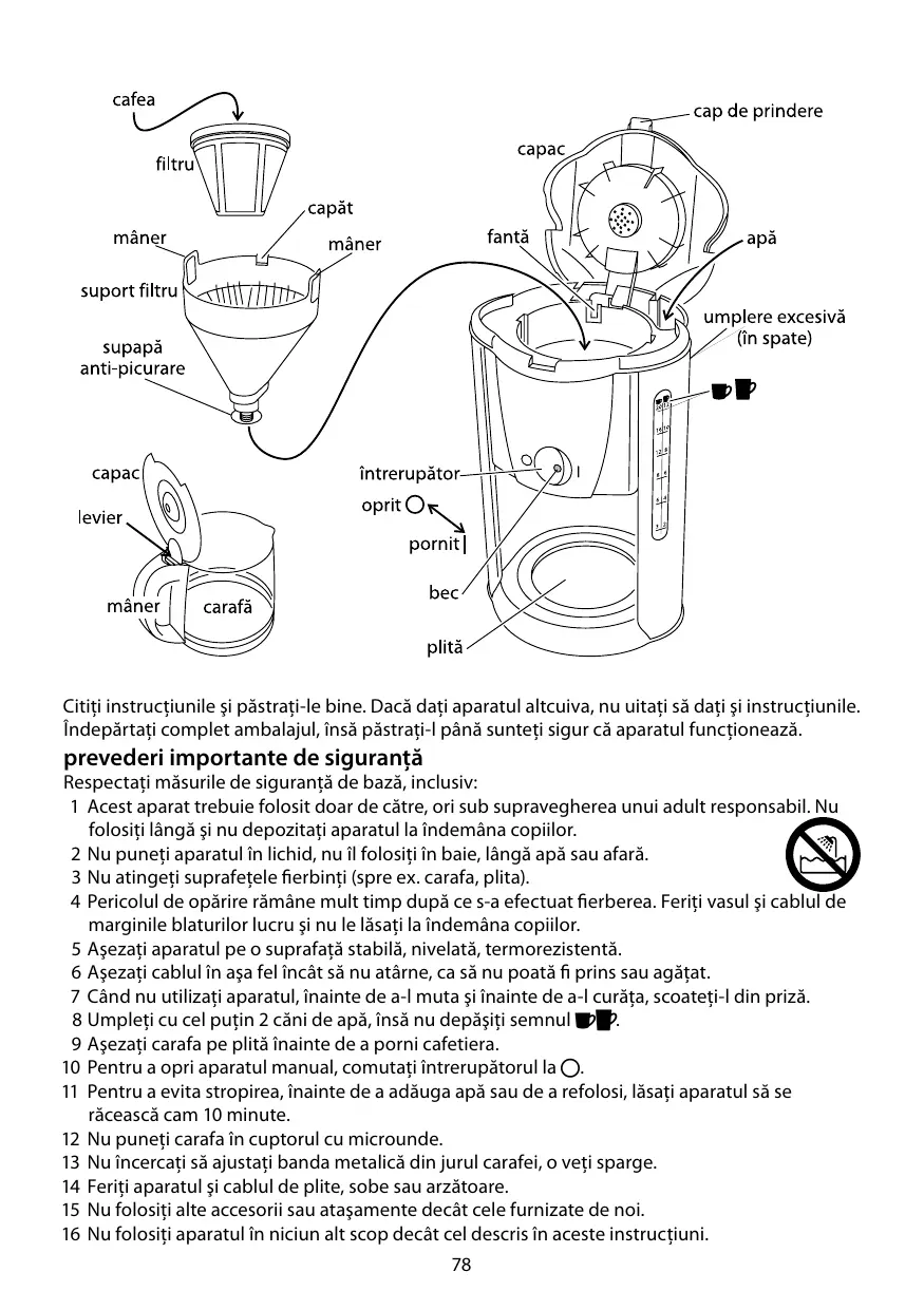 2 N’immergez pas l’appareil dans un liquide, ne l’utilisez pas dans une salle de bains, à proximité d’une source d’eau ou à l’extérieur. 3 Ne touchez pas les surfaces chaudes ( la carafe, la plaque chauffante). 4 Le risque de brûlure persiste longtemps après ébullition. Tenez l’appareil et le câble loin des bords des surfaces de travail et hors de portée des enfants. 5 Posez l’appareil sur une surface stable, à niveau et résistante à la chaleur. 6 Branchez le cordon de sorte qu’il ne pende pas et qu’il n’y ait aucun risque de trébucher dessus. 7 Débranchez l’appareil lorsque vous ne l’utilisez pas, avant de le déplacer et avant de le nettoyer. 8 Remplissez le réservoir avec 2 tasses au minimum, mais sans dépasser la marque ;:. 9 Placez la carafe sur la plaque chauffante avant d’allumer la cafetière. 10 Si vous voulez arrêter la machine pendant la préparation du café, mettez l’interrupteur sur 0. 11 Laissez l’appareil refroidir au moins 10 minutes avant de rajouter de l’eau ou de le réutiliser afin d’éviter toute projection. 12 Ne mettez pas la carafe au four micro-ondes. 13 N’essayez pas de régler la bande métallique autour de la carafe, le verre casserait. 14 Placez l’appareil et le cordon loin des plaques chauffantes, des plans de cuisson ou des brûleurs. 15 N’adaptez pas d’accessoires autres que ceux fournis. 6