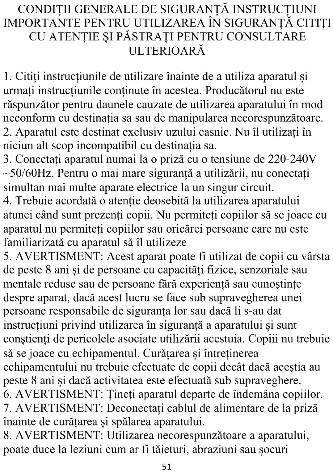~50/60Hz. Pentru o mai mare siguranță a utilizării, nu conectați simultan mai multe aparate electrice la un singur circuit.