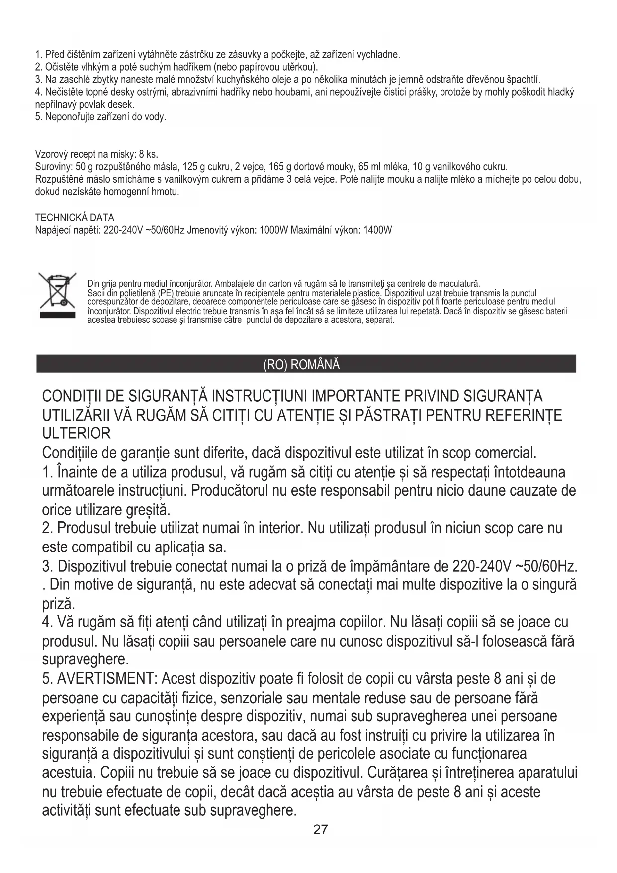 3. Na zaschlé zbytky naneste malé množství kuchyňského oleje a po několika minutách je jemně odstraňte dřevěnou špachtlí. Rozpuštěné máslo smícháme s vanilkovým cukrem a přidáme 3 celá vejce. Poté nalijte mouku a nalijte mléko a míchejte po celou dobu, dokud nezískáte homogenní hmotu. Vzorový recept na misky: 8 ks. 4. Nečistěte topné desky ostrými, abrazivními hadříky nebo houbami, ani nepoužívejte čisticí prášky, protože by mohly poškodit hladký nepřilnavý povlak desek. Din grija pentru mediul înconjurător. Ambalajele din carton vă rugăm să le transmiteţi şa centrele de maculatură. Sacii din polietilenă (PE) trebuie aruncate în recipientele pentru materialele plastice. Dispozitivul uzat trebuie transmis la punctul corespunzător de depozitare, deoarece componentele periculoase care se găsesc în dispozitiv pot fi foarte periculoase pentru mediul înconjurător. Dispozitivul electric trebuie transmis în aşa fel încât să se limiteze utilizarea lui repetată. Dacă în dispozitiv se găsesc baterii acestea trebuiesc scoase şi transmise către punctul de depozitare a acestora, separat. Condițiile de garanție sunt diferite, dacă dispozitivul este utilizat în scop comercial.