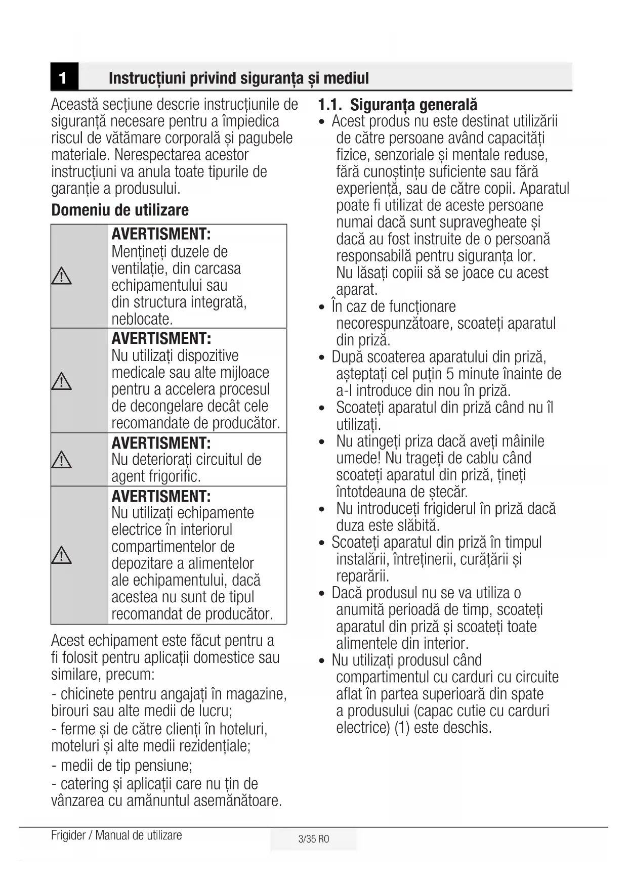 AVERTISMENT: Nu utilizaţi echipamente electrice în interiorul compartimentelor de depozitare a alimentelor ale echipamentului, dacă acestea nu sunt de tipul recomandat de producător. Acest echipament este făcut pentru a fi folosit pentru aplicaţii domestice sau similare, precum: - chicinete pentru angajaţi în magazine, birouri sau alte medii de lucru; - ferme și de către clienţi în hoteluri, moteluri și alte medii rezidenţiale; - medii de tip pensiune; - catering și aplicații care nu țin de vânzarea cu amănuntul asemănătoare. 1.1. Siguranţa generală