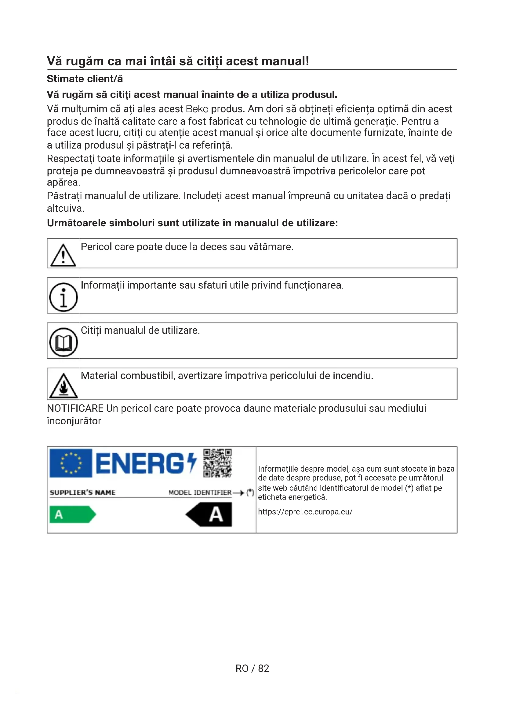 RORO / 82 Vă rugăm ca mai întâi să citiți acest manual! Stimate client/ă Vă rugăm să citiți acest manual înainte de a utiliza produsul. Vă mulțumim că ați ales acest Beko produs. Am dori să obțineți eficiența optimă din acest produs de înaltă calitate care a fost fabricat cu tehnologie de ultimă generație. Pentru a face acest lucru, citiți cu atenție acest manual și orice alte documente furnizate, înainte de a utiliza produsul și păstrați-l ca referință. Respectați toate informațiile și avertismentele din manualul de utilizare. În acest fel, vă veți proteja pe dumneavoastră și produsul dumneavoastră împotriva pericolelor care pot apărea. Păstrați manualul de utilizare. Includeți acest manual împreună cu unitatea dacă o predați altcuiva. Următoarele simboluri sunt utilizate în manualul de utilizare: Pericol care poate duce la deces sau vătămare. Informații importante sau sfaturi utile privind funcționarea. Citiți manualul de utilizare. Material combustibil, avertizare împotriva pericolului de incendiu. NOTIFICARE Un pericol care poate provoca daune materiale produsului sau mediului înconjurător Informațiile despre model, așa cum sunt stocate în baza de date despre produse, pot fi accesate pe următorul site web căutând identificatorul de model (*) aflat pe eticheta energetică. https://eprel.ec.europa.eu/RO / 83 1 Instrucțiuni de siguranța .............. 84