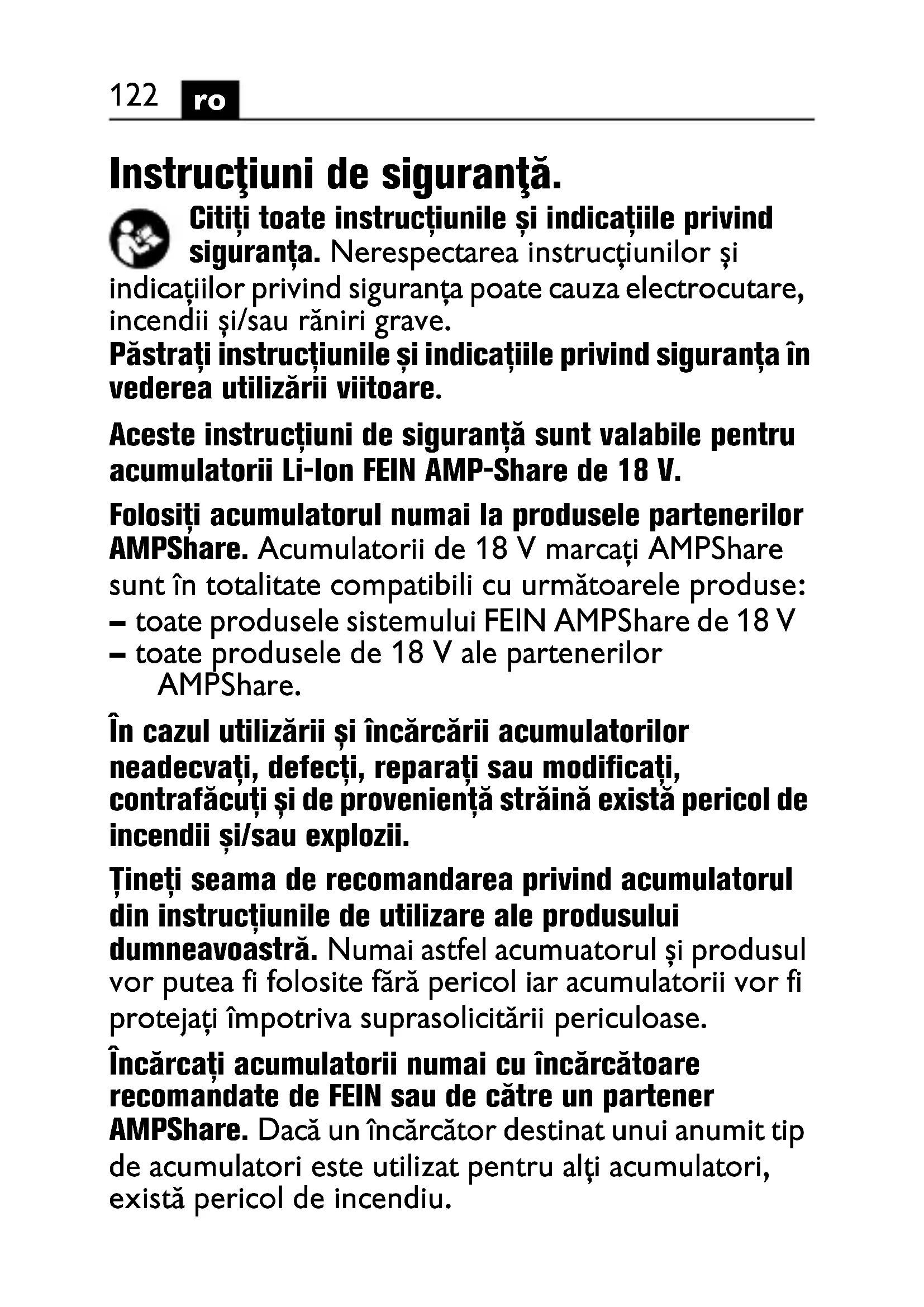 Instrucţiuni de siguranţă. Citiți toate instrucțiunile și indicațiile privind siguranța. Nerespectarea instrucțiunilor și indicațiilor privind siguranța poate cauza electrocutare, incendii și/sau răniri grave. Păstrați instrucțiunile și indicațiile privind siguranța în vederea utilizării viitoare. Aceste instrucțiuni de siguranță sunt valabile pentru acumulatorii Li-Ion FEIN AMP-Share de 18 V. Folosiți acumulatorul numai la produsele partenerilor AMPShare. Acumulatorii de 18 V marcați AMPShare sunt în totalitate compatibili cu următoarele produse: – toate produsele sistemului FEIN AMPShare de 18 V – toate produsele de 18 V ale partenerilor AMPShare. În cazul utilizării și încărcării acumulatorilor neadecvați, defecți, reparați sau modificați, contrafăcuți și de proveniență străină există pericol de incendii și/sau explozii. Țineți seama de recomandarea privind acumulatorul din instrucțiunile de utilizare ale produsului dumneavoastră. Numai astfel acumuatorul și produsul vor putea fi folosite fără pericol iar acumulatorii vor fi protejați împotriva suprasolicitării periculoase. Încărcați acumulatorii numai cu încărcătoare recomandate de FEIN sau de către un partener AMPShare. Dacă un încărcător destinat unui anumit tip de acumulatori este utilizat pentru alți acumulatori, există pericol de incendiu.123
