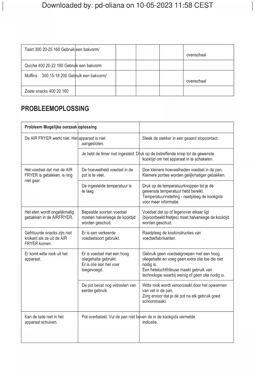 - Alimentelepotvariaînfuncțiedeorigine,dimensiune, formășimarcă,astfelîncâtnuputemgarantacelemai bunesetăripentruunanumitaliment. Downloaded by: pd-oliana on 10-05-2023 11:58 CESTGHID DE GĂTIT Cantitatea de alimente (g) (min- max) Timp (min) Temp. (°C) Shake Informații suplimentare Cartoșicartoprăjiți Cartoprăjițisubțiricon- gelați 300-1200 9-16 200 Da Cartoprăjițigroșicongelați 300-1200 11-20 200 Da Cartoprăjițidecasă (5×8mm) 300-1200 16-10 200 Da Seadaugă1/2lingură de ulei Cartodecasă 300-1200 18-22 180 Da Seadaugă1/2lingură de ulei Cartodecasă 300-1200 12-18 180 Da Seadaugă1/2lingură de ulei Rosti 250 15-18 180 Da Cartogratinați 500 15-18 200 Da Carneșipăsăridecurte Friptură 100-500 8-12 180 Cotlete de porc 100-500 10-14 180 Hamburger 100-500 7-14 180 Ruladădecârnați 100-500 13-15 180 Bețișoaredetobă 100-500 18-22 180 Piept de pui 100-500 10-15 180 Gustări Rulourideprimăvară 100-400 8-10 200 Da Nuggetsdepuicongelate 100-500 6-10 200 Da Batoanedepeștecon- gelate 100-400 6-10 200 Snacks-uricongelatecu brânzăpaneșipesmet 100-400 8-10 180 Legume umplute 100-400 10 160 Coacere Tort 300 20-25 160 Folosițioformădecopt/ unvasdecuptor Quiche 400 20-22 180 Folosițiformadecopt Brioșe 300 15-18 200 Folosițioformădecopt/ unvasdecuptor Gustăridulci 400 20 160 Downloaded by: pd-oliana on 10-05-2023 11:58 CESTDEPANARE Problema Cauza posibilă Soluție RĂcitoruldeaernufuncți- onează. Aparatulnuesteconectatla priză. Introducețiștecherulderețeaîntr-oprizăde peretecuîmpământare. Nuațisetatcronometrul. Apăsațibutonulcorespunzătortimpuluidegătire dorit pentru a porni aparatul. AlimenteleprăjitecuAIR FRYERnusuntgata. Cantitateadealimentedinoală estepreamare. Punețiloturimaimicidemâncareînoală.Loturile maimicisuntprăjitemaiuniform. Temperaturasetatăesteprea scăzută. Apăsațibutoaneledetemperaturăpânăcând ajungețilatemperaturadorită. Setareatemperaturii-consultațighiduldegătit pentrureferință. Alimentelesuntprăjite neuniformînAIRFRYER. Anumite tipuri de alimente trebuiesăeagitatelajumăta- teatimpuluidegătire. Alimentelecareseașeazăunelepestealtelesau unapestealta(deexemplu,cartoiprăjiți)trebuie scuturatelajumătateatimpuluidegătire. Gustărileprăjitenusunt crocanteatuncicândiesdin AIR FRYER. Tipuldealimentutilizateste incorect. Consultațiinstrucțiuniledegătitaleproducătorilor de alimente. Dinaparatiesefumalb. Aufostutilizatealimentecuun conținutridicatdeulei. S-aadăugatuleiînalimente. Nufolosițigrupedealimentecuunconținutridicat deuleișinuadăugațiuleisuplimentarcarenu estenecesar. Ofriteuzăcuaerutilizeazăotehnologieîncare estenevoiedepuținsaudeloculei. Oalaconțineîncăreziduuri degrăsimedelautilizarea anterioară. Fumulalbestecauzatdeîncălzireagrăsimiiîn oală. Asigurați-văcăcurățațicorectvasuldupăecare utilizare. Nusepoateglisatavaîn aparat. Oalăsupraîncărcată. Nuumplețivasulpesteindicațiamenționatăîn ghiduldegătit. Downloaded by: pd-oliana on 10-05-2023 11:58 CESTPolski (Przetłumaczone z oryginalnej instrukcji)