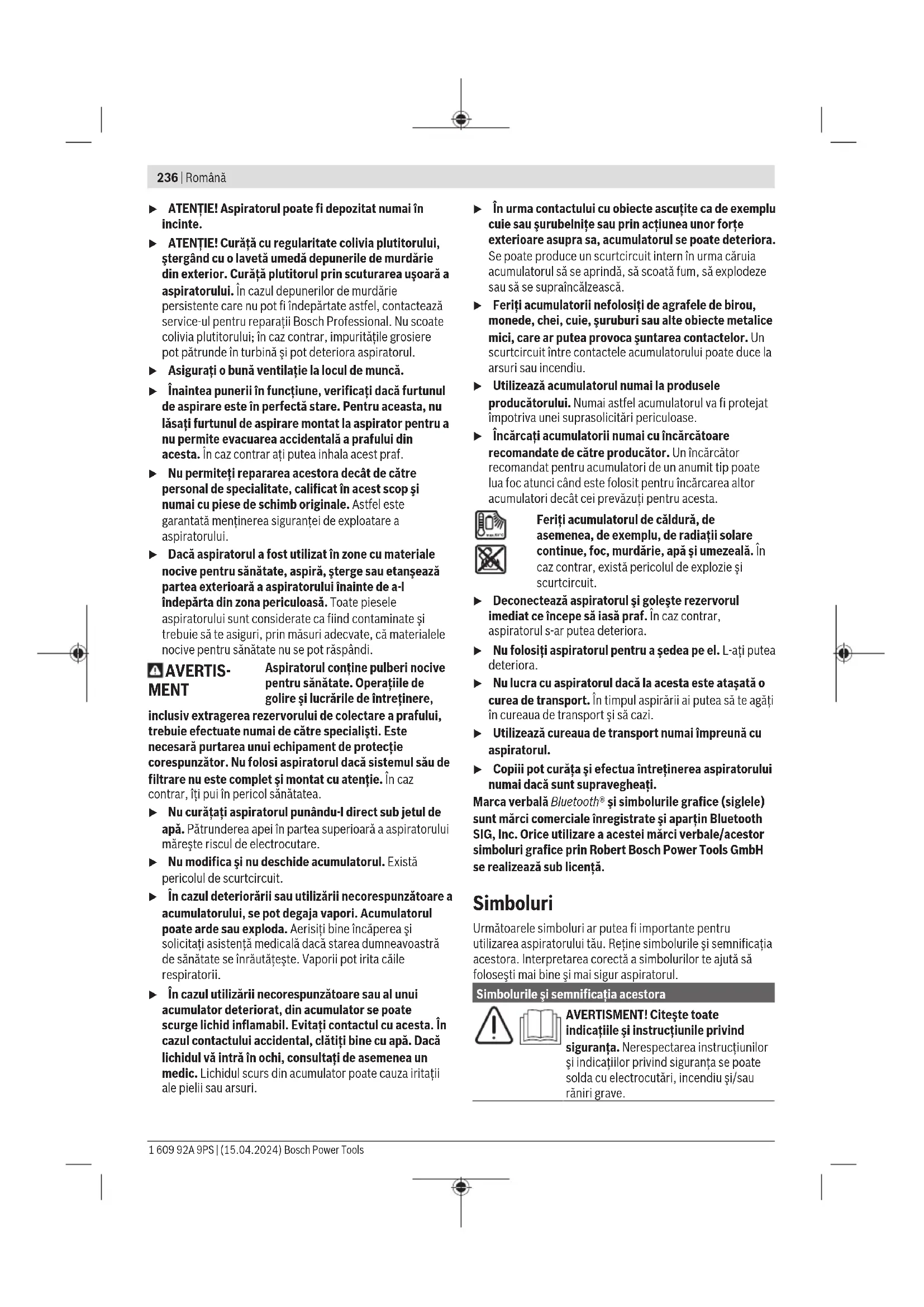 Қате жолмен кәдеге жаратылған ескі электрлік және электрондық құрылғылар қауіпті заттардың болу мүмкіндігіне байланысты қоршаған ортаға және адам денсаулығына зиянды әсер тигізуі мүмкін. Аккумуляторлар/батареялар: Литий-иондық: Тасымалдау бөліміндегі нұсқауларды орындаңыз (қараңыз „Тасымалдау“, Бет235). Română Instrucțiuni de siguranță pentru aspiratoare Citiţi toate indicaţiile şi instrucţiunile de siguranţă. Nerespectarea instrucţiunilor şi indicaţiilor de siguranţă poate provoca electrocutare, incendiu şi/sau răniri grave. Păstraţi toate instrucţiunile şi indicaţiile de siguranţă în vederea utilizărilor viitoare. u Acest aspirator nu este destinat utilizării de către copii şi de către persoane cu capacităţi fizice, senzoriale sau intelectuale limitate sau lipsite de experienţă şi cunoştinţe. În caz contrar există pericol de manevrare greşită şi răniri. u Supravegheaţi copiii. Astfel veţi avea siguranţa că, copiii nu se joacă cu aspiratorul. u Respectă toate prescripţiile privind siguranţa pentru materialele care urmează să fie aspirate. AVERTIS- MENT Nu aspiraţi niciodată materiale care conţin azbest. Azbestul este considerat a fi cancerigen. AVERTIS- MENT Folosiţi aspiratorul numai dacă aţi primit suficiente informaţii despre utilizarea acestuia, despre substanţele care urmează a fi aspirate şi privitor la eliminarea lor sigură. O instruire atentă diminuează posibilitatea manevrării greşite şi riscul de rănire. AVERTIS- MENT Aspiratorul este adecvat pentru aspirarea de subtanţe uscate iar, prin adoptarea de măsuri corespunzătoare, şi pentru aspirarea lichidelor. Pătrunderea lichidelor măreşte riscul de electrocutare. u Nu folosi aspiratorul pentru aspirarea lichidelor inflamabile sau explozive, de exemplu, benzină, ulei, alcool, solvenţi. Nu aspira pulberi fierbinţi, incandescente sau explozive. Nu folosi aspiratorul în spaţii cu pericol de explozie. Pulberile, vaporii sau lichidele se pot aprinde sau exploda. AVERTIS- MENT Opriţi imediat aspiratorul când din acesta se scurge spumă sau apă şi goliţi rezervorul. În caz contrar aspiratorul se poate defecta. Bosch Power Tools 1 609 92A 9PS | (15.04.2024)236 | Română u ATENŢIE! Aspiratorul poate fi depozitat numai în incinte. u ATENŢIE! Curăţă cu regularitate colivia plutitorului, ştergând cu o lavetă umedă depunerile de murdărie din exterior. Curăţă plutitorul prin scuturarea uşoară a aspiratorului. În cazul depunerilor de murdărie persistente care nu pot fi îndepărtate astfel, contactează service-ul pentru reparaţii Bosch Professional. Nu scoate colivia plutitorului; în caz contrar, impurităţile grosiere pot pătrunde în turbină şi pot deteriora aspiratorul. u Asiguraţi o bună ventilaţie la locul de muncă. u Înaintea punerii în funcţiune, verificaţi dacă furtunul de aspirare este în perfectă stare. Pentru aceasta, nu lăsaţi furtunul de aspirare montat la aspirator pentru a nu permite evacuarea accidentală a prafului din acesta. În caz contrar aţi putea inhala acest praf. u Nu permiteţi repararea acestora decât de către personal de specialitate, calificat în acest scop şi numai cu piese de schimb originale. Astfel este garantată menţinerea siguranţei de exploatare a aspiratorului. u Dacă aspiratorul a fost utilizat în zone cu materiale nocive pentru sănătate, aspiră, şterge sau etanşează partea exterioară a aspiratorului înainte de a-l îndepărta din zona periculoasă. Toate piesele aspiratorului sunt considerate ca fiind contaminate şi trebuie să te asiguri, prin măsuri adecvate, că materialele nocive pentru sănătate nu se pot răspândi. AVERTIS- MENT Aspiratorul conţine pulberi nocive pentru sănătate. Operaţiile de golire şi lucrările de întreţinere, inclusiv extragerea rezervorului de colectare a prafului, trebuie efectuate numai de către specialişti. Este necesară purtarea unui echipament de protecţie corespunzător. Nu folosi aspiratorul dacă sistemul său de filtrare nu este complet şi montat cu atenţie. În caz contrar, îţi pui în pericol sănătatea. u Nu curăţaţi aspiratorul punându-l direct sub jetul de apă. Pătrunderea apei în partea superioară a aspiratorului măreşte riscul de electrocutare. u Nu modifica şi nu deschide acumulatorul. Există pericolul de scurtcircuit. u În cazul deteriorării sau utilizării necorespunzătoare a acumulatorului, se pot degaja vapori. Acumulatorul poate arde sau exploda. Aerisiţi bine încăperea şi solicitaţi asistenţă medicală dacă starea dumneavoastră de sănătate se înrăutăţeşte. Vaporii pot irita căile respiratorii. u În cazul utilizării necorespunzătoare sau al unui acumulator deteriorat, din acumulator se poate scurge lichid inflamabil. Evitaţi contactul cu acesta. În cazul contactului accidental, clătiţi bine cu apă. Dacă lichidul vă intră în ochi, consultaţi de asemenea un medic. Lichidul scurs din acumulator poate cauza iritaţii ale pielii sau arsuri. u În urma contactului cu obiecte ascuţite ca de exemplu cuie sau şurubelniţe sau prin acţiunea unor forţe exterioare asupra sa, acumulatorul se poate deteriora. Se poate produce un scurtcircuit intern în urma căruia acumulatorul să se aprindă, să scoată fum, să explodeze sau să se supraîncălzească. u Feriţi acumulatorii nefolosiţi de agrafele de birou, monede, chei, cuie, şuruburi sau alte obiecte metalice mici, care ar putea provoca şuntarea contactelor. Un scurtcircuit între contactele acumulatorului poate duce la arsuri sau incendiu. u Utilizează acumulatorul numai la produsele producătorului. Numai astfel acumulatorul va fi protejat 