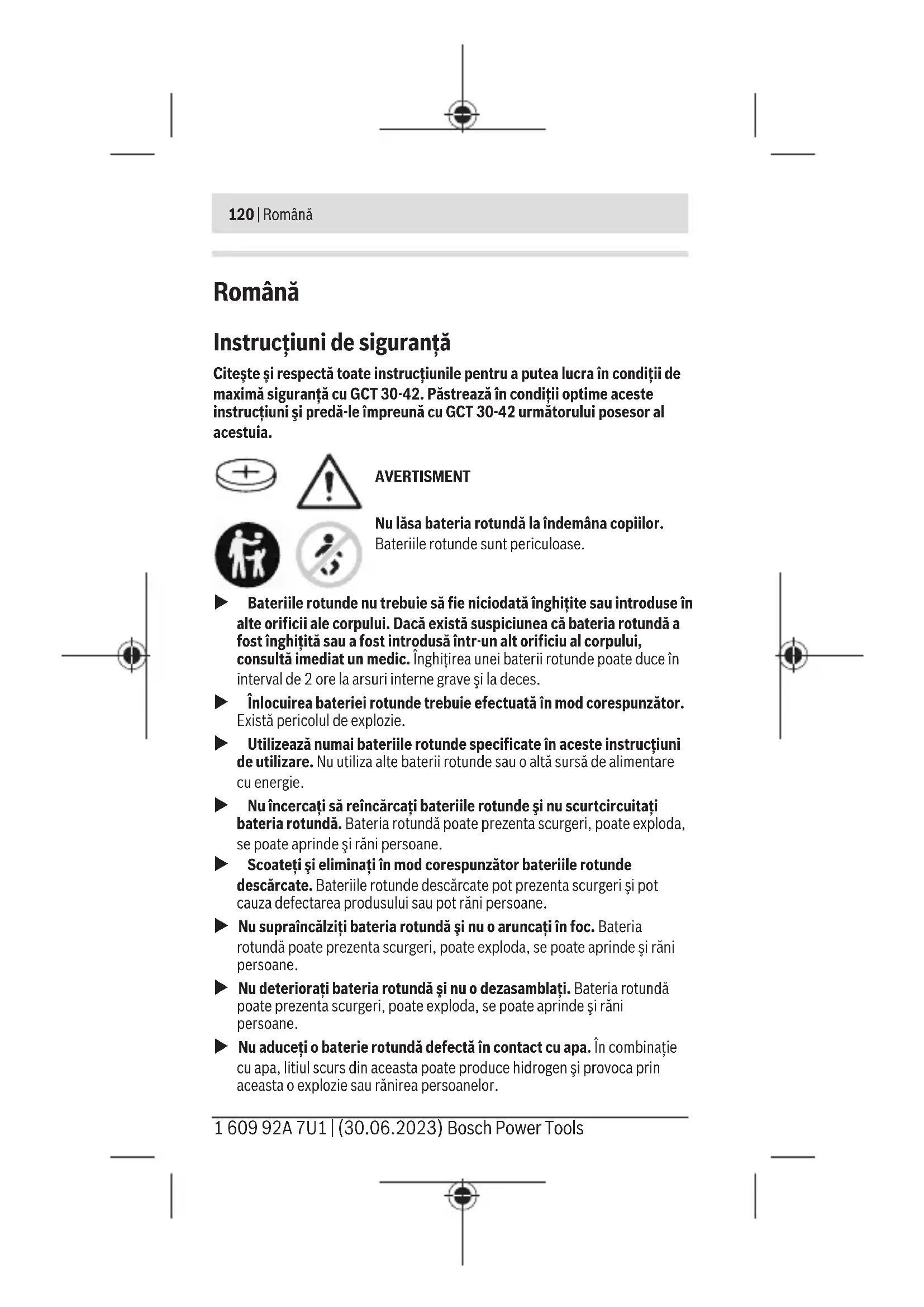 – пайдалану бойынша нұсқаулықта сатушының сату туралы белгісінің және сатып алушы қолтаңбасының бар болуы; – электр құралы сериялық нөмірінің және кепілдік талонындағы сериялық нөмірдің сәйкестігі; – біліксіз жөндеу белгілерінің жоқтығы. Кепілдік төмендегі жағдайларда қолданылмайды: – форс-мажор жағдайларына байланысты кез келген сынықтар; – барлық электр құралдарындағыдай электр құралының қалыпты тозуы. Жалғағыш контактілер, сымдар, қылшақтар және т.б. сияқты құрал бөліктерінің қызмет ету мерзімін қысқартатын қалыпты тозу нәтижесінде қажеттілігі туындаған жөндеу кепілдік аясына кірмейді: – табиғи тозу (ресурстың толық пайдаланылуы); – қате орнату, рұқсатсыз модификациялау, қате қолдану, қызмет көрсету немесе сақтау ережелерін бұзу нәтижесінде істен шыққан жабдық пен оның бөліктері; – электр құралына артық жүктеме түскеннен орын алған ақаулар. (Құралға артық жүктеме түсудің шартсыз белгілеріне мыналар жатады: құбылу түсінің пайда болуы немесе электр құралы бөліктері мен түйіндерінің деформациясы немесе қорытылуы, жоғары температура әсерінен электр қозғалтқышындағы сымдар оқшаулағышының қараюы немесе көмірленуі.) Кәдеге жарату Таратқыш модульді, керек-жарақтар мен орауыштарды қоршаған орта үшін қауіпсіз жолмен кәдеге жарату орнына тапсыру қажет. Электрондық бөлшектер мен батареяларды үй қоқысына тастамаңыз! Bosch Power Tools 1 609 92A 7U1 | (30.06.2023)120 | Română Română Instrucţiuni de siguranţă Citeşte şi respectă toate instrucţiunile pentru a putea lucra în condiţii de maximă siguranţă cuGCT 30-42. Păstrează în condiţii optime aceste instrucţiuni şi predă-le împreună cuGCT 30-42 următorului posesor al acestuia. AVERTISMENT Nu lăsa bateria rotundă la îndemâna copiilor. Bateriile rotunde sunt periculoase. u Bateriile rotunde nu trebuie să fie niciodată înghiţite sau introduse în alte orificii ale corpului. Dacă există suspiciunea că bateria rotundă a fost înghiţită sau a fost introdusă într-un alt orificiu al corpului, consultă imediat un medic. Înghiţirea unei baterii rotunde poate duce în interval de 2 ore la arsuri interne grave şi la deces. u Înlocuirea bateriei rotunde trebuie efectuată în mod corespunzător. Există pericolul de explozie. u Utilizează numai bateriile rotunde specificate în aceste instrucţiuni de utilizare. Nu utiliza alte baterii rotunde sau o altă sursă de alimentare cu energie. u Nu încercaţi să reîncărcaţi bateriile rotunde şi nu scurtcircuitaţi bateria rotundă. Bateria rotundă poate prezenta scurgeri, poate exploda, se poate aprinde şi răni persoane. u Scoateţi şi eliminaţi în mod corespunzător bateriile rotunde descărcate. Bateriile rotunde descărcate pot prezenta scurgeri şi pot cauza defectarea produsului sau pot răni persoane. u Nu supraîncălziţi bateria rotundă şi nu o aruncaţi în foc. Bateria rotundă poate prezenta scurgeri, poate exploda, se poate aprinde şi răni persoane. u Nu deterioraţi bateria rotundă şi nu o dezasamblaţi. Bateria rotundă poate prezenta scurgeri, poate exploda, se poate aprinde şi răni persoane. u Nu aduceţi o baterie rotundă defectă în contact cu apa. În combinație cu apa, litiul scurs din aceasta poate produce hidrogen şi provoca prin aceasta o explozie sau rănirea persoanelor. 1 609 92A 7U1 | (30.06.2023) Bosch Power ToolsRomână | 121 Marca verbală Bluetooth®, precum şi siglele sunt mărci înregistrate şi proprietatea Bluetooth SIG, Inc. Orice utilizare a acestei mărci verbale/ acestor sigle de către Robert Bosch Power Tools GmbH se realizează sub licenţă. Nu fixa niciodată modulul emiţător în locurile care sunt necesare pentru operarea sculei cu acumulator (deexemplu, suprafeţe de prindere, comutatoare, indicatoare). Descrierea produsului şi a performanţelor sale Utilizare conform destinaţiei Modulul emiţătorului GCT30-42 generează un semnal de pornire-oprire pentru un aspirator. Acest semnal poate fi transmis la un aspirator Bosch Professional cu funcţie de pornire automată sau la modulul receptorului GCA30-42. Pentru informaţii suplimentare, consultă instrucţiunile de utilizare a sistemului de pornire automată GCA30-42+GCT30-42 şi a aspiratorului utilizat. Componentele ilustrate Numerotarea componentelor ilustrate se referă la schiţele de la paginile grafice. (1) Modulul emiţătorului (2) Indicator de stare cu LED-uri (interfaţă pentru utilizator) (3) Tastă de pornire/oprire (interfaţă pentru utilizator) (4) Cârlig de fixare de pe banda din cauciuc (5) Bandă din cauciuc Date tehnice Modulul emiţătorului GCT30-42 Număr de identificare 1 600 A02 GH. Temperatură de funcţionare –20...+50°C Temperatură de depozitare –20...+65°C Dimensiuni