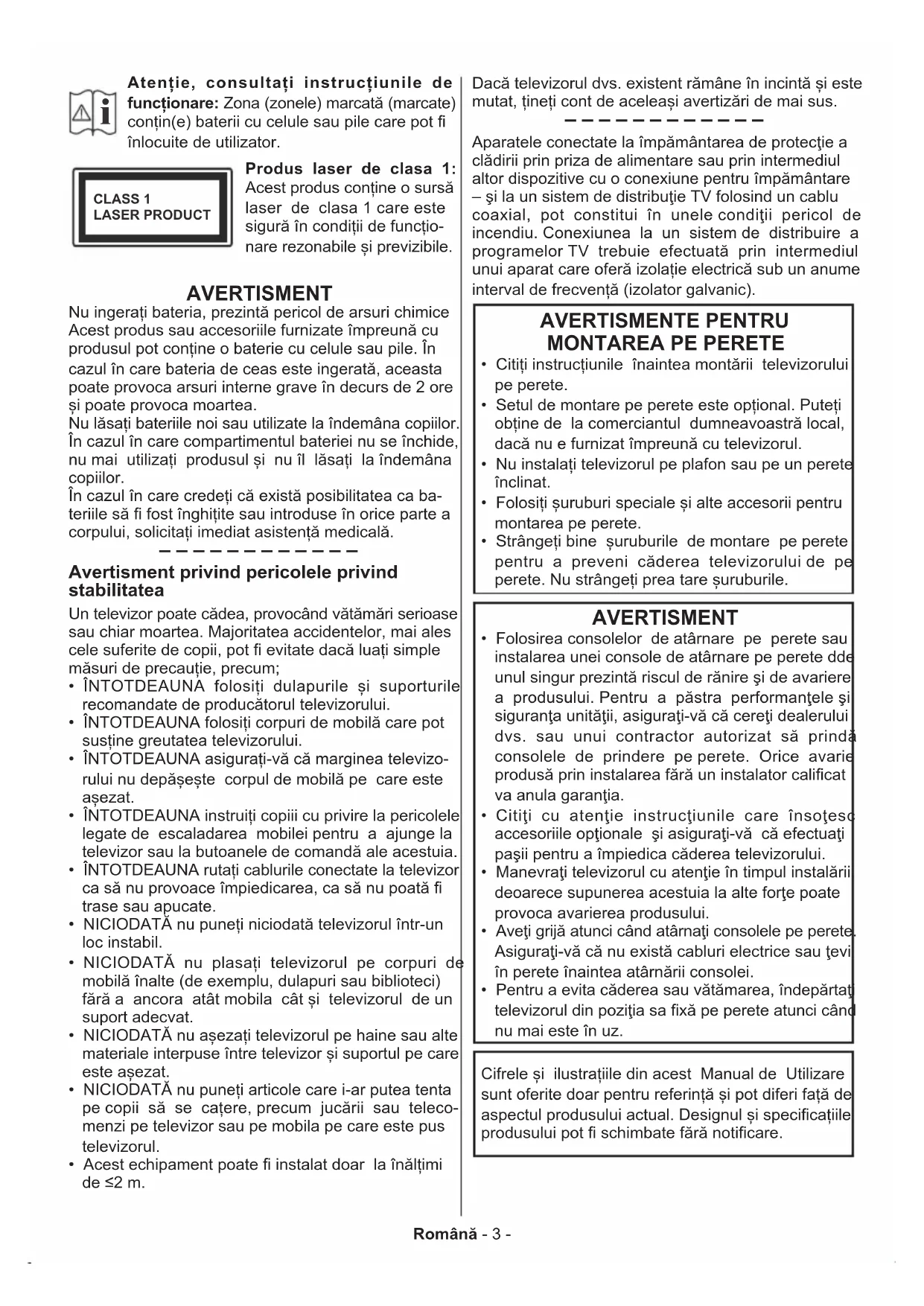 Atenție, consultați instrucțiunile de funcționare: Zona (zonele) marcată (marcate) conțin(e) baterii cu celule sau pile care pot înlocuite de utilizator. CLASS 1 LASER PRODUCT Produs laser de clasa 1: Acest produs conține o sursă laser de clasa 1 care este sigură în condiții de funcțio- nare rezonabile și previzibile. AVERTISMENT Nu ingerați bateria, prezintă pericol de arsuri chimice Acest produs sau accesoriile furnizate împreună cu produsul pot conține o baterie cu celule sau pile. În cazul în care bateria de ceas este ingerată, aceasta poate provoca arsuri interne grave în decurs de 2 ore și poate provoca moartea. Nu lăsați bateriile noi sau utilizate la îndemâna copiilor. În cazul în care compartimentul bateriei nu se închide, nu mai utilizați produsul și nu îl lăsați la îndemâna copiilor. În cazul în care credeți că există posibilitatea ca ba- teriile să fost înghițite sau introduse în orice parte a corpului, solicitați imediat asistență medicală. – – – – – – – – – – – – Avertisment privind pericolele privind stabilitatea Un televizor poate cădea, provocând vătămări serioase sau chiar moartea. Majoritatea accidentelor, mai ales cele suferite de copii, pot evitate dacă luați simple măsuri de precauție, precum;
