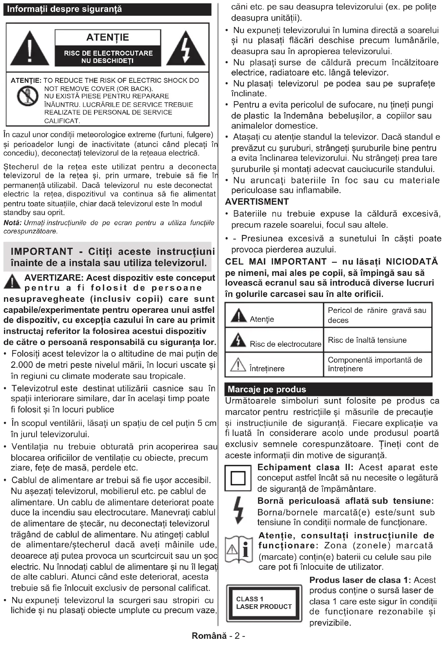 - Informații funcționare DVB Română - 2 - Informații despre siguranță ATENȚIE RISC DE ELECTROCUTARENU DESCHIDEȚIATENŢIE: TO REDUCE THE RISK OF ELECTRIC SHOCK DO NOT REMOVE COVER (OR BACK). NU EXISTĂ PIESE PENTRU REPARARE ÎNĂUNTRU. LUCRĂRILE DE SERVICE TREBUIE REALIZATE DE PERSONAL DE SERVICE CALIFICAT. Notă: Urmați instrucțiunile de pe ecran pentru a utiliza funcțiile corespunzătoare. În cazul unor condiții meteorologice extreme (furtuni, fulgere) și perioadelor lungi de inactivitate (atunci când plecați în concediu), deconectați televizorul de la rețeaua electrică. Ștecherul de la rețea este utilizat pentru a deconecta televizorul de la rețea și, prin urmare, trebuie să fie în permanență utilizabil. Dacă televizorul nu este deconectat electric la rețea, dispozitivul va continua să fie alimentat pentru toate situațiile, chiar dacă televizorul este în modul standby sau oprit. IMPORTANT - Citiți aceste instrucțiuni înainte de a instala sau utiliza televizorul. AVERTIZARE: Acest dispozitiv este conceput pentru a fi folosit de persoane nesupravegheate (inclusiv copii) care sunt capabile/experimentate pentru operarea unui astfel de dispozitiv, cu excepția cazului în care au primit instructaj referitor la folosirea acestui dispozitiv de către o persoană responsabilă cu siguranța lor. p. 43