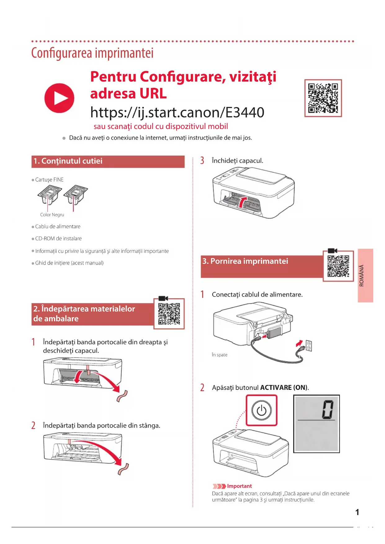 Apăsaţi butonul ACTIVARE (ON). ImportantDacă apare alt ecran, consultaţi „Dacă apare unul din ecranele următoare” la pagina 3 şi urmaţi instrucţiunile. Pentru Congurare, vizitaţi adresa URL https://ij.start.canon/E3440 sau scanaţi codul cu dispozitivul mobil
