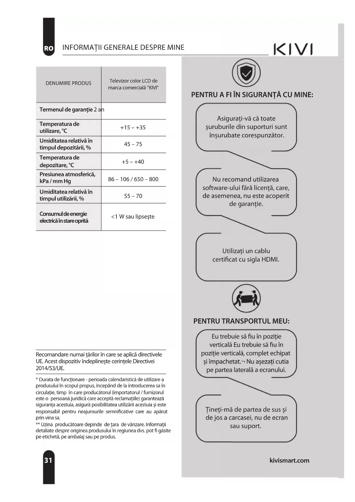 - Durata de funcţionare - perioada calendaristică de utilizare a produsului în scopul propus, începând de la introducerea sa în circulaţie, timp în care producătorul (importatorul / furnizorul este o persoană juridică care acceptă reclamaţiile) garantează siguranţa acestuia, asigură posibilitatea utilizării acestuia și este responsabil pentru neajunsurile semnificative care au apărut prin vina sa. ** Uzina producătoare depinde de ţara de vânzare. Informaţii detaliate despre originea produsului în regiunea dvs. pot fi găsite pe etichetă, pe ambalaj sau pe produs. Recomandare numai ţărilor în care se aplică directivele UE. Acest dispozitiv îndeplinește cerinţele Directivei 2014/53/UE. PENTRU TRANSPORTUL MEU: Eu trebuie să fiu în poziţie verticală Eu trebuie să fiu în poziţie verticală, complet echipat și împachetat.¬ Nu așezaţi cutia pe partea laterală a ecranului. Ţineţi-mă de partea de sus și de jos a carcasei, nu de ecran sau suport. Utilizaţi un cablu certificat cu sigla HDMI. Nu recomand utilizarea software-ului fără licenţă, care, de asemenea, nu este acoperit de garanţie. Asiguraţi-vă că toate șuruburile din suporturi sunt înșurubate corespunzător. PENTRU A FI ÎN SIGURANȚĂ CU MINE: DENUMIRE PRODUS Televizor color LCD de marca comercială ”KIVI” Termenul de garanție 2 an Temperatura de utilizare, °C +15 – +35 Umiditatea relativă în timpul depozitării, % 45 – 75 Temperatura de depozitare, °C +5 – +40 Presiunea atmosferică, kPa / mm Hg 86 – 106 / 650 – 800 Umiditatea relativă în timpul utilizării, % 55 – 70 Consumul de energie electrică în stare oprită <1 W sau lipseșteATENȚIE!