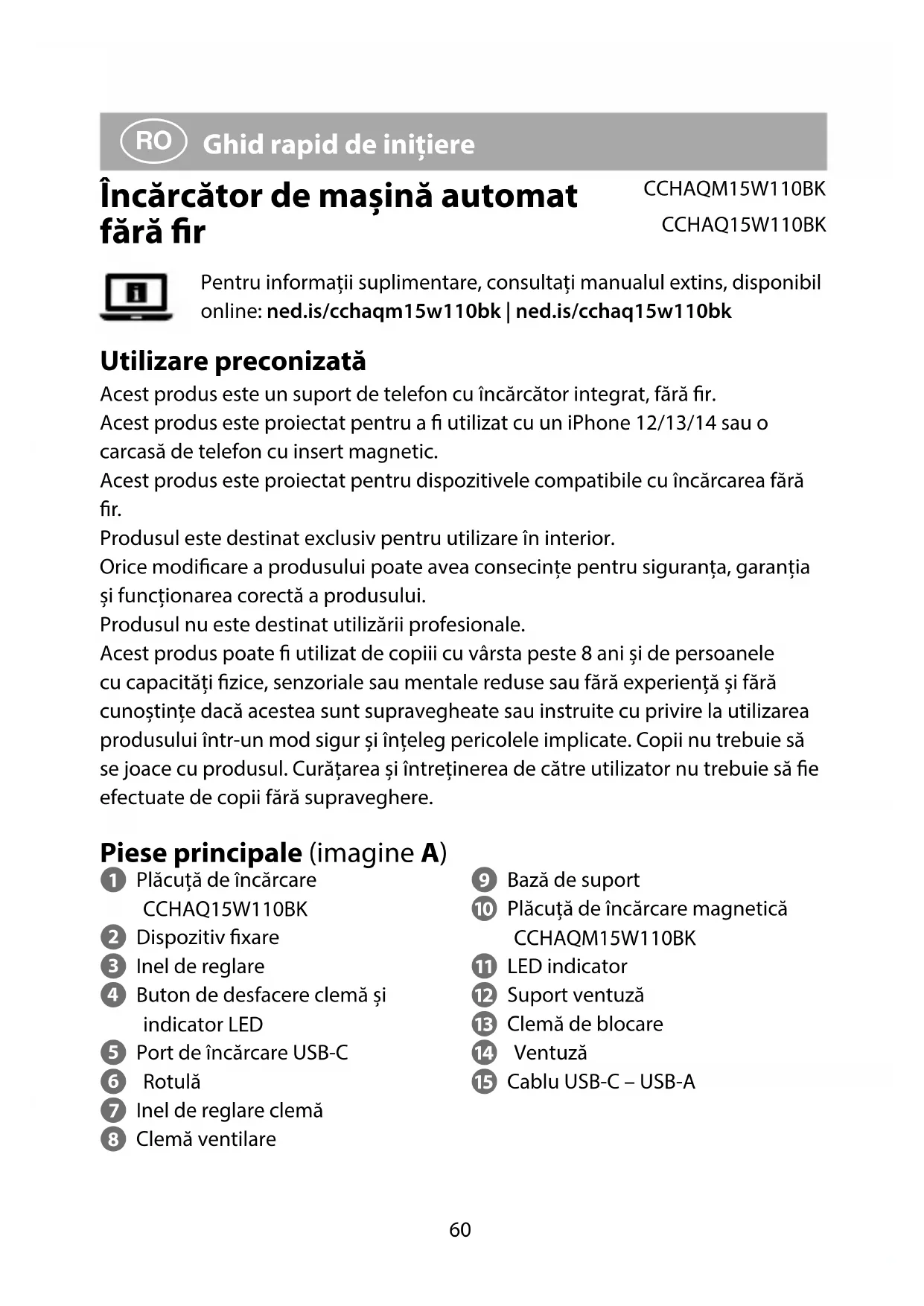 Pentru informații suplimentare, consultați manualul extins, disponibil online: ned.is/cchaqm15w110bk | ned.is/cchaq15w110bk Utilizare preconizată Acest produs este un suport de telefon cu încărcător integrat, fără r. Acest produs este proiectat pentru a utilizat cu un iPhone 12/13/14 sau o carcasă de telefon cu insert magnetic. Acest produs este proiectat pentru dispozitivele compatibile cu încărcarea fără