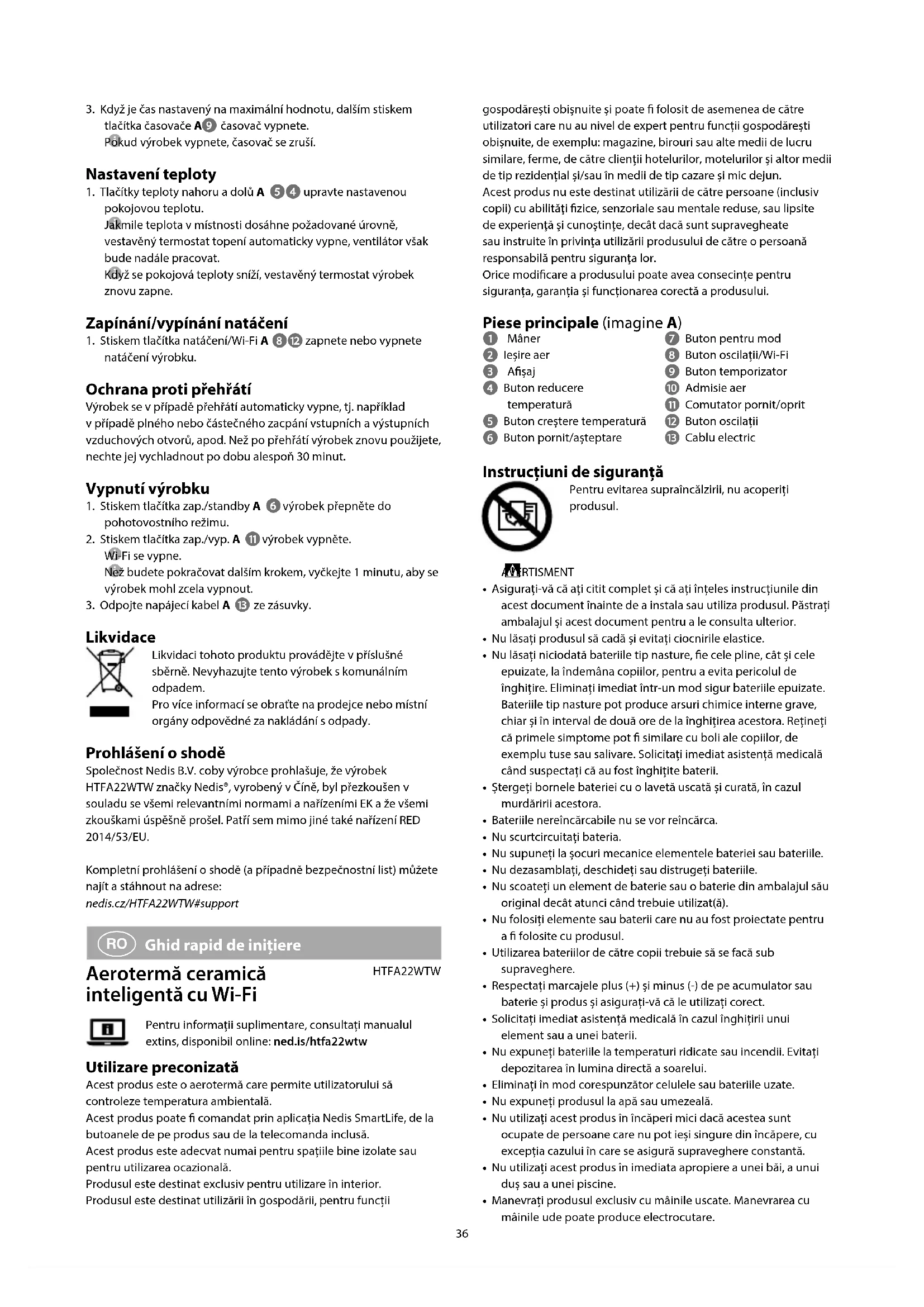 Ghid rapid de inițiere Aerotermă ceramică inteligentă cu Wi-Fi HTFA22WTWPentru informații suplimentare, consultați manualul extins, disponibil online: ned.is/htfa22wtw Utilizare preconizată Acest produs este o aerotermă care permite utilizatorului să controleze temperatura ambientală.Acest produs poate comandat prin aplicația Nedis SmartLife, de la butoanele de pe produs sau de la telecomanda inclusă.Acest produs este adecvat numai pentru spațiile bine izolate sau pentru utilizarea ocazională.Produsul este destinat exclusiv pentru utilizare în interior.Produsul este destinat utilizării în gospodării, pentru funcții37 Adăugarea unui produs în aplicația Nedis SmartLife