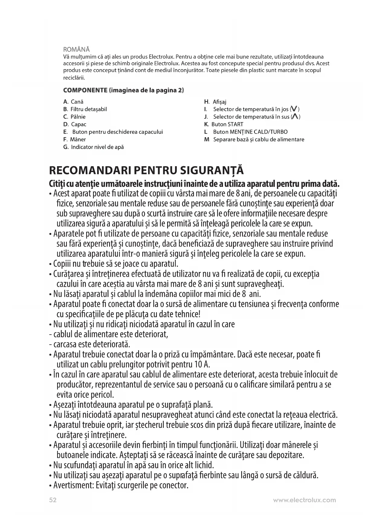 Aparatul se oprește înainte de erbere. S-a depus prea mult calcar la baza erbătorului. Efectuaţi procedura de decalciere. Aparatul nu se oprește. Închideţi capacul până se blochează Introduceţi sita corect. Aparatul nu poate pornit După ce a funcţionat cu puţină sau fără apă, aparatul nu s-a răcit sucient. Lăsaţi-l să se răcească puţin și încercaţi din nou. Așajul indică Codul de eroare (de ex. E3) Termostatul este supraîncălzit Opriţi aparatul pentru a se răci sau adăugaţi apă din nou Alarmă erbător butonul “START” are semnal luminos NTC este scurtcircuitat sau deconectat Returnaţi aparatul centrului de servicii Temperatura apei este mai mică decât setarea. Senzor ul de temperatură este acoperit cu impurităţi după ce erbătorul este folosit greșit, încălzind alte alimente/băuturi decât apa. Curăţaţi senzorul de temperatură, o piesă în formă de știft, situat în partea de jos a rezervorului interior al erbătorului. În cadrul programului TURBO, volumul apei este mai mare de 200 ml În programul TURBO, volumul apei este mai mic de 200 ml Reciclaţi materialele marcate cu simbolul . Pentru a recicla ambalajele, acestea trebuie puse în containerele corespunzătoare. Ajutaţi la protejarea mediului şi a sănătăţii umane şi la reciclarea deşeurilor din aparatele electrice şi electrocasnice. Nu aruncaţi aparatele marcate cu acest simbol împreună cu deşeurile menajere. Returnaţi produsul la centrul local de reciclare sau contactaţi administraţia oraşului dvs. INFORMAŢII PRIVIND MEDIUL55www.electrolux.com