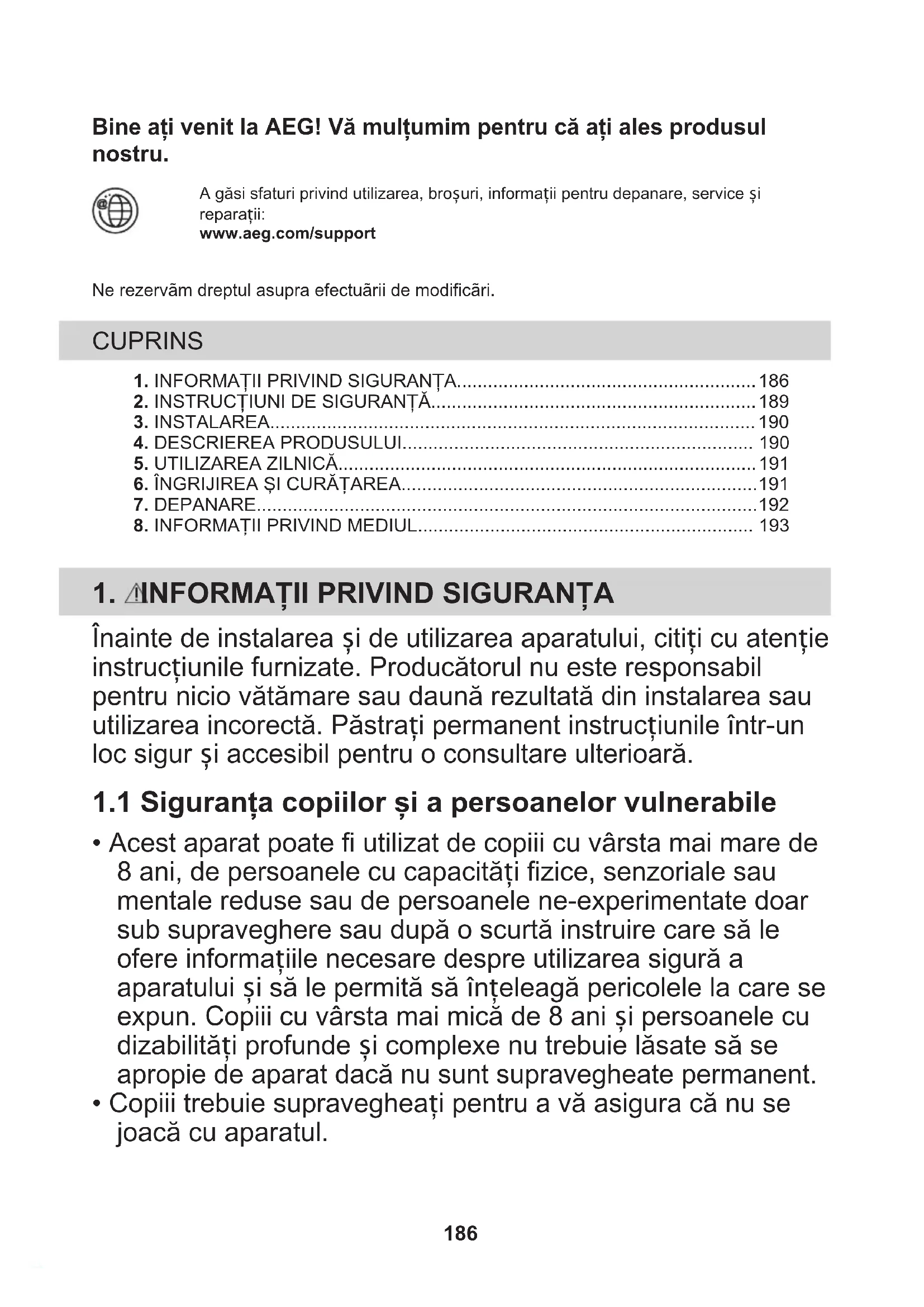 - Copiii trebuie supravegheați pentru a vă asigura că nu se joacă cu aparatul. 186• Nu lăsați ambalajele la îndemâna copiilor și aruncați-le conform reglementărilor.