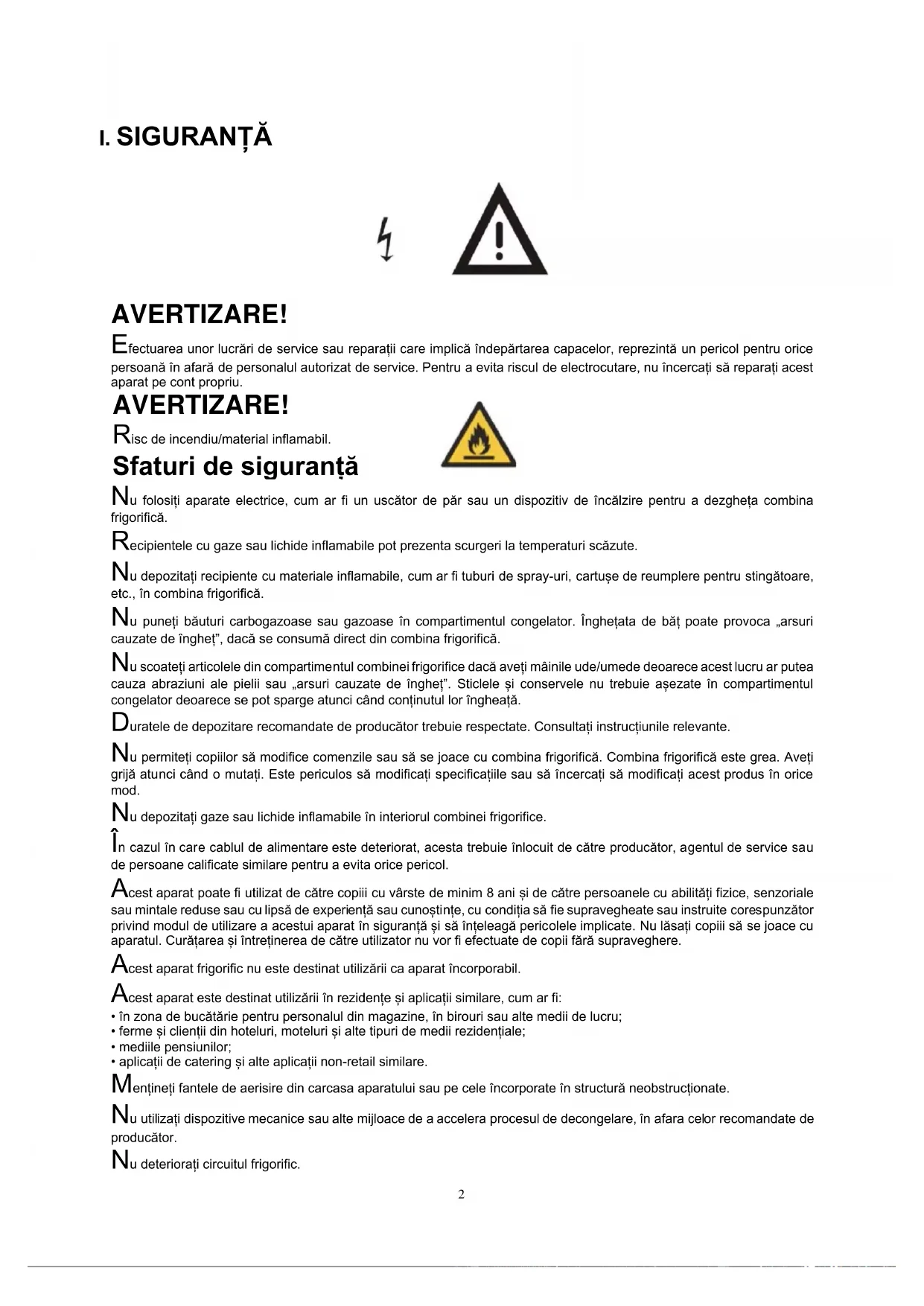 AVERTIZARE! Efectuarea unor lucrări de service sau reparații care implică îndepărtarea capacelor, reprezintă un pericol pentru orice persoană în afară de personalul autorizat de service. Pentru a evita riscul de electrocutare, nu încercați să reparați acest aparat pe cont propriu. AVERTIZARE! Risc de incendiu/material inflamabil. Sfaturi de siguranță Nu folosiți aparate electrice, cum ar fi un uscător de păr sau un dispozitiv de încălzire pentru a dezgheța combina frigorifică. Recipientele cu gaze sau lichide inflamabile pot prezenta scurgeri la temperaturi scăzute. Nu depozitați recipiente cu materiale inflamabile, cum ar fi tuburi de spray-uri, cartușe de reumplere pentru stingătoare, etc., în combina frigorifică. Nu puneți băuturi carbogazoase sau gazoase în compartimentul congelator. Înghețata de băț poate provoca „arsuri cauzate de îngheț”, dacă se consumă direct din combina frigorifică. Nu scoateți articolele din compartimentul combinei frigorifice dacă aveți mâinile ude/umede deoarece acest lucru ar putea cauza abraziuni ale pielii sau „arsuri cauzate de îngheț”. Sticlele și conservele nu trebuie așezate în compartimentul congelator deoarece se pot sparge atunci când conținutul lor îngheață. Duratele de depozitare recomandate de producător trebuie respectate. Consultați instrucțiunile relevante. Nu permiteți copiilor să modifice comenzile sau să se joace cu combina frigorifică. Combina frigorifică este grea. Aveți grijă atunci când o mutați. Este periculos să modificați specificațiile sau să încercați să modificați acest produs în orice mod. Nu depozitați gaze sau lichide inflamabile în interiorul combinei frigorifice. În cazul în care cablul de alimentare este deteriorat, acesta trebuie înlocuit de către producător, agentul de service sau de persoane calificate similare pentru a evita orice pericol. Acest aparat poate fi utilizat de către copiii cu vârste de minim 8 ani și de către persoanele cu abilități fizice, senzoriale sau mintale reduse sau cu lipsă de experiență sau cunoștințe, cu condiția să fie supravegheate sau instruite corespunzător privind modul de utilizare a acestui aparat în siguranță și să înțeleagă pericolele implicate. Nu lăsați copiii să se joace cu aparatul. Curățarea și întreținerea de către utilizator nu vor fi efectuate de copii fără supraveghere. Acest aparat frigorific nu este destinat utilizării ca aparat încorporabil. Acest aparat este destinat utilizării în rezidențe și aplicații similare, cum ar fi: