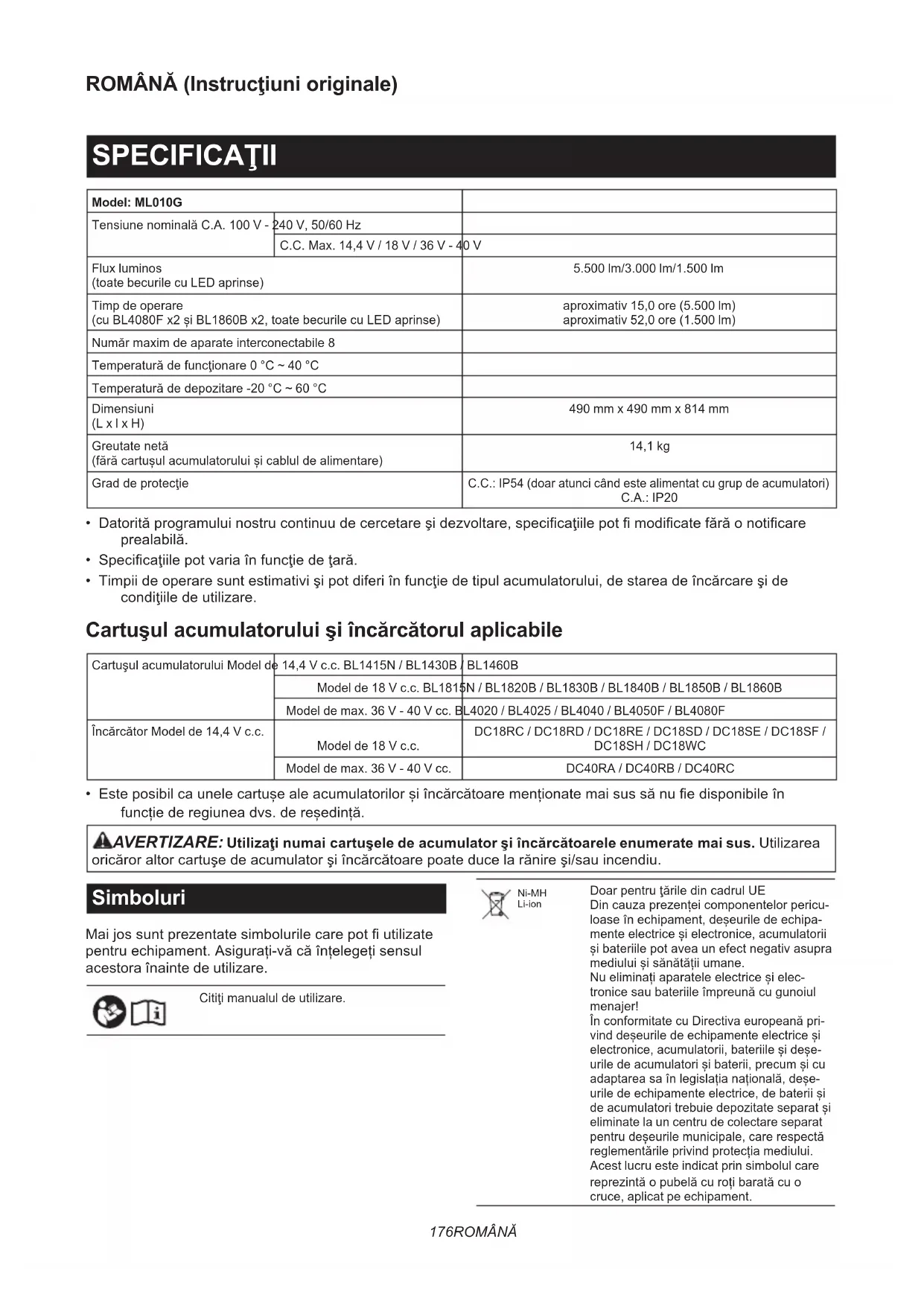 - Este posibil ca unele cartușe ale acumulatorilor și încărcătoare menționate mai sus să nu e disponibile în funcție de regiunea dvs. de reședință. AVERTIZARE: Utilizaţi numai cartuşele de acumulator şi încărcătoarele enumerate mai sus. Utilizarea oricăror altor cartuşe de acumulator şi încărcătoare poate duce la rănire şi/sau incendiu. Simboluri Mai jos sunt prezentate simbolurile care pot utilizate pentru echipament. Asigurați-vă că înțelegeți sensul acestora înainte de utilizare. Citiţi manualul de utilizare. Ni-MH Li-ion Doar pentru ţările din cadrul UE Din cauza prezenței componentelor pericu- loase în echipament, deșeurile de echipa- mente electrice și electronice, acumulatorii și bateriile pot avea un efect negativ asupra mediului și sănătății umane. Nu eliminați aparatele electrice și elec- tronice sau bateriile împreună cu gunoiul menajer! În conformitate cu Directiva europeană pri- vind deșeurile de echipamente electrice și electronice, acumulatorii, bateriile și deșe- urile de acumulatori și baterii, precum și cu adaptarea sa în legislația națională, deșe- urile de echipamente electrice, de baterii și de acumulatori trebuie depozitate separat și eliminate la un centru de colectare separat pentru deșeurile municipale, care respectă reglementările privind protecția mediului. Acest lucru este indicat prin simbolul care reprezintă o pubelă cu roți barată cu o cruce, aplicat pe echipament.177 ROMÂNĂ Acordaţi atenţie şi grijă deosebită.Radiaţie optică (UV şi IR).Expuneţi cât mai puţin ochii sau pielea.Nu priviţi direct către lampa aprinsă.Utilizaţi o ecranare sau un echipament de protecţie a ochilor corespunzător.Nu utilizați aparatul în condiții de ploaie, de zăpadă, de umiditate sau de umezeală cu sursa de alimentare cu c.a.Buton de repornire a întrerupătorului de circuit. Observație Acest produs conține surse de lumină din clasele de eciență energetică <C> și <D>. Sursă de alimentare Maşina se va alimenta de la o sursă de curent alternativ monofazat, cu tensiunea egală cu cea indicată pe plă- cuţa de identicare a maşinii. Această maşină trebuie să e împământată atunci când este utilizată, pentru a proteja utilizatorul împotriva electrocutării. Folosiţi doar cabluri de extensie cu trei conductoare cu prize tripolare care corespund cu mufa maşinii.
