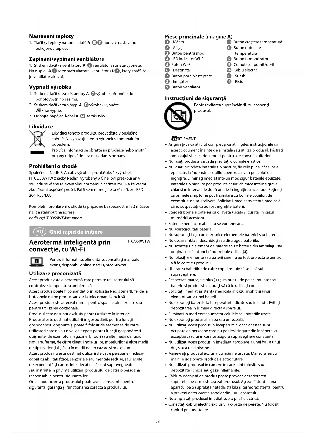 Ghid rapid de inițiere Aerotermă inteligentă prin convecție, cu Wi-Fi HTCO50WTWPentru informații suplimentare, consultați manualul extins, disponibil online: ned.is/htco50wtw Utilizare preconizată Acest produs este o aerotermă care permite utilizatorului să controleze temperatura ambientală.Acest produs poate comandat prin aplicația Nedis SmartLife, de la butoanele de pe produs sau de la telecomanda inclusă.Acest produs este adecvat numai pentru spațiile bine izolate sau pentru utilizarea ocazională.Produsul este destinat exclusiv pentru utilizare în interior.Produsul este destinat utilizării în gospodării, pentru funcții gospodărești obișnuite și poate folosit de asemenea de către utilizatori care nu au nivel de expert pentru funcții gospodărești obișnuite, de exemplu: magazine, birouri sau alte medii de lucru similare, ferme, de către clienții hotelurilor, motelurilor și altor medii de tip rezidențial și/sau în medii de tip cazare și mic dejun.Acest produs nu este destinat utilizării de către persoane (inclusiv copii) cu abilităţi zice, senzoriale sau mentale reduse, sau lipsite de experienţă şi cunoştinţe, decât dacă sunt supravegheate sau instruite în privinţa utilizării produsului de către o persoană responsabilă pentru siguranţa lor.Orice modicare a produsului poate avea consecințe pentru siguranța, garanția și funcționarea corectă a produsului.40 Adăugarea unui produs în aplicația Nedis SmartLife