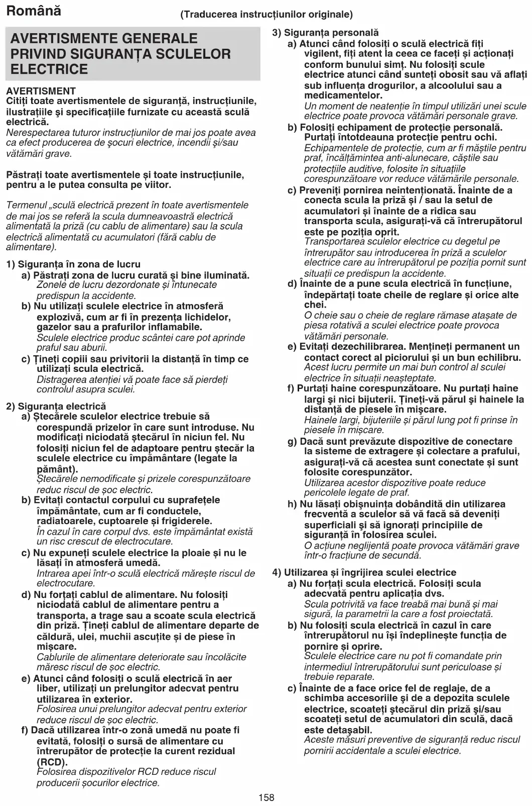 ELECTRICE AVERTISMENT Citiţi toate avertismentele de siguranţă, instrucţiunile, ilustraţiile şi specificaţiile furnizate cu această sculă electrică. Nerespectarea tuturor instrucţiunilor de mai jos poate avea ca efect producerea de şocuri electrice, incendii şi/sau vătămări grave. Păstraţi toate avertismentele și toate instrucţiunile, pentru a le putea consulta pe viitor. Termenul „sculă electrică prezent în toate avertismentele de mai jos se referă la scula dumneavoastră electrică alimentată la priză (cu cablu de alimentare) sau la scula electrică alimentată cu acumulatori (fără cablu de alimentare).