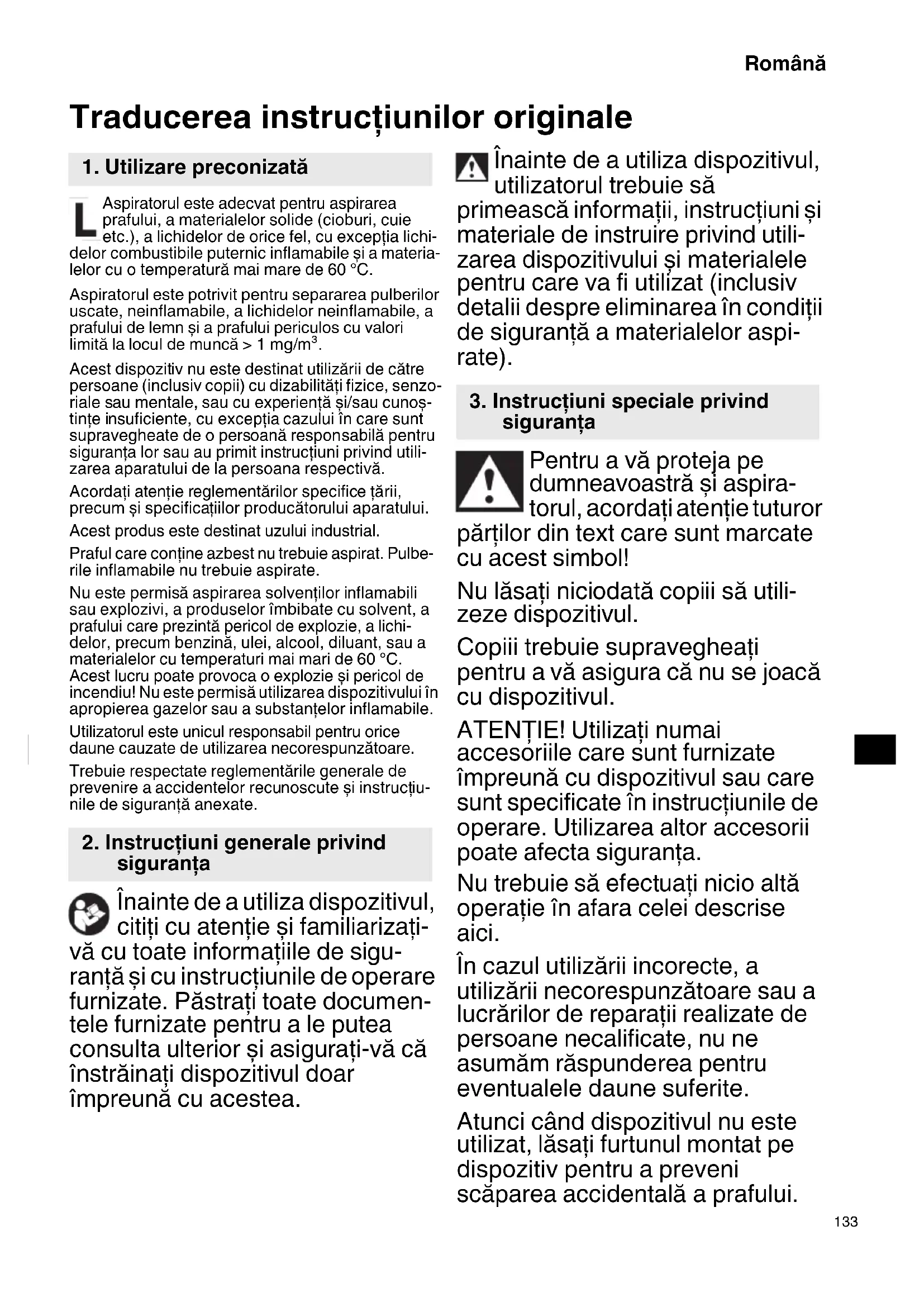 Sadece AB ülkeleri için Elektrikli aletleri evdeki çöp kutusuna atmayın! Kullanım ömrünü dolduran elektrikli aletler, atık elektrikli ve elektronik cihazlarla ilgili 2012/19/AB Avrupa Direktifi ne ve bu Direktifi n ulusal kanunlar çerçevesinde uygulanma şekline göre ayrı olarak toplanmalı ve çevre şartlarına uygun bir geri dönüşüm tesisine gönderilmelidir. GARANTİ HiKOKI Elektrikli El Aletlerine yasalar / ülkelere özgü mevzuatlar çerçevesinde garanti veriyoruz. Bu garanti, yanlış veya kötü kullanımdan veya normal aşınma ve yıpranmadan kaynaklanan arıza ve hasarları kapsamamaktadır. Şikayet durumunda, lütfen Elektrikli El Aletini, sökülmemiş şekilde, bu Kullanım Kılavuzu’nun sonunda bulunan GARANTİ BELGESİYLE birlikte bir HiKOKI Yetkili Servis Merkezi’ne gönderin. Havadan yayılan gürültü ilgili bilgiler Ölçülen değerler EN60335-2-69’e göre belirlenmiş ve ISO 4871’e göre beyan edilmiştir. Ölçülmüş A-ağırlıklı ses basıncı seviyesi: 69 dB (A) Belirsizlik K: 2 dB (A) Kulak koruyucu takın. Çalışma sırasında gürültü seviyesi 80 dB(A) değerini aşabilir. NOT HiKOKI’nin sürekli araştırma ve geliştirme çalışmaları nedeniyle, burada belirtilen teknik özelliklerde önceden haber verilmeden değişiklik yapılabilir. RP350YBL_C99749971_305.book 132 ページ 2023年4月6日 木曜日 午後1時6分133 Română Traducerea instrucţiunilor originale Aspiratorul este adecvat pentru aspirarea prafului, a materialelor solide (cioburi, cuie etc.), a lichidelor de orice fel, cu excepţia lichi- delor combustibile puternic inflamabile și a materia- lelor cu o temperatură mai mare de 60 °C. Aspiratorul este potrivit pentru separarea pulberilor uscate, neinflamabile, a lichidelor neinflamabile, a prafului de lemn și a prafului periculos cu valori limită la locul de muncă > 1 mg/m³. Acest dispozitiv nu este destinat utilizării de către persoane (inclusiv copii) cu dizabilităţi fizice, senzo- riale sau mentale, sau cu experienţă și/sau cunoș- tinţe insuficiente, cu excepţia cazului în care sunt supravegheate de o persoană responsabilă pentru siguranţa lor sau au primit instrucţiuni privind utili- zarea aparatului de la persoana respectivă. Acordaţi atenţie reglementărilor specifice ţării, precum și specificaţiilor producătorului aparatului. Acest produs este destinat uzului industrial. Praful care conţine azbest nu trebuie aspirat. Pulbe- rile inflamabile nu trebuie aspirate. Nu este permisă aspirarea solvenţilor inflamabili sau explozivi, a produselor îmbibate cu solvent, a prafului care prezintă pericol de explozie, a lichi- delor, precum benzină, ulei, alcool, diluant, sau a materialelor cu temperaturi mai mari de 60 °C. Acest lucru poate provoca o explozie și pericol de incendiu! Nu este permisă utilizarea dispozitivului în apropierea gazelor sau a substanţelor inflamabile. Utilizatorul este unicul responsabil pentru orice daune cauzate de utilizarea necorespunzătoare. Trebuie respectate reglementările generale de prevenire a accidentelor recunoscute și instrucţiu- nile de siguranţă anexate. Înainte de a utiliza dispozitivul, citiţi cu atenţie și familiarizaţi- vă cu toate informaţiile de sigu- ranţă și cu instrucţiunile de operare furnizate. Păstraţi toate documen- tele furnizate pentru a le putea consulta ulterior și asiguraţi-vă că înstrăinaţi dispozitivul doar împreună cu acestea. Înainte de a utiliza dispozitivul, utilizatorul trebuie să primească informaţii, instrucţiuni și materiale de instruire privind utili- zarea dispozitivului și materialele pentru care va fi utilizat (inclusiv detalii despre eliminarea în condiţii de siguranţă a materialelor aspi- rate). Pentru a vă proteja pe dumneavoastră și aspira- torul, acordaţi atenţie tuturor părţilor din text care sunt marcate cu acest simbol! Nu lăsaţi niciodată copiii să utili- zeze dispozitivul. Copiii trebuie supravegheaţi pentru a vă asigura că nu se joacă cu dispozitivul. ATENŢIE! Utilizaţi numai accesoriile care sunt furnizate împreună cu dispozitivul sau care sunt specificate în instrucţiunile de operare. Utilizarea altor accesorii poate afecta siguranţa. Nu trebuie să efectuaţi nicio altă operaţie în afara celei descrise aici. În cazul utilizării incorecte, a utilizării necorespunzătoare sau a lucrărilor de reparaţii realizate de persoane necalificate, nu ne asumăm răspunderea pentru eventualele daune suferite. Atunci când dispozitivul nu este utilizat, lăsaţi furtunul montat pe dispozitiv pentru a preveni scăparea accidentală a prafului.