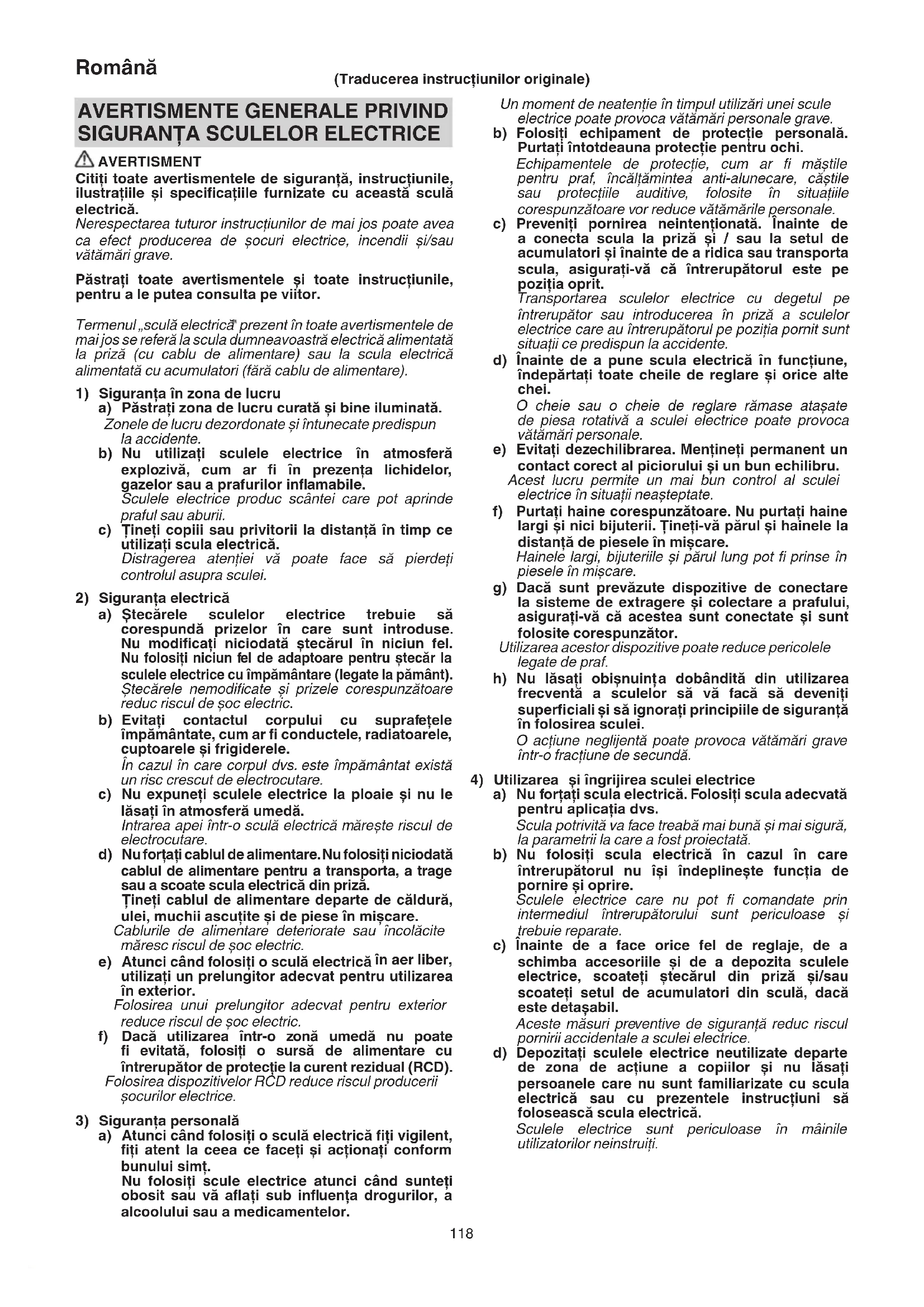 AVERTISMENT Citiţi toate avertismentele de siguranţă, instrucţiunile, ilustraţiile și specifi caţiile furnizate cu această sculă electrică. Nerespectarea tuturor instrucţiunilor de mai jos poate avea ca efect producerea de șocuri electrice, incendii și/sau vătămări grave. Păstraţi toate avertismentele și toate instrucţiunile, pentru a le putea consulta pe viitor. Termenul „sculă electrică prezent în toate avertismentele de mai jos se referă la scula dumneavoastră electrică alimentată la priză (cu cablu de alimentare) sau la scula electrică alimentată cu acumulatori (fără cablu de alimentare).