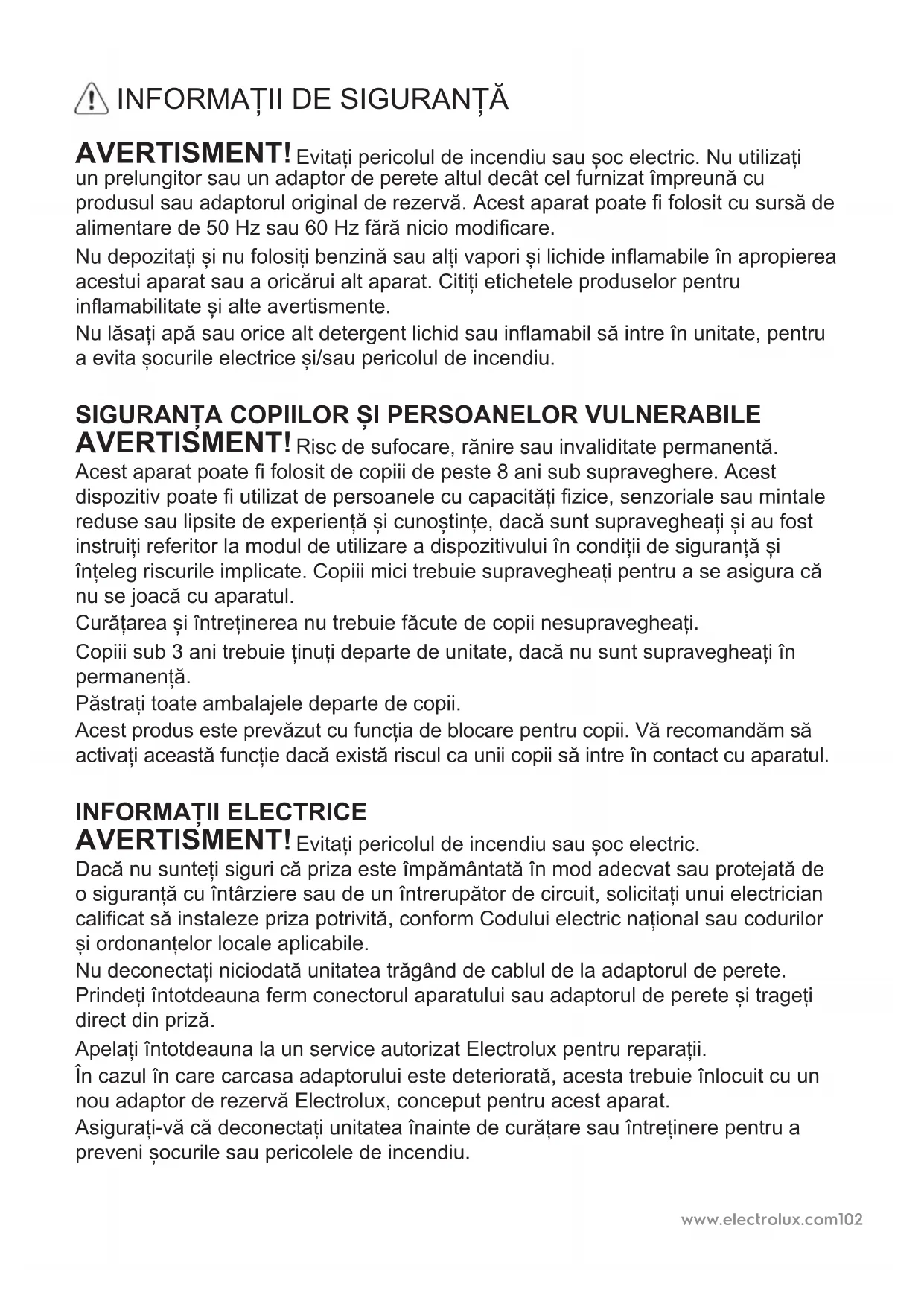 AVERTISMENT! Evitați pericolul de incendiu sau șoc electric. Dacă nu sunteți siguri că priza este împământată în mod adecvat sau protejată de o siguranță cu întârziere sau de un întrerupător de circuit, solicitați unui electrician calicat să instaleze priza potrivită, conform Codului electric național sau codurilor și ordonanțelor locale aplicabile. Nu deconectați niciodată unitatea trăgând de cablul de la adaptorul de perete. Prindeți întotdeauna ferm conectorul aparatului sau adaptorul de perete și trageți direct din priză. Apelați întotdeauna la un service autorizat Electrolux pentru reparații. În cazul în care carcasa adaptorului este deteriorată, acesta trebuie înlocuit cu un nou adaptor de rezervă Electrolux, conceput pentru acest aparat. Asigurați-vă că deconectați unitatea înainte de curățare sau întreținere pentru a preveni șocurile sau pericolele de incendiu.www.electrolux.com 103