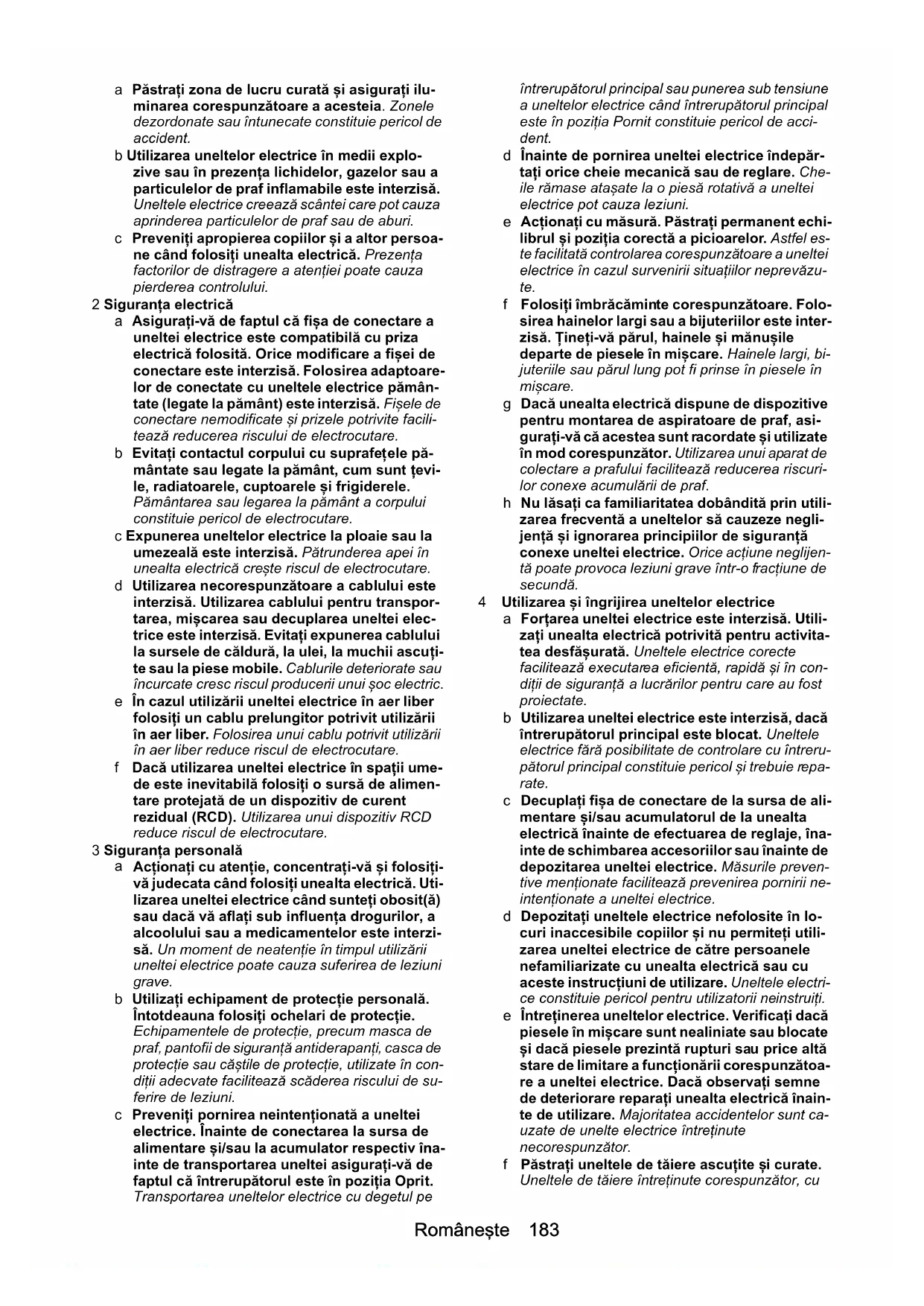 - Declaraţie de conformitate UE Româneşte 183 a Păstrați zona de lucru curată și asigurați ilu- minarea corespunzătoare a acesteia. Zonele dezordonate sau întunecate constituie pericol de accident. b Utilizarea uneltelor electrice în medii explo- zive sau în prezența lichidelor, gazelor sau a particulelor de praf inflamabile este interzisă. Uneltele electrice creează scântei care pot cauza aprinderea particulelor de praf sau de aburi. c Preveniți apropierea copiilor și a altor persoa- ne când folosiți unealta electrică. Prezența factorilor de distragere a atenției poate cauza pierderea controlului. 2 Siguranța electrică a Asigurați-vă de faptul că fișa de conectare a uneltei electrice este compatibilă cu priza electrică folosită. Orice modificare a fișei de conectare este interzisă. Folosirea adaptoare- lor de conectate cu uneltele electrice pămân- tate (legate la pământ) este interzisă. Fișele de conectare nemodificate și prizele potrivite facili- tează reducerea riscului de electrocutare. b Evitați contactul corpului cu suprafeț ele pă- mântate sau legate la pământ, cum sunt țevi- le, radiatoarele, cuptoarele și frigiderele. Pământarea sau legarea la pământ a corpului constituie pericol de electrocutare. c Expunerea uneltelor electrice la ploaie sau la umezeală este interzisă. Pătrunderea apei în unealta electrică crește riscul de electrocutare. d Utilizarea necorespunzătoare a cablului este interzisă. Utilizarea cablului pentru transpor- tarea, mișcarea sau decuplarea uneltei elec- trice este interzisă. Evitați expunerea cablului la sursele de căldură, la ulei, la muchii ascuți- te sau la piese mobile. Cablurile deteriorate sau încurcate cresc riscul producerii unui șoc electric. e În cazul utilizării uneltei electrice în aer liber folosiți un cablu prelungitor potrivit utilizării în aer liber. Folosirea unui cablu potrivit utilizării în aer liber reduce riscul de electrocutare. f Dacă utilizarea uneltei electrice în spații ume- de este inevitabilă folosiți o sursă de alimen- tare protejată de un dispozitiv de curent rezidual (RCD). Utilizarea unui dispozitiv RCD reduce riscul de electrocutare. 3 Siguranța personală p. 192
