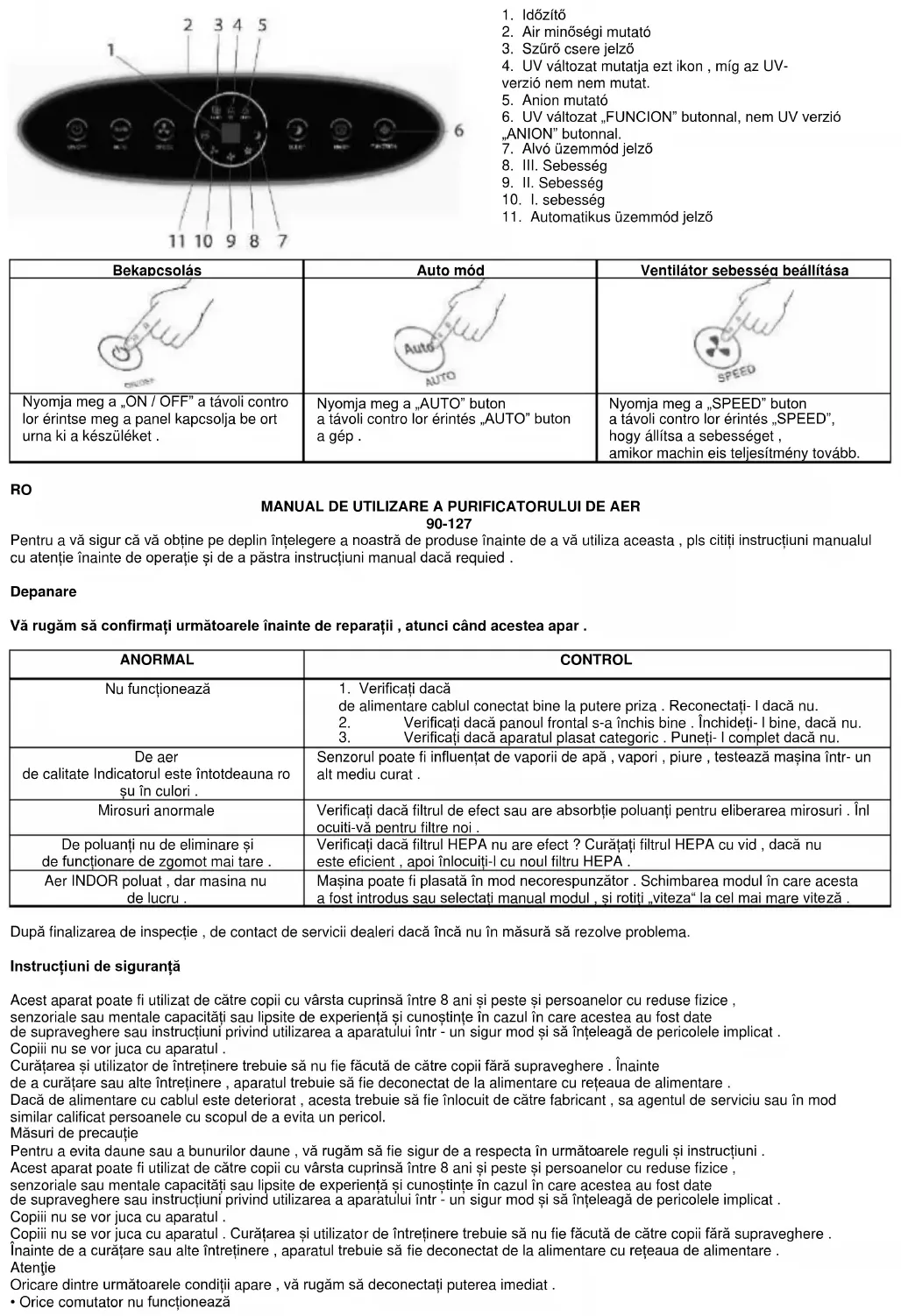 MANUAL DE UTILIZARE A PURIFICATORULUI DE AER 90-127 Pentru a vă sigur că vă obține pe deplin înțelegere a noastră de produse înainte de a vă utiliza aceasta , pls citiți instrucțiuni manualul cu atenție înainte de operație și de a păstra instrucțiuni manual dacă requied . Depanare Vă rugăm să confirmați următoarele înainte de reparații , atunci când acestea apar . ANORMAL CONTROL Nu funcționează