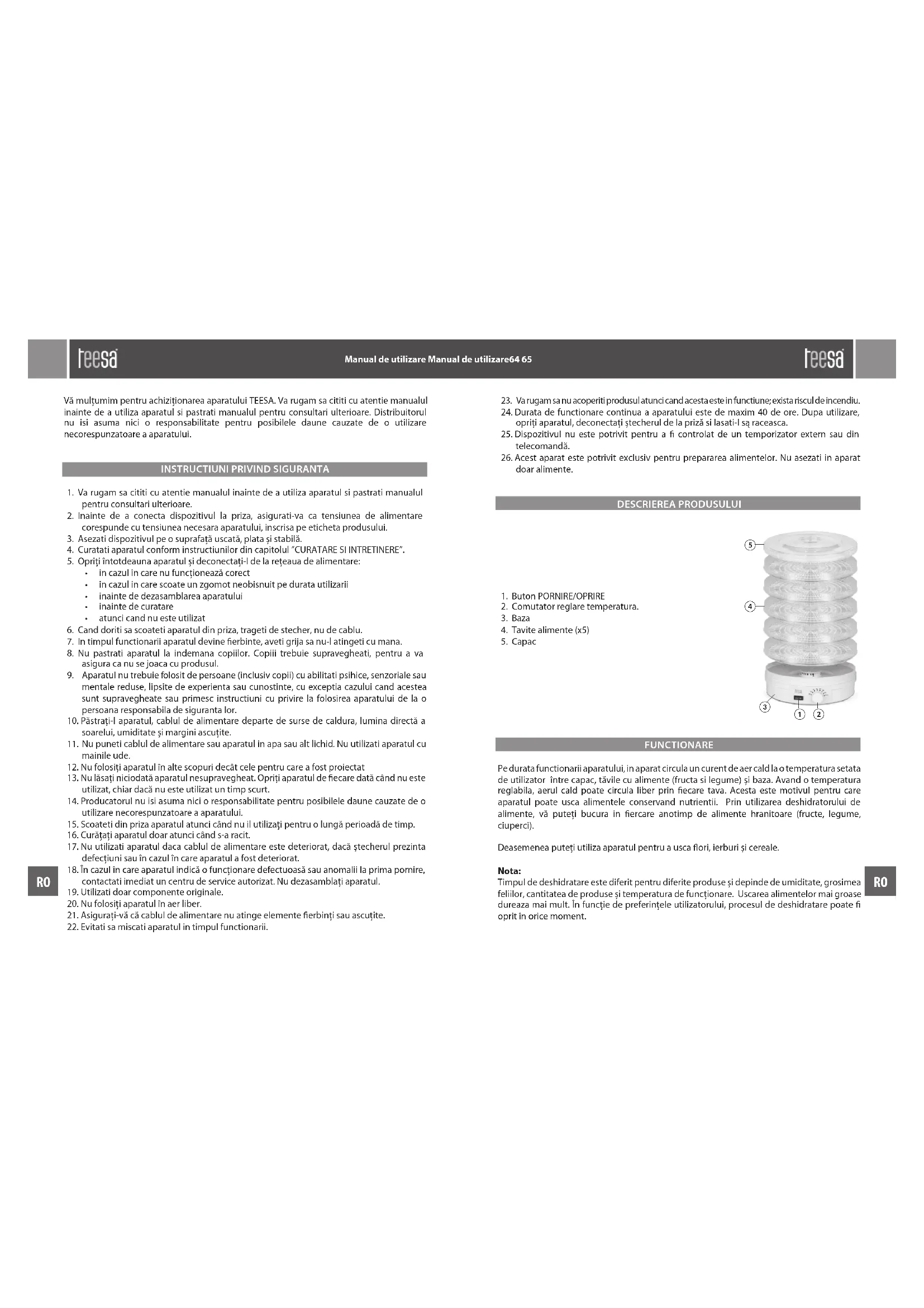 TSA3030 - Deshidrator alimentar Teesa - Manual de utilizare gratuit