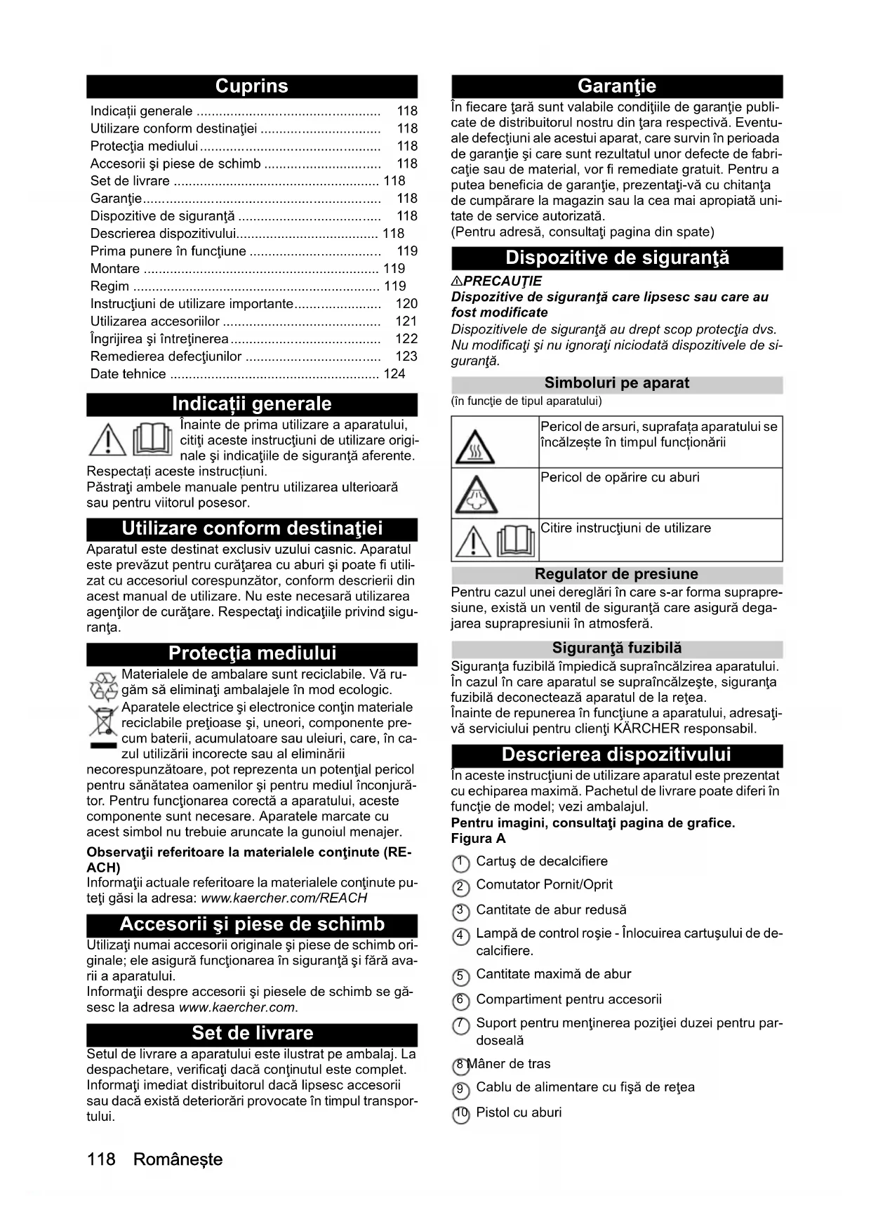 Ciągłe wytwarzanie pary g/min 40 40 Maksymalne uderzenie pary g/min 100 100 Ilość napełnienia Zbiornik wody l 1,0 1,0 Wymiary i masa Ciężar (bez akcesoriów) kg 3,3 3,3 Długość mm 361 361 Szerokość mm 250 250 Wysokość mm 282 282118 Româneşte Cuprins Indicații generale Înainte de prima utilizare a aparatului, citiţi aceste instrucţiuni de utilizare origi- nale şi indicaţiile de siguranţă aferente. Respectați aceste instrucțiuni. Păstraţi ambele manuale pentru utilizarea ulterioară sau pentru viitorul posesor. Utilizare conform destinaţiei Aparatul este destinat exclusiv uzului casnic. Aparatul este prevăzut pentru curăţarea cu aburi şi poate fi utili- zat cu accesoriul corespunzător, conform descrierii din acest manual de utilizare. Nu este necesară utilizarea agenţilor de curăţare. Respectaţi indicaţiile privind sigu- ranţa. Protecţia mediului Materialele de ambalare sunt reciclabile. Vă ru- găm să eliminaţi ambalajele în mod ecologic. Aparatele electrice şi electronice conţin materiale reciclabile preţioase şi, uneori, componente pre- cum baterii, acumulatoare sau uleiuri, care, în ca- zul utilizării incorecte sau al eliminării necorespunzătoare, pot reprezenta un potenţial pericol pentru sănătatea oamenilor şi pentru mediul înconjură- tor. Pentru funcţionarea corectă a aparatului, aceste componente sunt necesare. Aparatele marcate cu acest simbol nu trebuie aruncate la gunoiul menajer. Observaţii referitoare la materialele conţinute (RE- ACH) Informaţii actuale referitoare la materialele conţinute pu- teţi găsi la adresa: www.kaercher.com/REACH Accesorii şi piese de schimb Utilizaţi numai accesorii originale şi piese de schimb ori- ginale; ele asigură funcţionarea în siguranţă şi fără ava- rii a aparatului. Informaţii despre accesorii şi piesele de schimb se gă- sesc la adresa www.kaercher.com. Set de livrare Setul de livrare a aparatului este ilustrat pe ambalaj. La despachetare, verificaţi dacă conţinutul este complet. Informaţi imediat distribuitorul dacă lipsesc accesorii sau dacă există deteriorări provocate în timpul transpor- tului. Garanţie În fiecare ţară sunt valabile condiţiile de garanţie publi- cate de distribuitorul nostru din ţara respectivă. Eventu- ale defecţiuni ale acestui aparat, care survin în perioada de garanţie şi care sunt rezultatul unor defecte de fabri- caţie sau de material, vor fi remediate gratuit. Pentru a putea beneficia de garanţie, prezentaţi-vă cu chitanţa de cumpărare la magazin sau la cea mai apropiată uni- tate de service autorizată. (Pentru adresă, consultaţi pagina din spate) Dispozitive de siguranţă 몇 PRECAUŢIE Dispozitive de siguranţă care lipsesc sau care au fost modificate Dispozitivele de siguranţă au drept scop protecţia dvs. Nu modificaţi şi nu ignoraţi niciodată dispozitivele de si- guranţă. Simboluri pe aparat (în funcţie de tipul aparatului) Regulator de presiune Pentru cazul unei dereglări în care s-ar forma suprapre- siune, există un ventil de siguranţă care asigură dega- jarea suprapresiunii în atmosferă. Siguranţă fuzibilă Siguranţa fuzibilă împiedică supraîncălzirea aparatului. În cazul în care aparatul se supraîncălzeşte, siguranţa fuzibilă deconectează aparatul de la reţea. Înainte de repunerea în funcţiune a aparatului, adresaţi- vă serviciului pentru clienţi KÄRCHER responsabil. Descrierea dispozitivului În aceste instrucţiuni de utilizare aparatul este prezentat cu echiparea maximă. Pachetul de livrare poate diferi în funcţie de model; vezi ambalajul. Pentru imagini, consultaţi pagina de grafice. Figura A