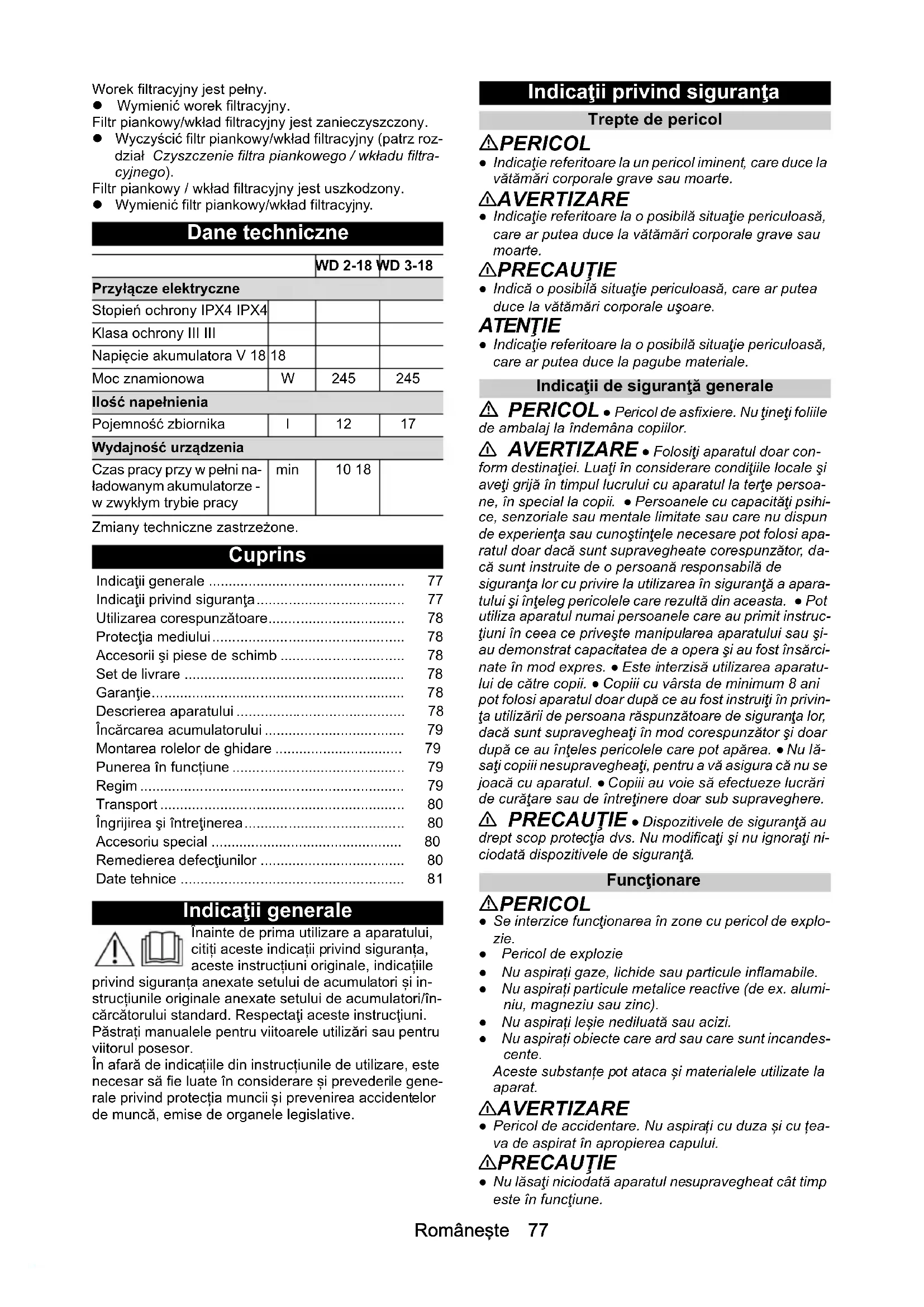 - Urządzenie samoczynnie się wyłącza Urządzenie / zestaw akumulatorów są przegrzane. Poczekać , aż urządzenie / zestaw akumulatorów ostygnie. Zmniejszająca się moc ssania Akcesoria, wąż ssący lub rury ssące są zatkane. Udrożnić przy pomocy odpowiedniego środka po- mocniczego.Româneşte 77 Worek filtracyjny jest pełny. Wymienić worek filtracyjny. Filtr piankowy/wkład filtracyjny jest zanieczyszczony. Wyczyścić filtr piankowy/wkład filtracyjny (patrz roz- dział Czyszczenie filtra piankowego / wkładu filtra- cyjnego). Filtr piankowy / wkład filtracyjny jest uszkodzony. Wymienić filtr piankowy/wkład filtracyjny. Dane techniczne Zmiany techniczne zastrzeżone. Cuprins Indicaţii generale Înainte de prima utilizare a aparatului, citiți aceste indicații privind siguranța, aceste instrucțiuni originale, indicațiile privind siguranța anexate setului de acumulatori și in- strucțiunile originale anexate setului de acumulatori/în- cărcătorului standard. Respectaţi aceste instrucţiuni. Păstrați manualele pentru viitoarele utilizări sau pentru viitorul posesor. În afară de indicațiile din instrucțiunile de utilizare, este necesar să fie luate în considerare și prevederile gene- rale privind protecția muncii și prevenirea accidentelor de muncă, emise de organele legislative. Indicaţii privind siguranţa Trepte de pericol PERICOL ● Indicaţie referitoare la un pericol iminent, care duce la vătămări corporale grave sau moarte. 몇 AVERTIZARE ● Indicaţie referitoare la o posibilă situaţie periculoasă, care ar putea duce la vătămări corporale grave sau moarte. 몇 PRECAUŢIE ● Indică o posibilă situaţie periculoasă, care ar putea duce la vătămări corporale uşoare. ATENŢIE ● Indicaţie referitoare la o posibilă situaţie periculoasă, care ar putea duce la pagube materiale. Indicaţii de siguranţă generale PERICOL ● Pericol de asfixiere. Nu ţineţi foliile de ambalaj la îndemâna copiilor. 몇 AVERTIZARE ● Folosiţi aparatul doar con- form destinaţiei. Luaţi în considerare condiţiile locale şi aveţi grijă în timpul lucrului cu aparatul la terţe persoa- ne, în special la copii. ● Persoanele cu capacităţi psihi- ce, senzoriale sau mentale limitate sau care nu dispun de experienţa sau cunoştinţele necesare pot folosi apa- ratul doar dacă sunt supravegheate corespunzător, da- că sunt instruite de o persoană responsabilă de siguranţa lor cu privire la utilizarea în siguranţă a apara- tului şi înţeleg pericolele care rezultă din aceasta. ● Pot utiliza aparatul numai persoanele care au primit instruc- ţiuni în ceea ce priveşte manipularea aparatului sau şi- au demonstrat capacitatea de a opera şi au fost însărci- nate în mod expres. ● Este interzisă utilizarea aparatu- lui de către copii. ● Copiii cu vârsta de minimum 8 ani pot folosi aparatul doar după ce au fost instruiţi în privin- ţa utilizării de persoana răspunzătoare de siguranţa lor, dacă sunt supravegheaţi în mod corespunzător şi doar după ce au înţeles pericolele care pot apărea. ● Nu lă- saţi copiii nesupravegheaţi, pentru a vă asigura că nu se joacă cu aparatul. ● Copiii au voie să efectueze lucrări de curăţare sau de întreţinere doar sub supraveghere. 몇 PRECAUŢIE ● Dispozitivele de siguranţă au drept scop protecţia dvs. Nu modificaţi şi nu ignoraţi ni- ciodată dispozitivele de siguranţă. Funcţionare PERICOL ● Se interzice funcţionarea în zone cu pericol de explo- zie. ● Pericol de explozie ● Nu aspirați gaze, lichide sau particule inflamabile. ● Nu aspirați particule metalice reactive (de ex. alumi- niu, magneziu sau zinc). ● Nu aspirați leșie nediluată sau acizi. ● Nu aspirați obiecte care ard sau care sunt incandes- cente. Aceste substanțe pot ataca și materialele utilizate la aparat. 몇 AVERTIZARE ● Pericol de accidentare. Nu aspirați cu duza și cu țea- va de aspirat în apropierea capului. 몇 PRECAUŢIE ● Nu lăsaţi niciodată aparatul nesupravegheat cât timp este în funcţiune. WD 2-18 WD 3-18 Przyłącze elektryczne Stopień ochrony IPX4 IPX4 Klasa ochrony III III Napięcie akumulatora V 18 18 Moc znamionowa W 245 245 Ilość napełnienia Pojemność zbiornika l 12 17 Wydajność urządzenia Czas pracy przy w pełni na- ładowanym akumulatorze - w zwykłym trybie pracy min 10 18 Indicaţii generale p. 77