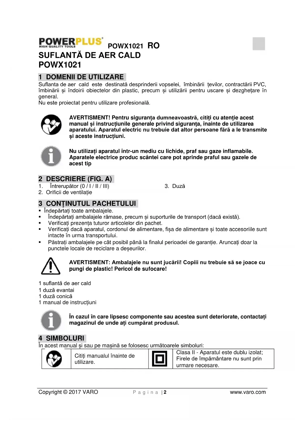 Aparatul poate fi utilizat și fix. Așezați aparatul pe bancul de lucru. Fixați cablul pentru a evita tragerea aparatului de pe bancul de lucru. Porniți cu atenție aparatul. Nu orientați niciodată duza către dvs. sau către alte persoane. Evitați căderea oricăror obiecte în interiorul duzei.POWX1021 RO Copyright © 2017 VARO P a g i n a | 7 www.varo.com