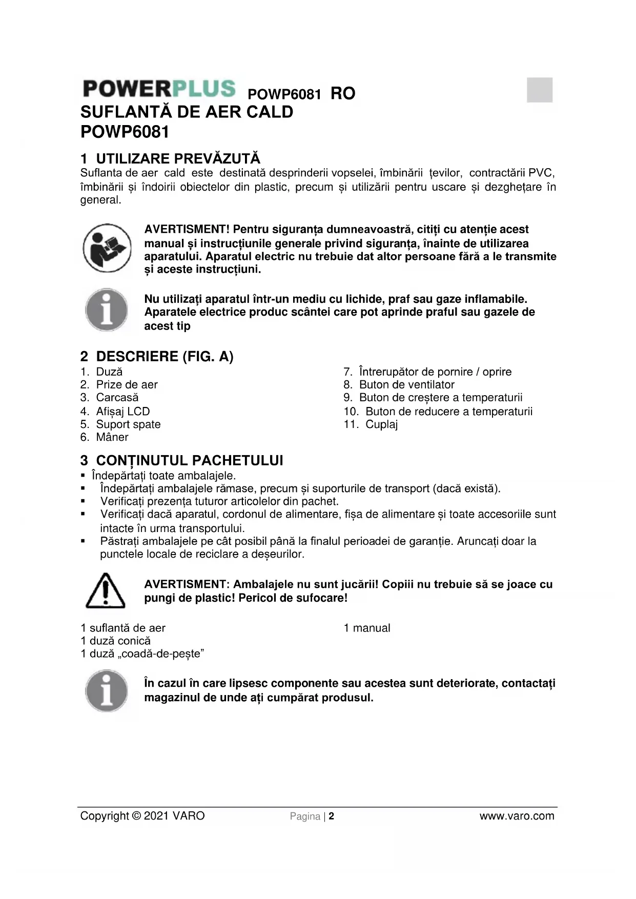 - Scula nedemontată trebuie înapoiată comerciantului într-o stare acceptabilă de curățenie, (în cutia sa originală dacă e cazul) și împreună cu dovada cumpărării. 13 MEDIU În cazul în care aparatul trebuie înlocuit după utilizare intensă, nu îl aruncați laolaltă cu gunoiul menajer, ci depozitați-l într-un mod sigur pentru mediu. Deșeurile produse de părți ale mașinilor electrice nu trebuie manipulate la fel cu gunoiul menajer. Reciclați atunci când există această posibilitate, Pentru recomandări privind reciclarea, consultați autoritățile locale sau magazinul de achiziție.POWP6081 PL Copyright © 2021 VARO NV Strona | 1 www.varo.com 1 PRZEZNACZENIE ............................................................................. 2