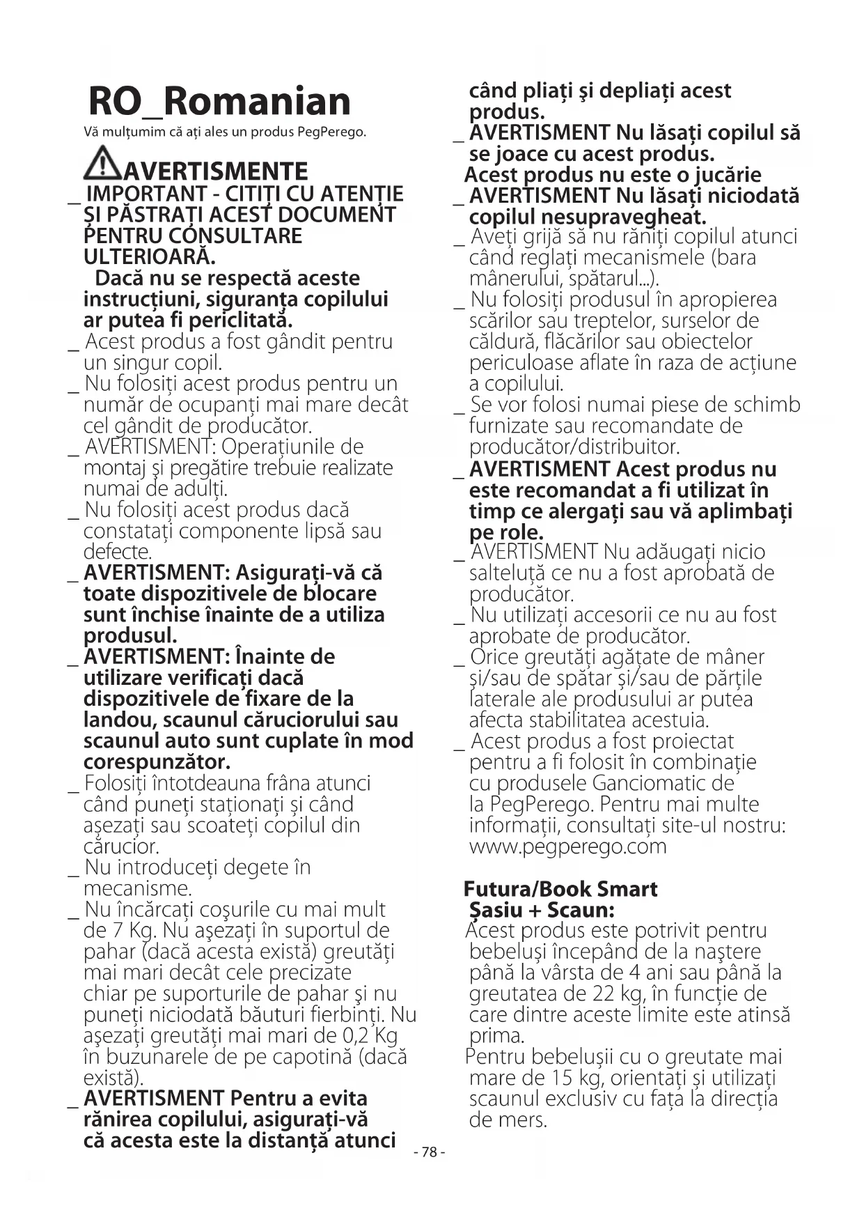 PENTRU CONSULTARE ULTERIOARĂ. Dacă nu se respectă aceste instrucţiuni, siguranţa copilului ar putea fi periclitată. _ Acest produs a fost gândit pentru un singur copil. _ Nu folosiţi acest produs pentru un număr de ocupanţi mai mare decât cel gândit de producător. _ AVERTISMENT: Operaţiunile de montaj şi pregătire trebuie realizate numai de adulţi. _ Nu folosiţi acest produs dacă constatați componente lipsă sau defecte. _ AVERTISMENT: Asiguraţi-vă că toate dispozitivele de blocare sunt închise înainte de a utiliza produsul. _ AVERTISMENT: Înainte de utilizare verificaţi dacă dispozitivele de fixare de la landou, scaunul căruciorului sau scaunul auto sunt cuplate în mod corespunzător. _ Folosiţi întotdeauna frâna atunci când puneţi staționați și când așezați sau scoateţi copilul din cărucior. _ Nu introduceţi degete în mecanisme. _ Nu încărcaţi coşurile cu mai mult de 7 Kg. Nu aşezaţi în suportul de pahar (dacă acesta există) greutăţi mai mari decât cele precizate chiar pe suporturile de pahar şi nu puneţi niciodată băuturi fierbinţi. Nu aşezaţi greutăţi mai mari de 0,2 Kg în buzunarele de pe capotină (dacă există). _ AVERTISMENT Pentru a evita rănirea copilului, asiguraţi-vă că acesta este la distanţă atunci când pliaţi şi depliaţi acest produs. _ AVERTISMENT Nu lăsați copilul să se joace cu acest produs. Acest produs nu este o jucărie _ AVERTISMENT Nu lăsaţi niciodată copilul nesupravegheat. _ Aveţi grijă să nu răniţi copilul atunci când reglaţi mecanismele (bara mânerului, spătarul...). _ Nu folosiţi produsul în apropierea scărilor sau treptelor, surselor de căldură, flăcărilor sau obiectelor periculoase aflate în raza de acţiune a copilului. _ Se vor folosi numai piese de schimb furnizate sau recomandate de producător/distribuitor. _ AVERTISMENT Acest produs nu este recomandat a fi utilizat în timp ce alergaţi sau vă aplimbaţi pe role. _ AVERTISMENT Nu adăugaţi nicio salteluţă ce nu a fost aprobată de producător. _ Nu utilizați accesorii ce nu au fost aprobate de producător. _ Orice greutăţi agăţate de mâner și/sau de spătar și/sau de părțile laterale ale produsului ar putea afecta stabilitatea acestuia. _ Acest produs a fost proiectat pentru a fi folosit în combinaţie cu produsele Ganciomatic de la PegPerego. Pentru mai multe informații, consultați site-ul nostru: www.pegperego.com Futura/Book Smart Șasiu + Scaun: Acest produs este potrivit pentru bebeluși începând de la naştere până la vârsta de 4 ani sau până la greutatea de 22 kg, în funcție de care dintre aceste limite este atinsă prima. Pentru bebelușii cu o greutate mai mare de 15 kg, orientați și utilizați scaunul exclusiv cu fața la direcția de mers.- 79 - _ AVERTISMENT: Utilizaţi întotdeauna sistemul de prindere. Folosiţi întotdeauna centura de siguranţă în cinci puncte. Fixați întotdeauna centura din talie de centura dintre picioare. _ Bara frontală nu a fost proiectată pentru a susţine greutatea copilului; bara frontală nu a fost proiectată pentru a ridica scaunul împreună cu greutatea copilului. Bara frontală nu înlocuieşte centura scaunului. _ Pentru bebeluşii nou-născuţi se recomandă folosirea spătarului în cea mai joasă poziţie. _ AVERTISMENT: nu folosiţi husa de ploaie (dacă există) în spaţii închise şi verificaţi cu regularitate dacă copilului nu îi este prea cald; nu lăsați căruciorul în apropierea surselor de căldură şi mențineți distanţa faţă de ţigări aprinse. Husa de ploaie nu trebuie folosită pe un cărucior fără capotină sau parasolar de care să se poată prinde. Folosiţi husa de ploaie numai sub supravegherea unui adult. Asiguraţi-vă că husa de ploaie nu obstrucţionează niciun mecanism în mişcare al șasiului sau al căruciorului. Scoateţi întotdeauna husa de ploaie înainte de a plia şasiul sau căruciorul. Șasiul + Scaunul auto Futura/Book Smart: este aprobat pentru copii de la naștere până la greutatea de 13 kg. Atunci când este folosit în combinaţie cu scaunul auto, acest produs nu înlocuieşte pătuţul sau patul. În cazul în care copilul vrea să doarmă el trebuie aşezat într-un landou, pătuţ sau pat potrivit. Șasiul + Landoul Futura/Book Smart: este aprobat pentru copii de la naștere până la greutatea de 9 kg. Atunci când este folosit în combinaţie cu landoul: acest produs este potrivit pentru un copil care nu poate sta singur în şezut, nu se poate rostogoli şi nu se poate împinge în sus sprijinindu- se în mâini şi genunchi. Greutatea maximă a copilului: 9 kg. Mânerul de transport (dacă există) trebuie lăsat în afara landoului, în așa fel încât copilul să nu ajungă la el în timpul utilizării acestuia. Imaginile care fac referire la detaliile textilelor pot conține diferențe față de colecția achiziționată. Pentru mai multe informații, consultați site-ul nostru: www.pegperego.com INSTRUCȚIUNI ȘASIUL Futura/Book Smart 1 DEPLIEREA: Înainte de a deplia cadrul, îndepărtaţi toate separatoarele din carton (fără a folosi lame). AVERTISMENT: _ NU TRAGEŢI ŞI NU FORŢAŢI ELEMENTUL DE PRINDERE PESTE LIMITĂ. _ NU FOLOSIŢI CÂRLIGUL DE BLOCARE CA AGĂŢĂTOARE PENTRU GREUTĂŢI. NU AGĂŢAŢI SACOŞE SAU ALTE ACCESORII DE ACEST ELEMENT. Apăsaţi în jos elementul de fixare lateral, apucaţi cu mâna secţiunea superioară a mânerului şi rotiţi-l către dumneavoastră până când cadrul este complet depliat(fig._a). Depliaţi cadrul (fig_b). Cadrul este corect depliat atunci când auziţi un click de la dispozitivul de prindere de la baza lui, aşa cum se arată în figură. AVERTISMENT: Când aşezaţi scaunul pe cadru, apăsaţi scaunul în jos pentru a vă asigura că se fixează bine pe bază. 2 MONTAJUL ROŢILOR: Introduceţi axele verticale în orificiul destinat roţilor din spate (fig_a), având grijă să fie aşezate cu fa