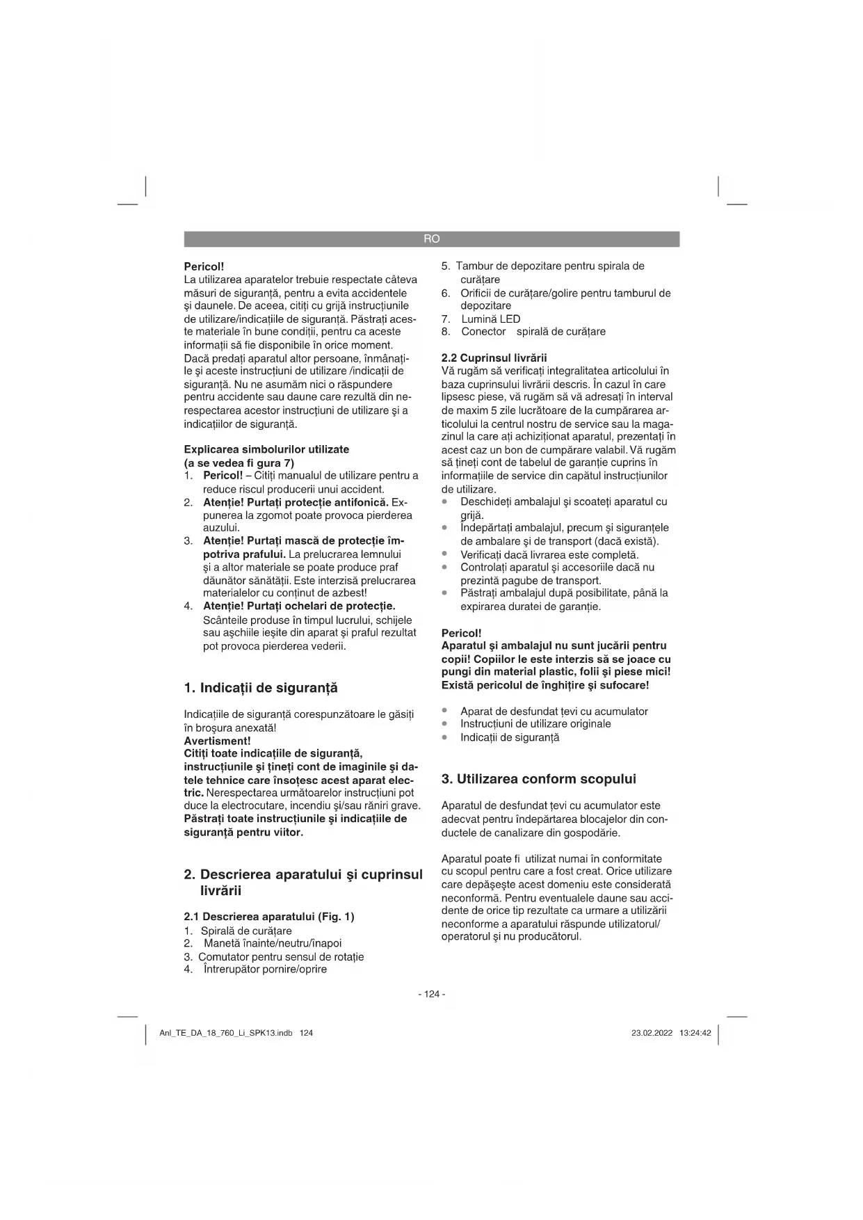 Aparatul de desfundat ţevi cu acumulator este adecvat pentru îndepărtarea blocajelor din con- ductele de canalizare din gospodărie. Aparatul poate fi utilizat numai în conformitate cu scopul pentru care a fost creat. Orice utilizare care depăşeşte acest domeniu este considerată neconformă. Pentru eventualele daune sau acci- dente de orice tip rezultate ca urmare a utilizării neconforme a aparatului răspunde utilizatorul/ operatorul şi nu producătorul. Anl_TE_DA_18_760_Li_SPK13.indb 124Anl_TE_DA_18_760_Li_SPK13.indb 124 23.02.2022 13:24:4223.02.2022 13:24:42RO